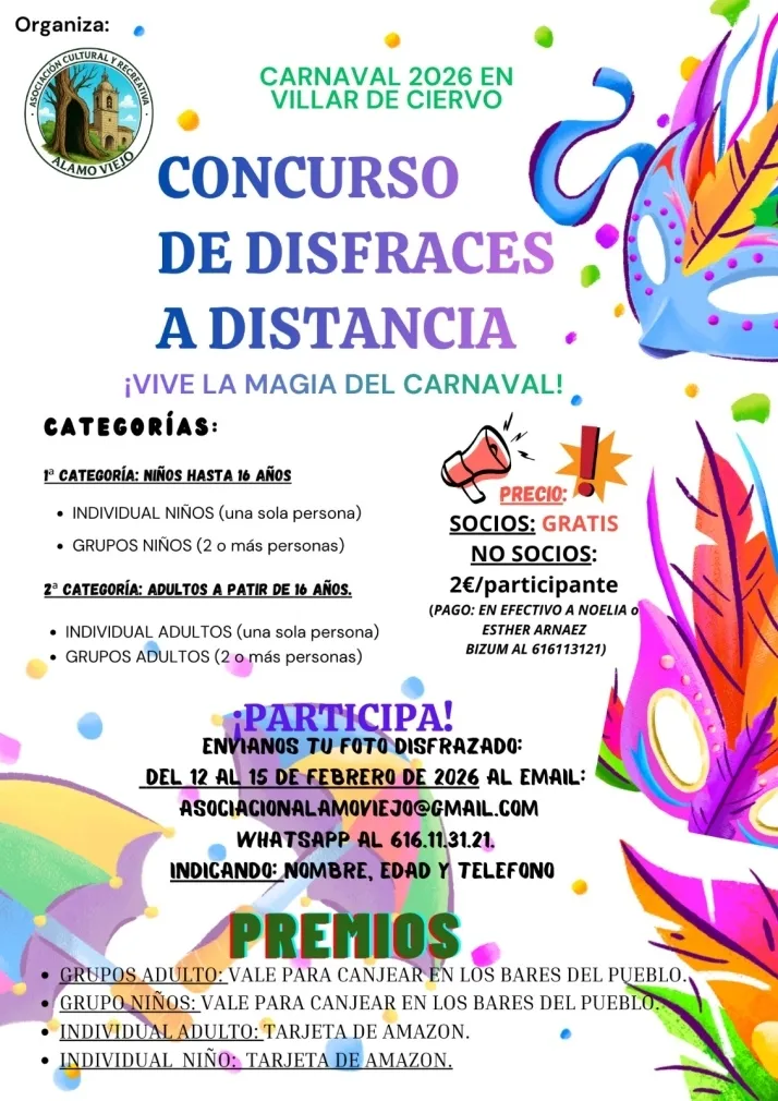 La Asociación Cultural Álamo Viejo de Villar de Ciervo organiza un concurso de disfraces en formato online para el Carnaval 2026, en el que los participantes podrán enviar fotografías de sus disfraces del 12 al 15 de febrero por correo electrónico o WhatsApp, con categorías infantil y adulta, tanto individual como grupal, y distintos premios para cada categoría.