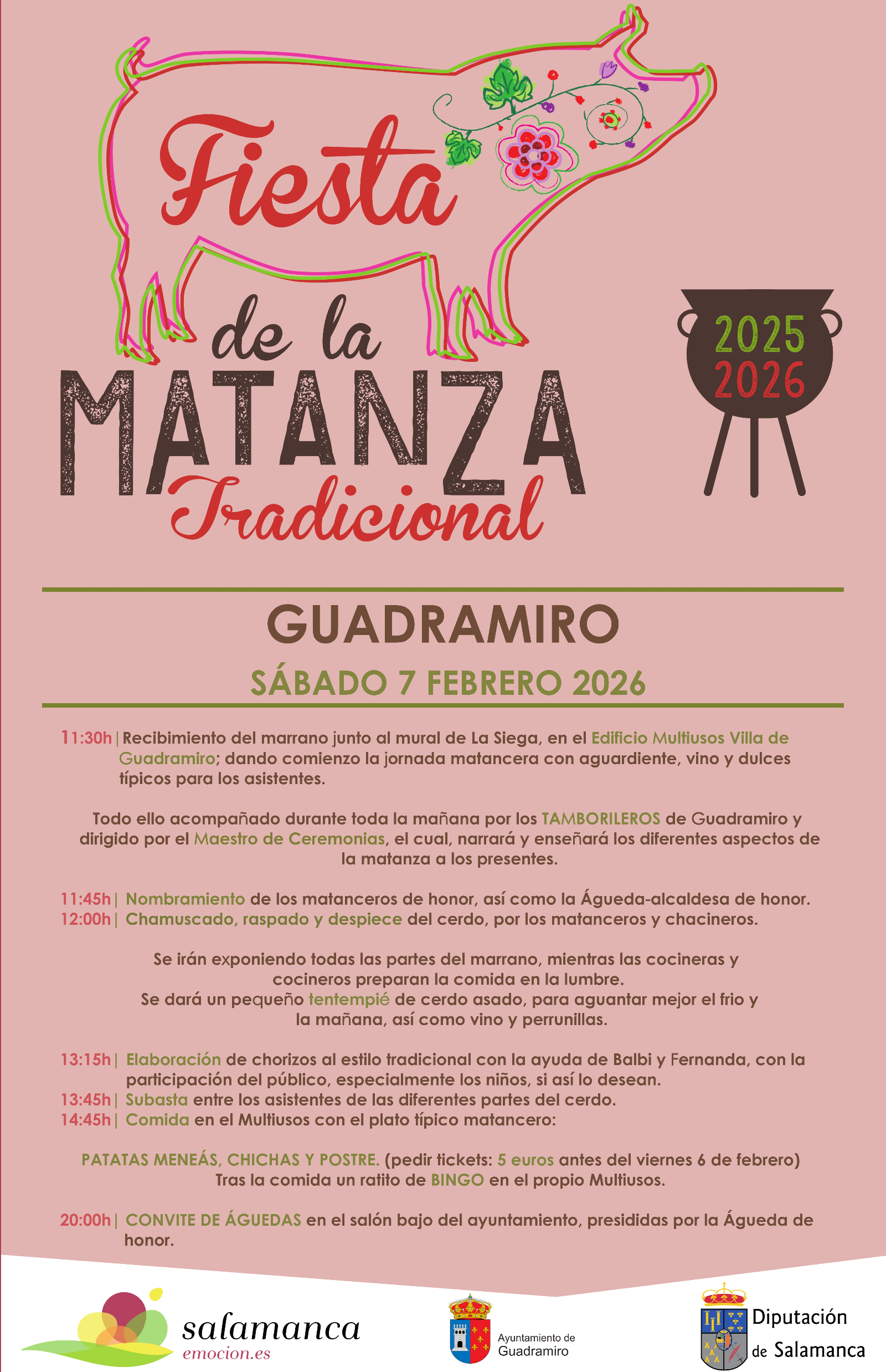 La localidad de Guadramiro celebrará su tradicional Fiesta de la Matanza el sábado 7 de febrero de 2026. El programa incluye el despiece del cerdo, la elaboración de chorizos, una subasta y una comida popular con un menú típico por 5 euros. La jornada, amenizada por tamborileros, está organizada por el Ayuntamiento con la colaboración de la Diputación de Salamanca.