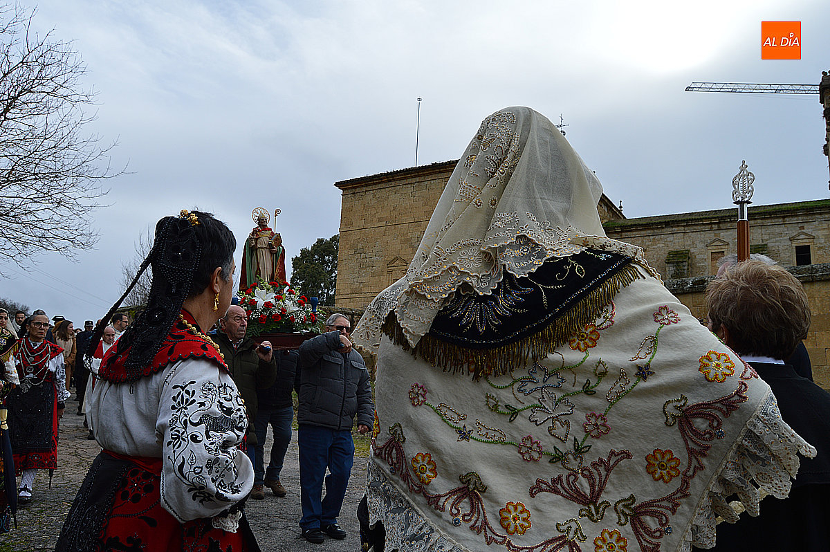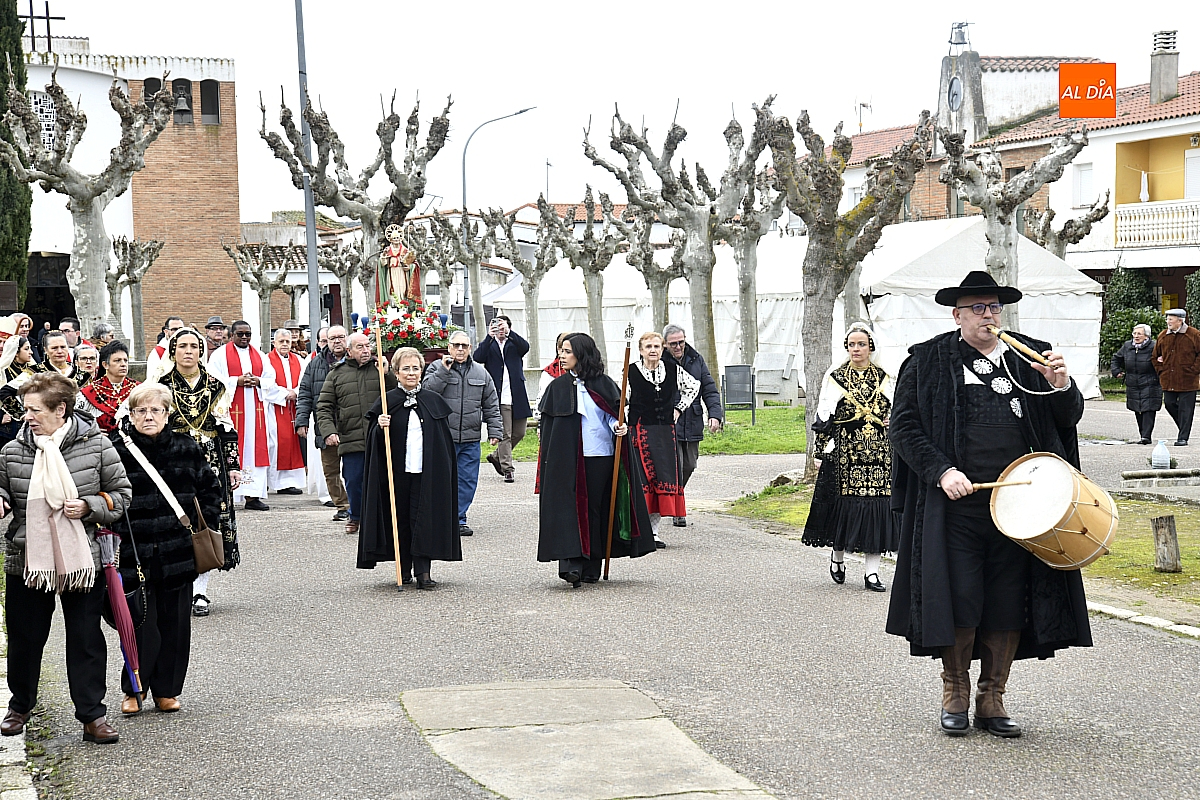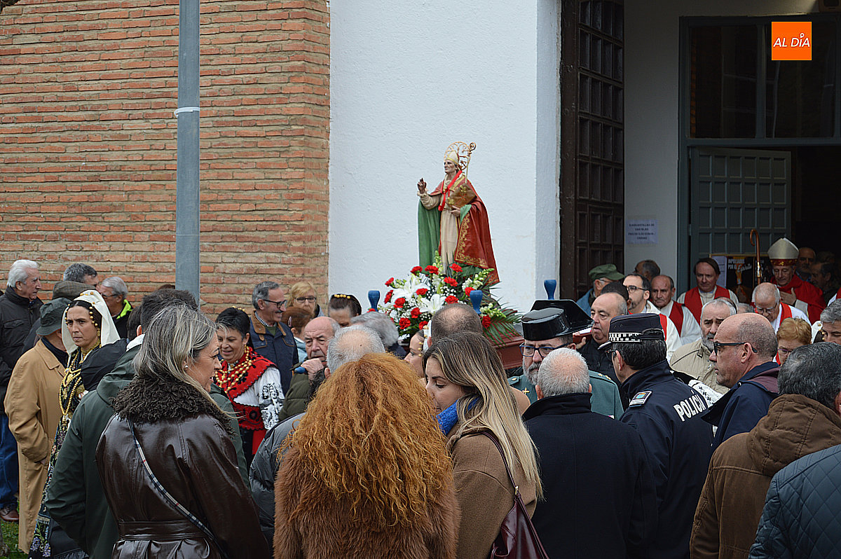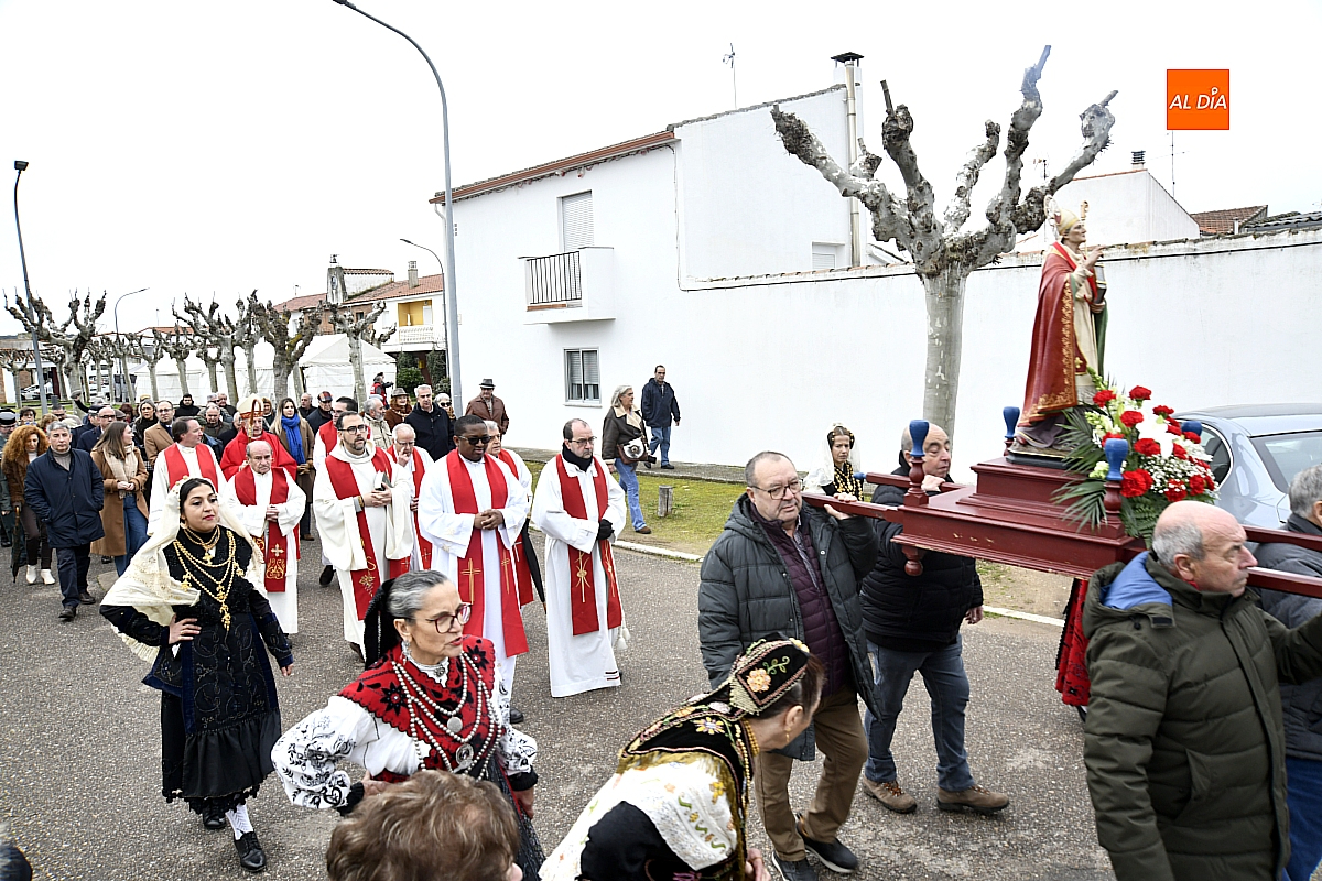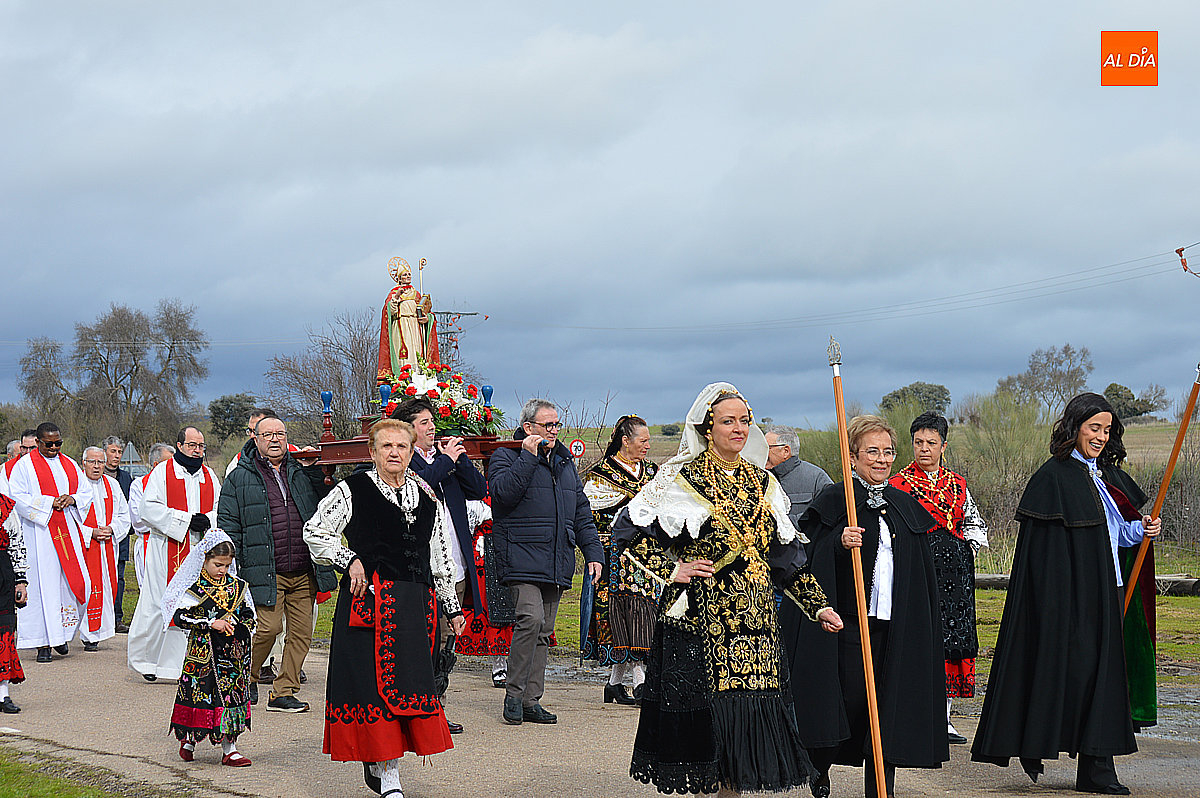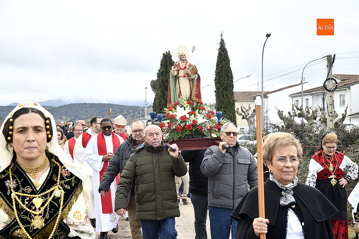La procesión ha estado amenizada por un tamborilero y ha sido encabezada por dos monaguillos portando el estandarte, seguidos de las mayordomas de este año, Maribel Malmierca y Soledad Sánchez. Junto a ellas han participado varias mujeres ataviadas con el traje charro, reforzando el carácter cultural y tradicional de la celebración. A continuación, ha procesionado la imagen de San Blas, seguida de la comitiva religiosa, presidida por el obispo de la diócesis, Mons. José Luis Retana, y acompañada por párrocos de la zona.