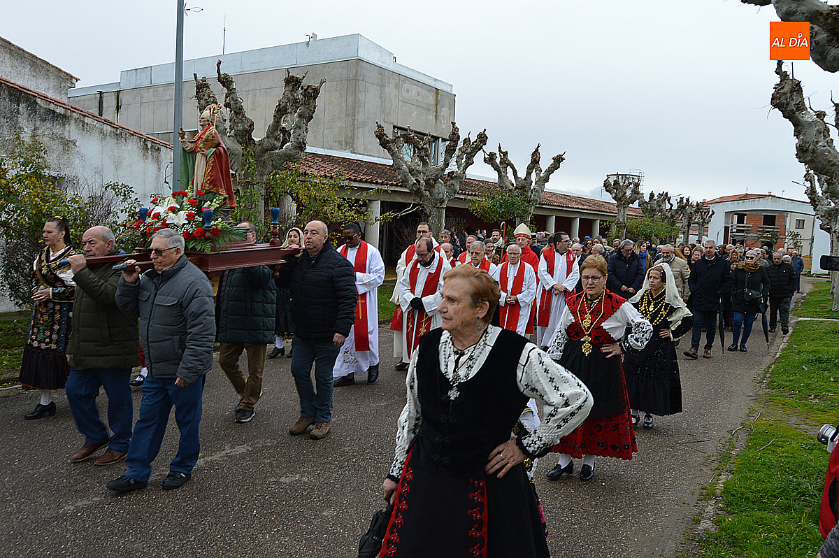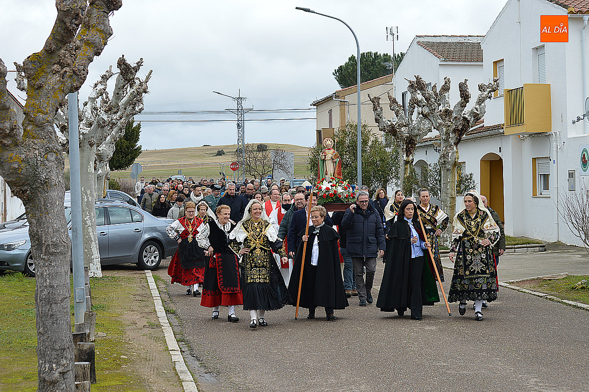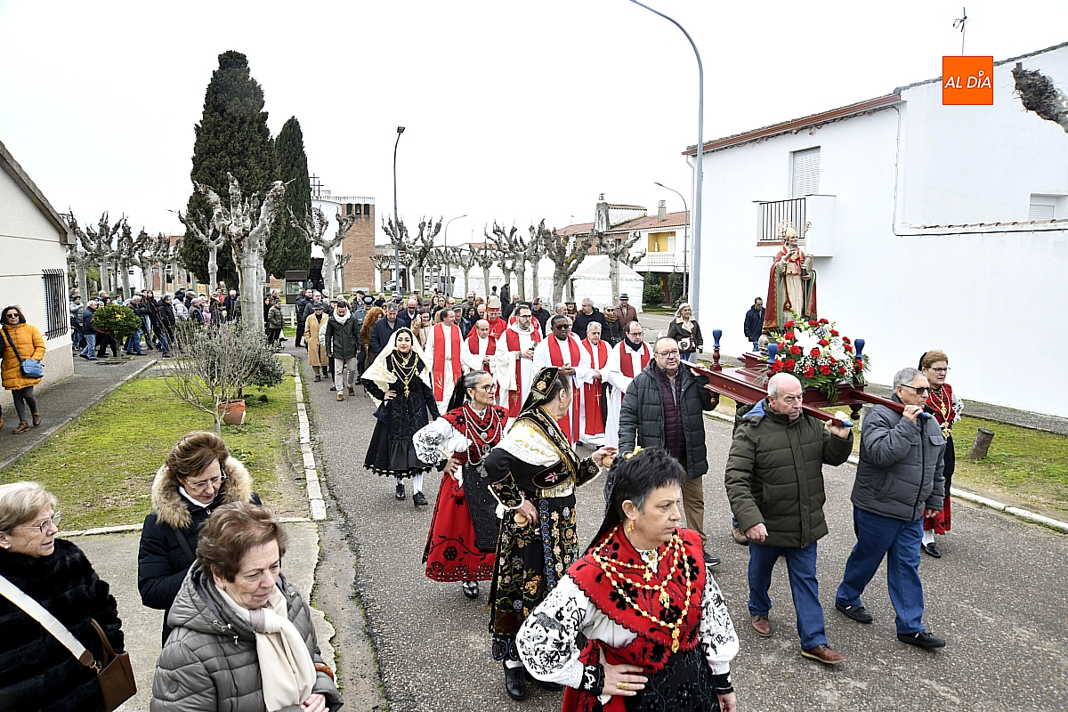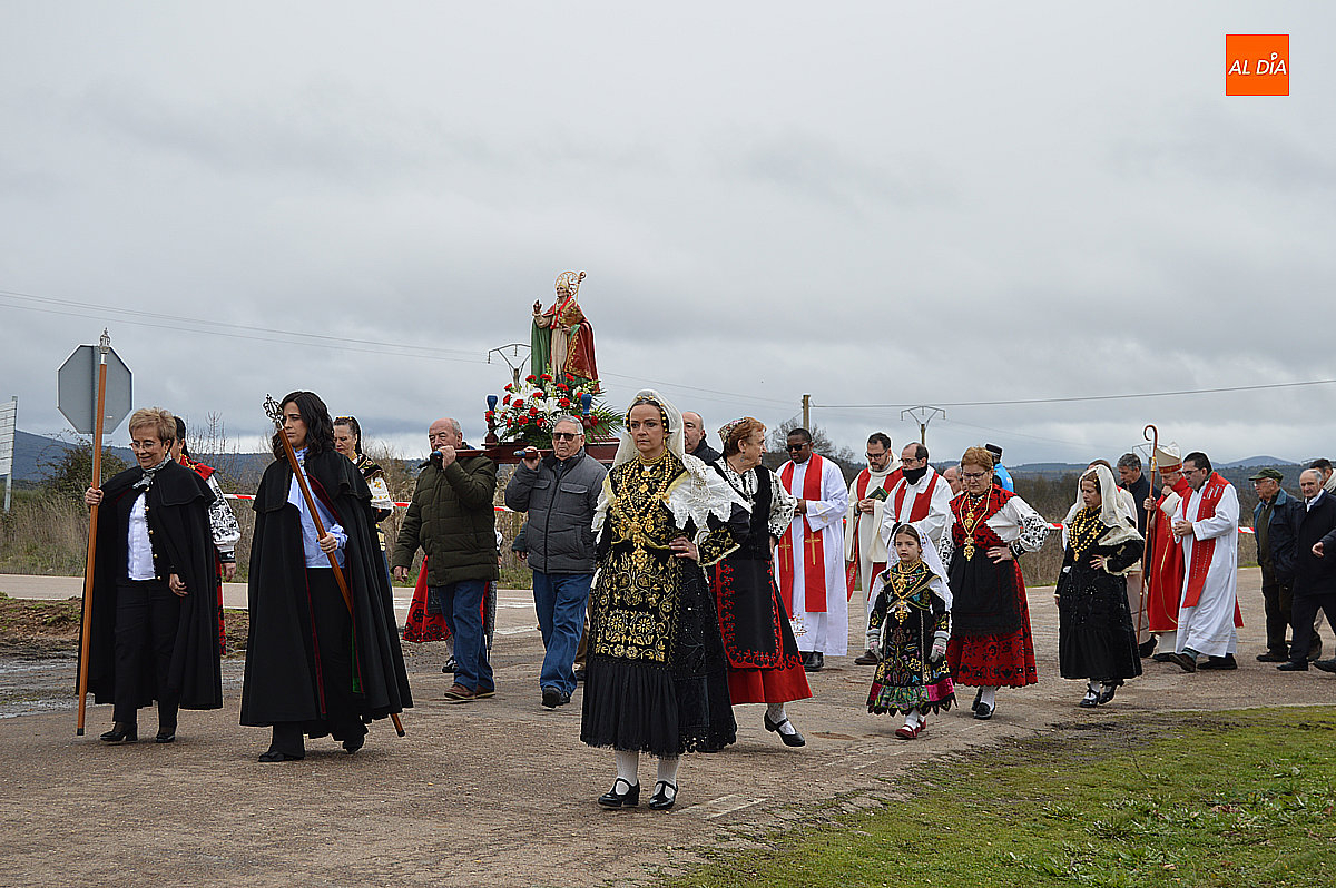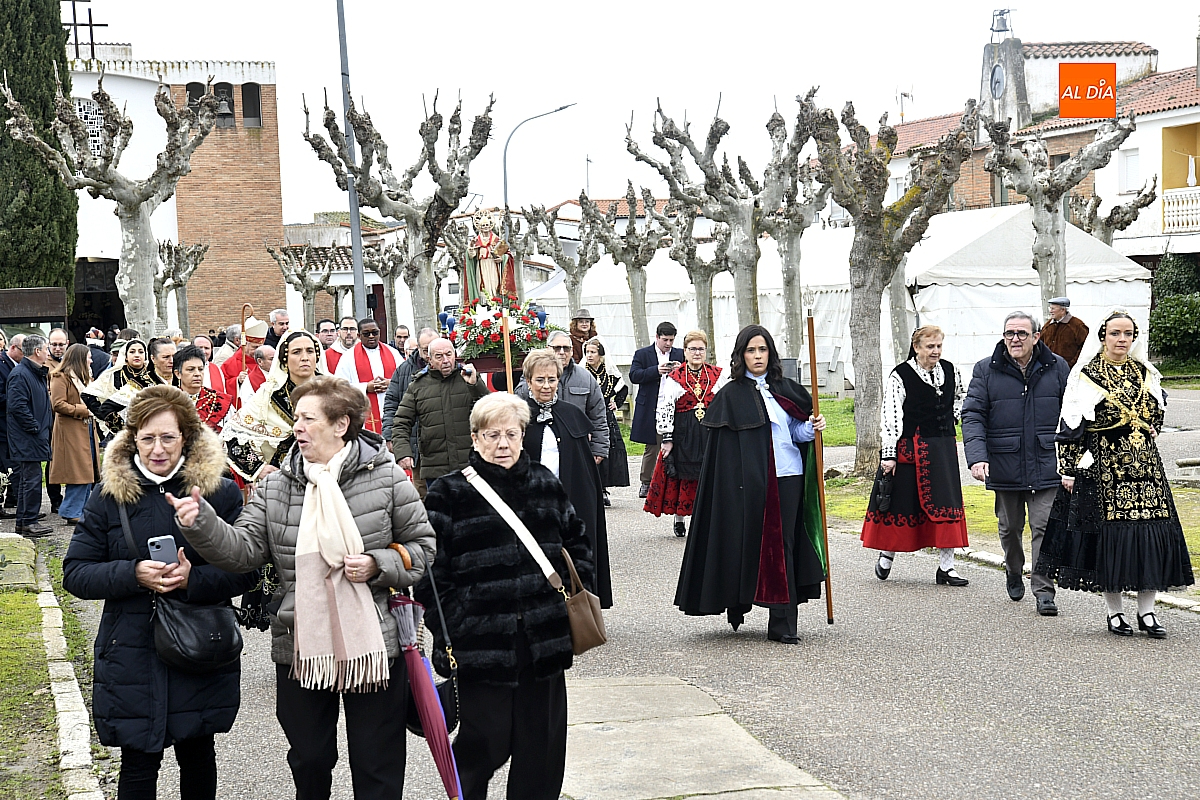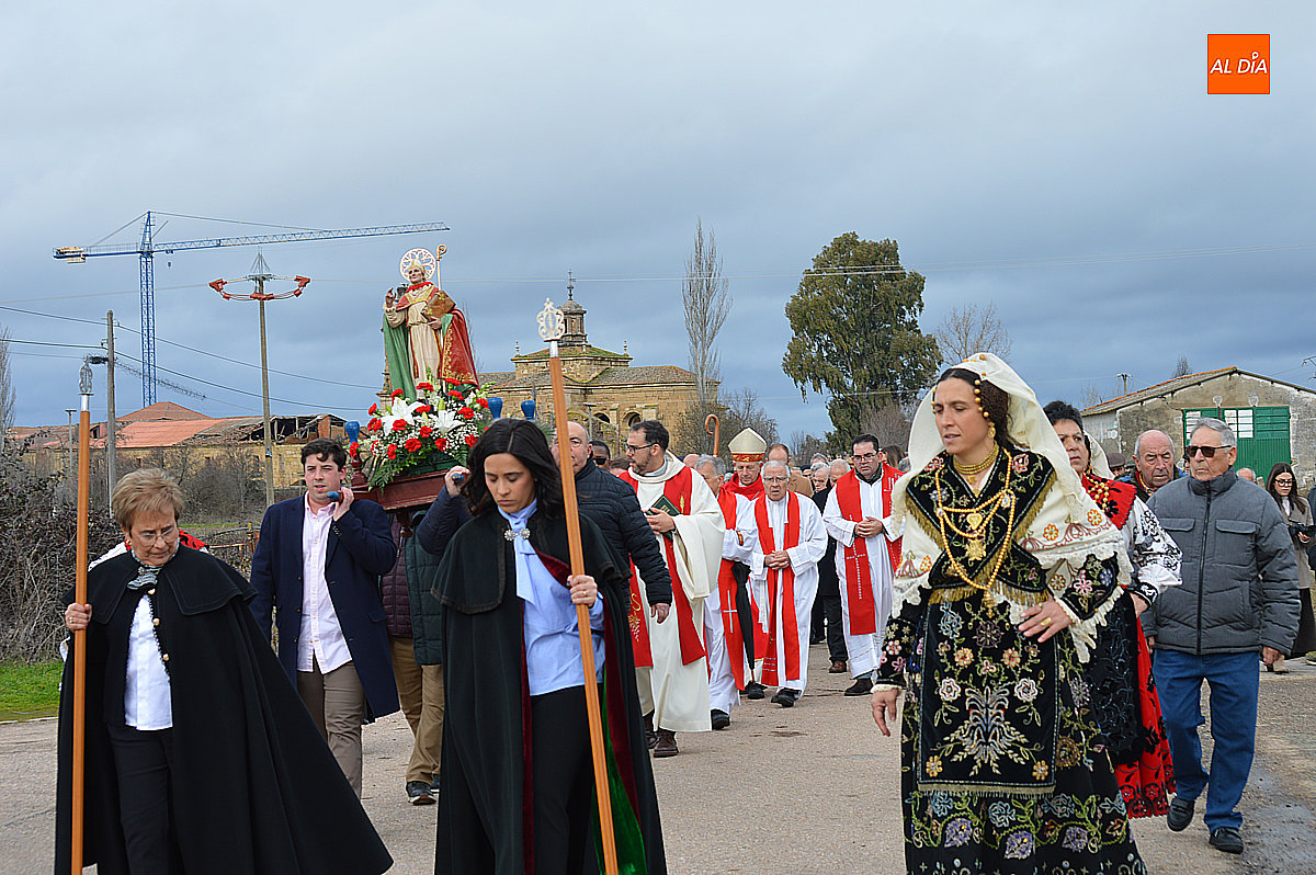 La procesión ha estado amenizada por un tamborilero y ha sido encabezada por dos monaguillos portando el estandarte, seguidos de las mayordomas de este año, Maribel Malmierca y Soledad Sánchez. Junto a ellas han participado varias mujeres ataviadas con el traje charro, reforzando el carácter cultural y tradicional de la celebración. A continuación, ha procesionado la imagen de San Blas, seguida de la comitiva religiosa, presidida por el obispo de la diócesis, Mons. José Luis Retana, y acompañada por párrocos de la zona.
