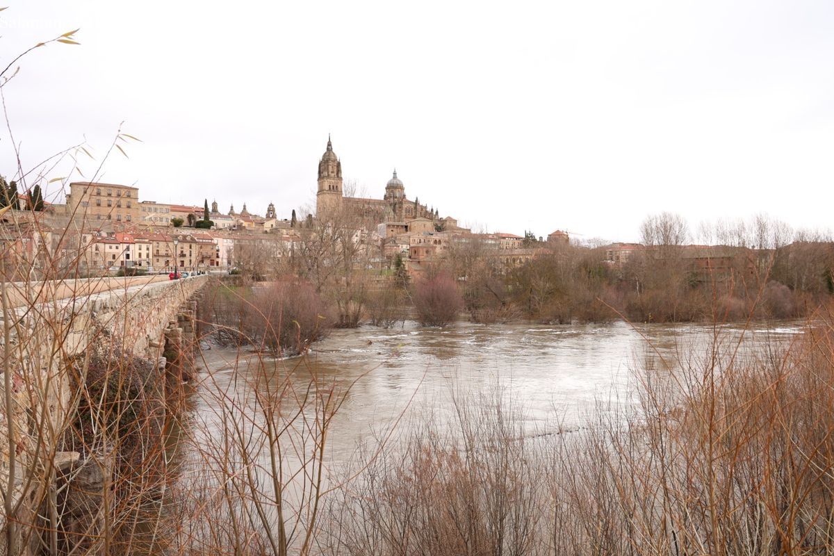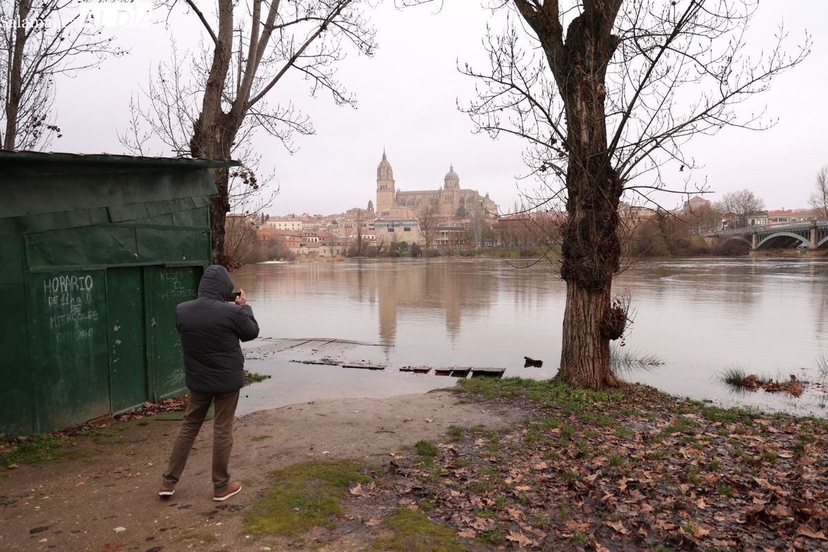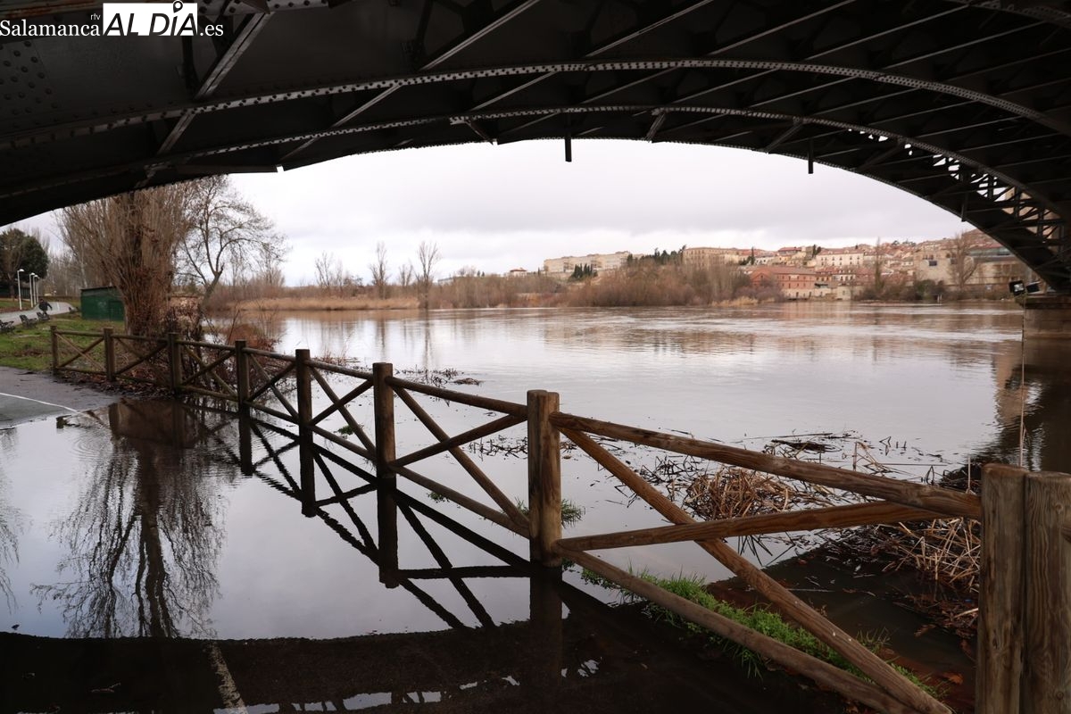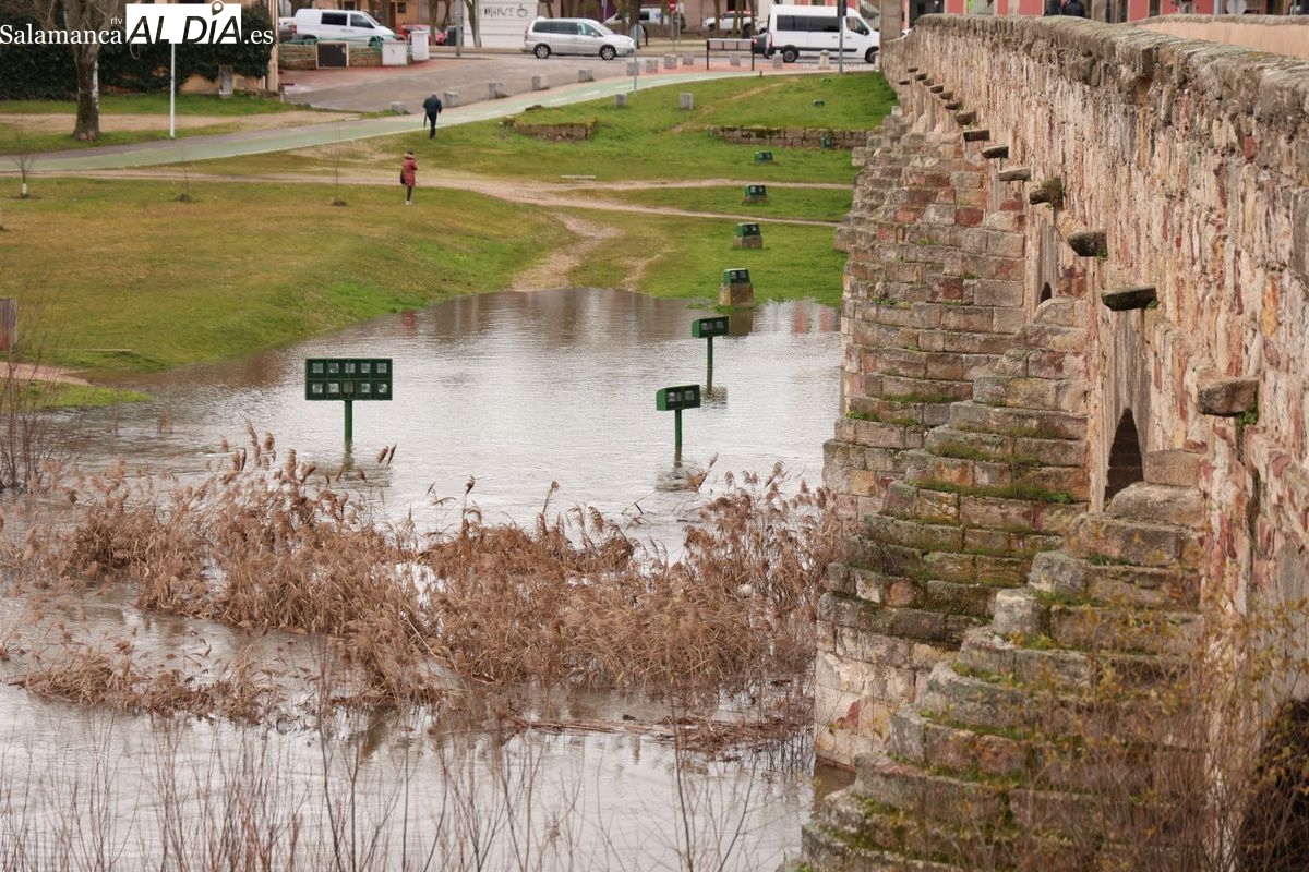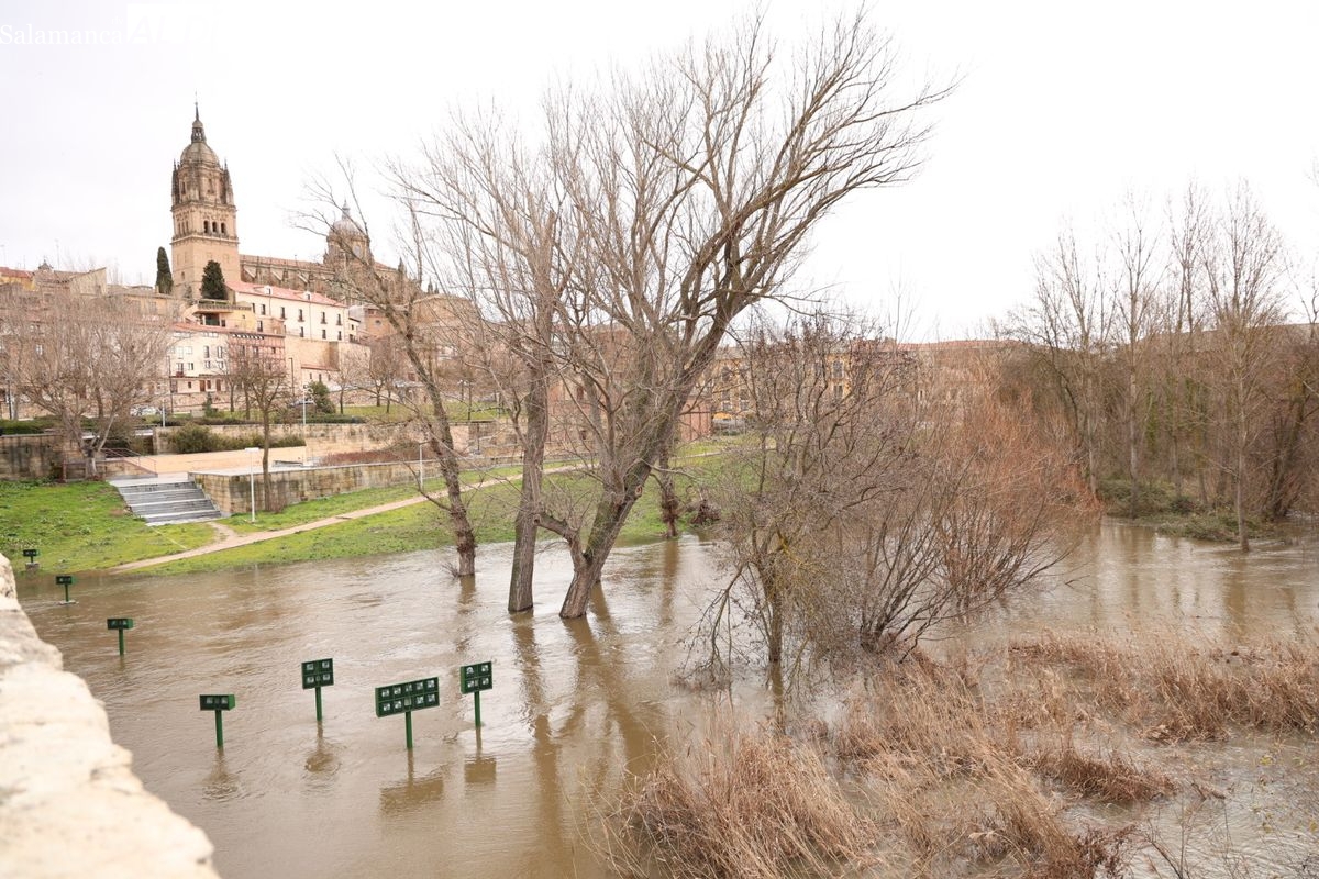 Las precipitaciones continuadas que han caído sobre la provincia de Salamanca en los últimos días han derivado en un notable aumento del nivel del agua en el río Tormes a su paso por la capital. El río ha ocupado las zonas inundables de los paseos fluviales y áreas recreativas cercanas a la orilla, transformando el paisaje habitual bajo el Puente Romano y en los accesos a la ribera, donde el agua ha reclamado parte del terreno transitable.