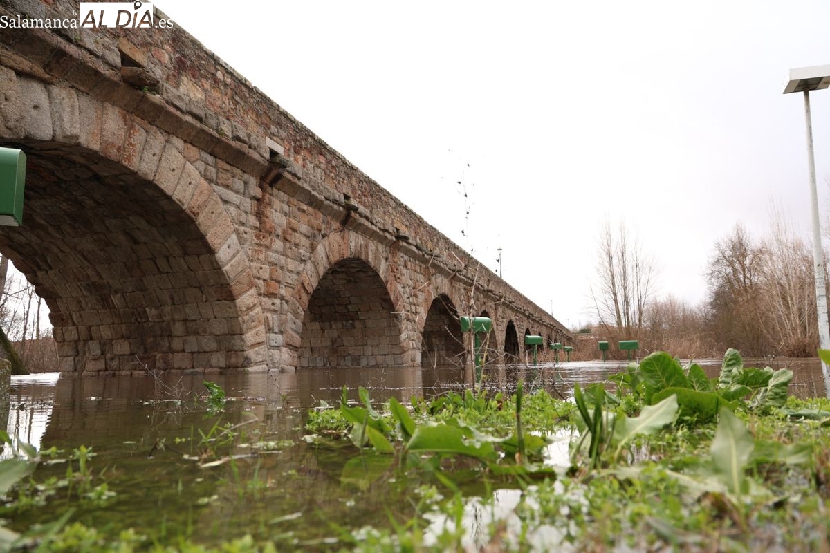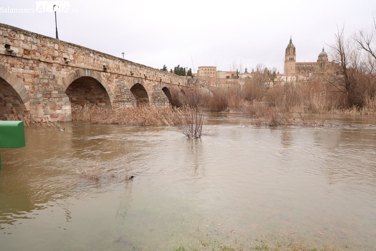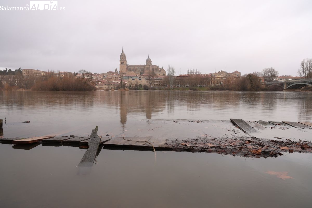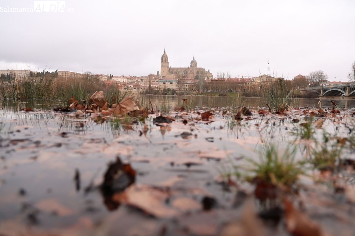 Las precipitaciones continuadas que han caído sobre la provincia de Salamanca en los últimos días han derivado en un notable aumento del nivel del agua en el río Tormes a su paso por la capital. El río ha ocupado las zonas inundables de los paseos fluviales y áreas recreativas cercanas a la orilla, transformando el paisaje habitual bajo el Puente Romano y en los accesos a la ribera, donde el agua ha reclamado parte del terreno transitable.