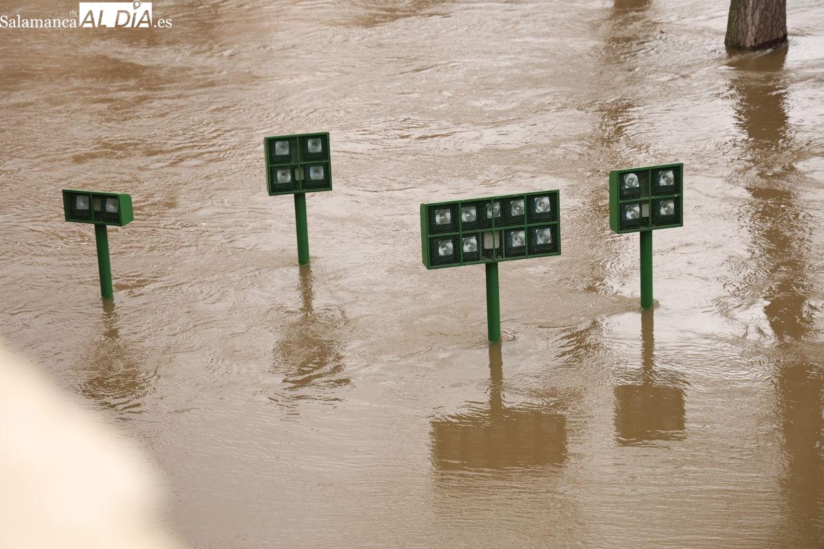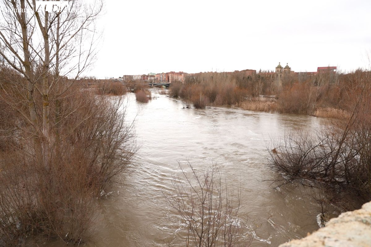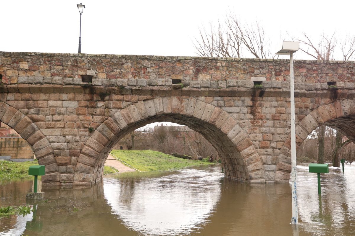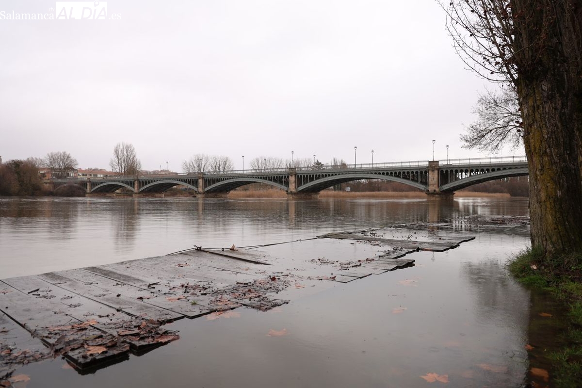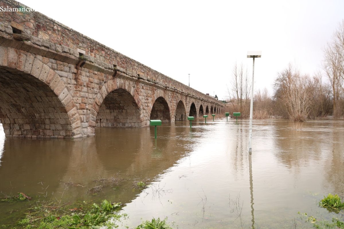 Las precipitaciones continuadas que han caído sobre la provincia de Salamanca en los últimos días han derivado en un notable aumento del nivel del agua en el río Tormes a su paso por la capital. El río ha ocupado las zonas inundables de los paseos fluviales y áreas recreativas cercanas a la orilla, transformando el paisaje habitual bajo el Puente Romano y en los accesos a la ribera, donde el agua ha reclamado parte del terreno transitable.