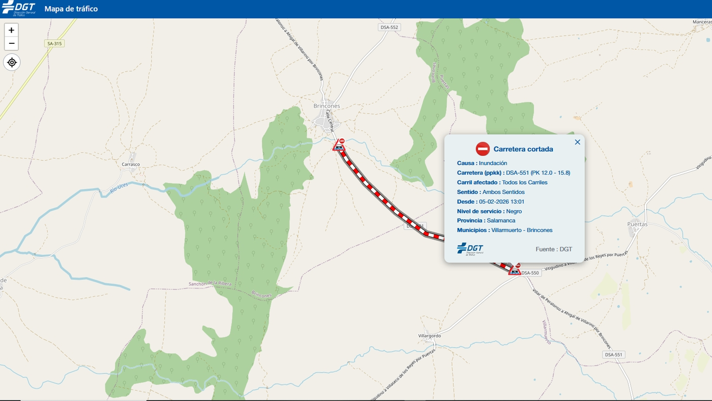 Las intensas lluvias registradas en las últimas horas han provocado el desbordamiento de la rivera de Brincones, obligando al corte total de la carretera DSA-551. Según informa la Dirección General de Tráfico (DGT), la vía se encuentra intransitable, lo que ha motivado la activación del nivel negro de servicio, impidiendo el paso a cualquier tipo de vehículo.