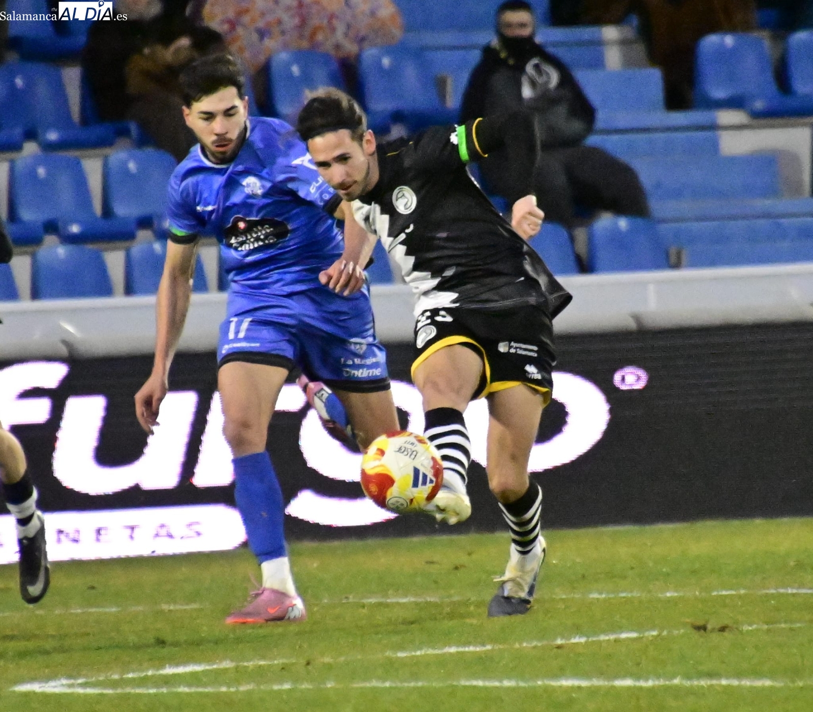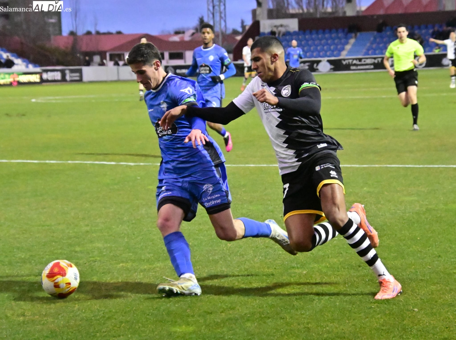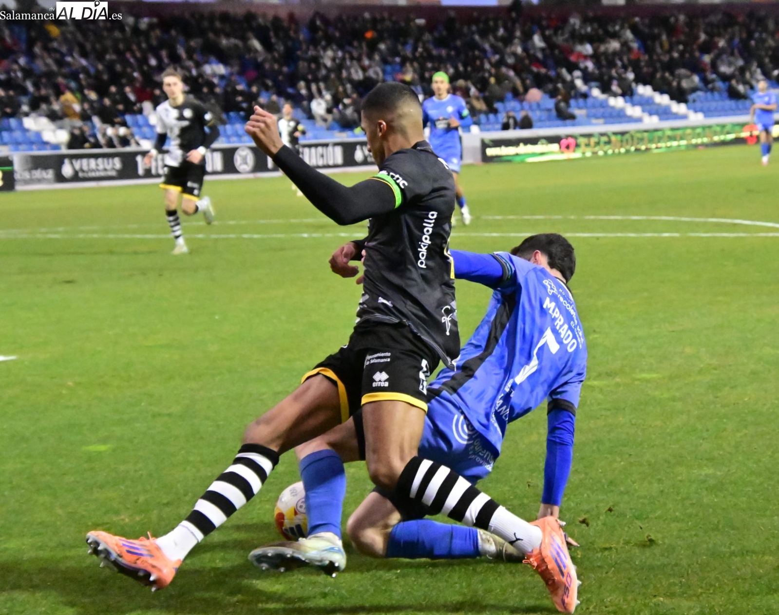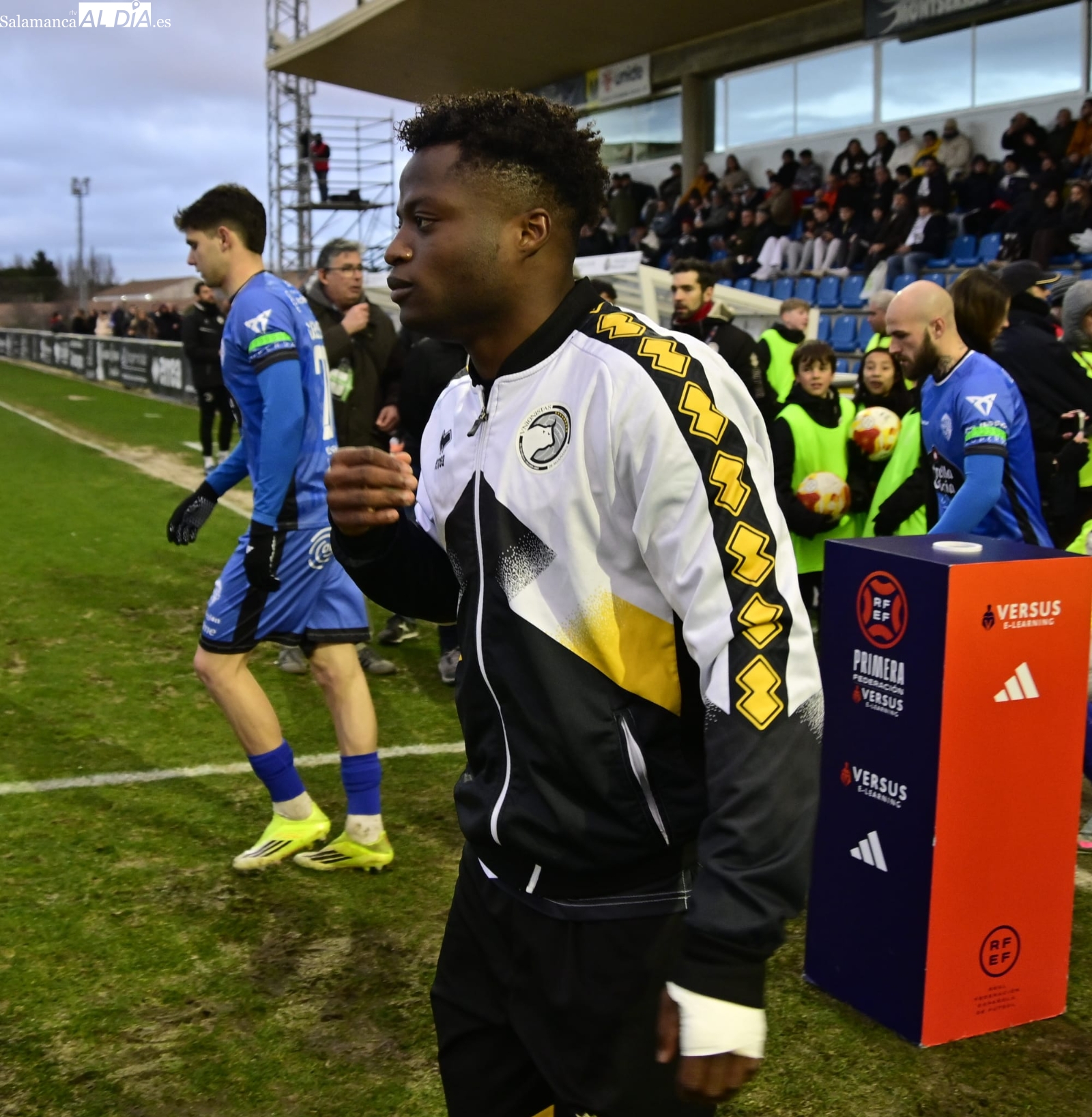 Con el balón en juego, la afición charra ha estado callada dos minutos como señal de protesta por los arbitrajes y luego ya ha empezado a animar. Entre tanto, el fútbol ha sido poco vistoso y con ocasiones de escaso peligro más allá de algún tiro de Enol Coto y Prado, pero ninguno de ellos le ha dado mayores problemas a Marco Coronas.