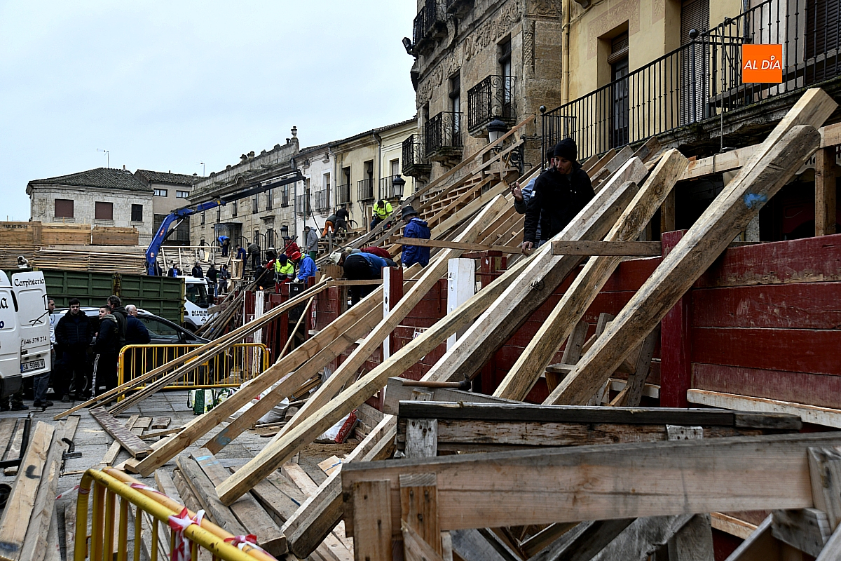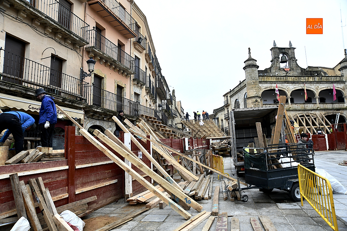 Ni la persistencia de la lluvia ha logrado frenar el pulso de la tradición. El coso taurino mirobrigense, arquitectura fugaz levantada a golpe de oficio y memoria, va cobrando forma en una carrera contra el tiempo y el mal tiempo. La construcción de los emblemáticos "tablaos" no solo no se detiene ante las inclemencias meteorológicas, sino que se acelera, adaptándose a cada respiro que concede el cielo.