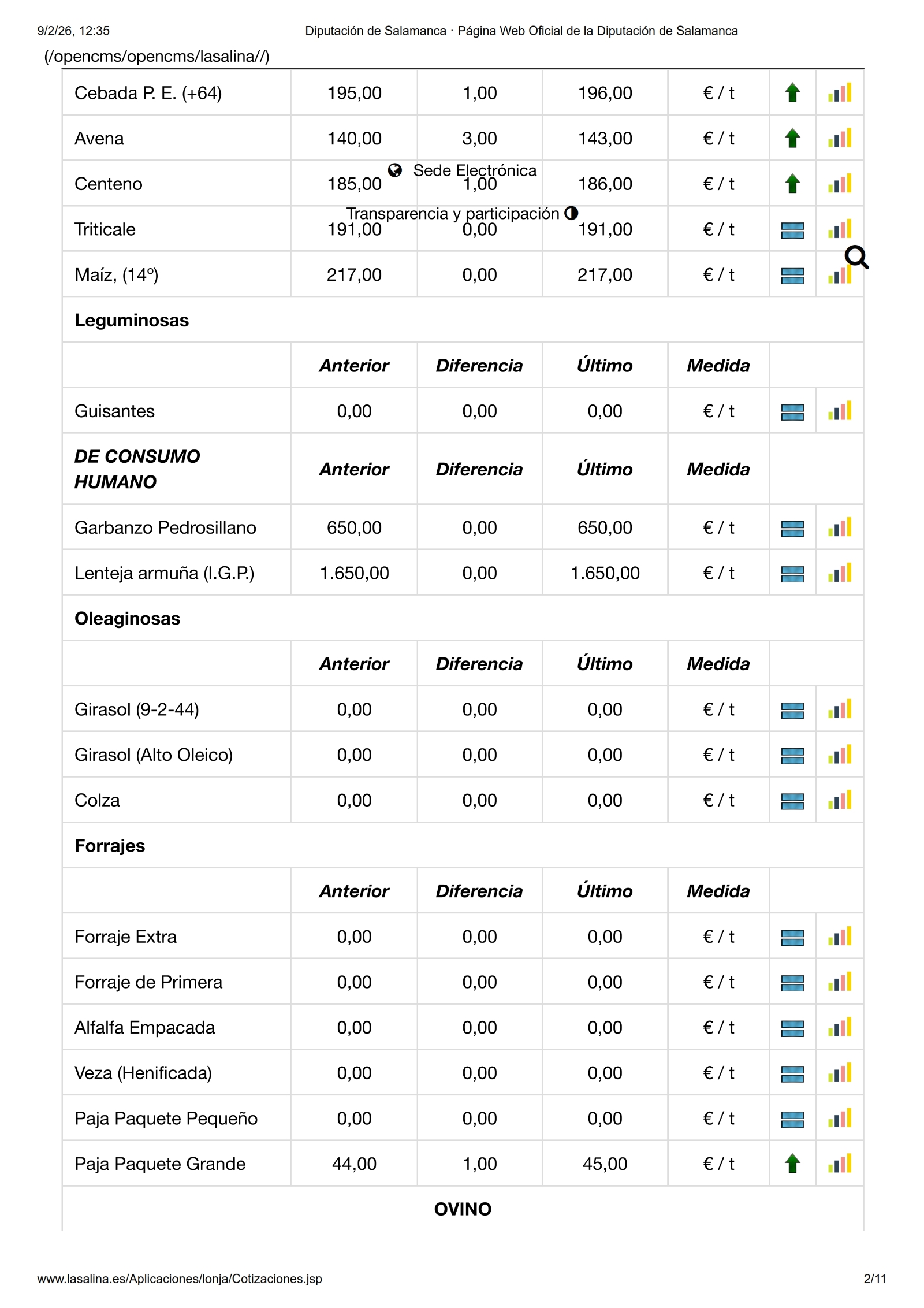 De este modo, en la Mesa de Cereal se acordó una subida de 3,00 €/t para la avena (143 €/t) y de 1,00 €/t para la cebada (196 €/t) y el centeno (186 €/t). También, en forrajes, sube 1,00 €/t el paquete grande paja, que se pone a 45 €/t.