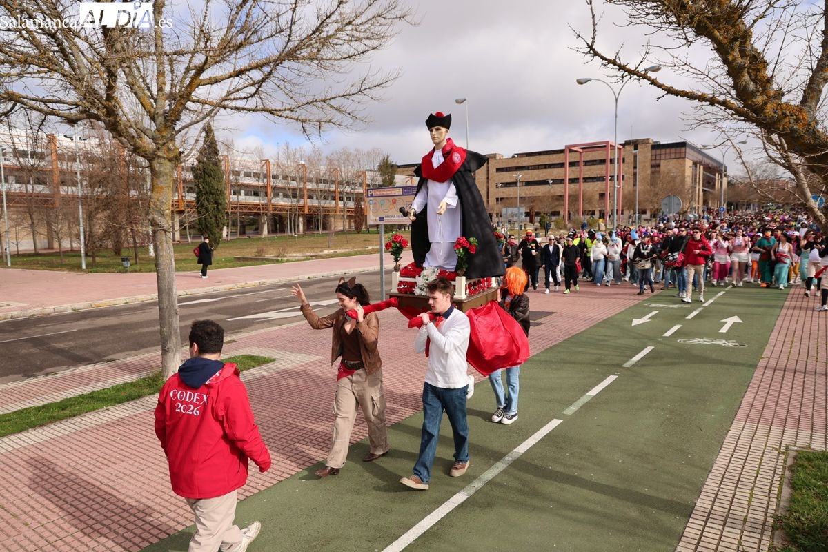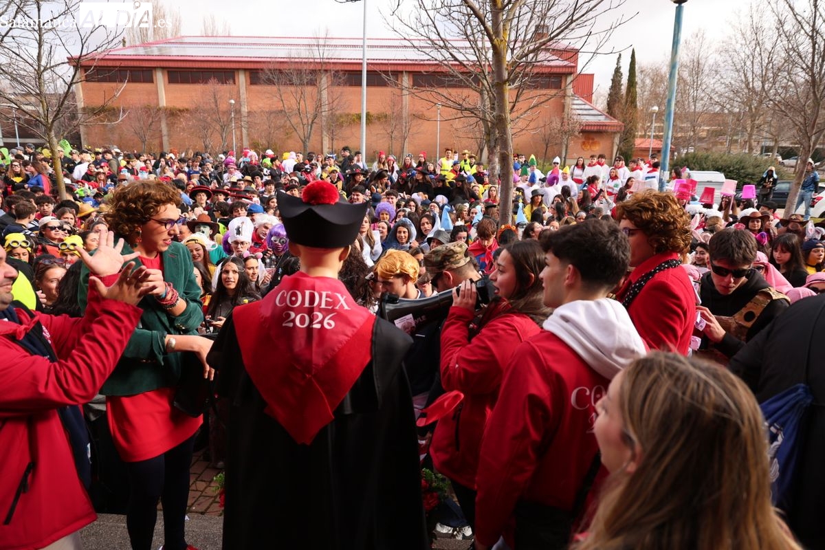 La Facultad de Derecho de la Universidad de Salamanca vive hoy, jueves 12 de febrero, su jornada más festiva y multitudinaria. Cientos de alumnos han protagonizado esta mañana el popular desfile del Codex, una marcha llena de ingenio y colorido que ha partido desde las instalaciones del centro en el Campus Miguel de Unamuno para recorrer el ambiente universitario al ritmo de la música.