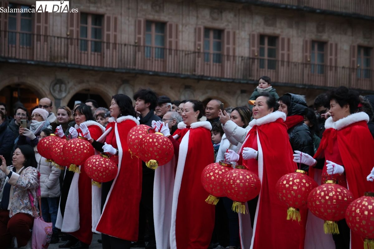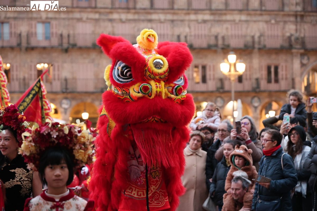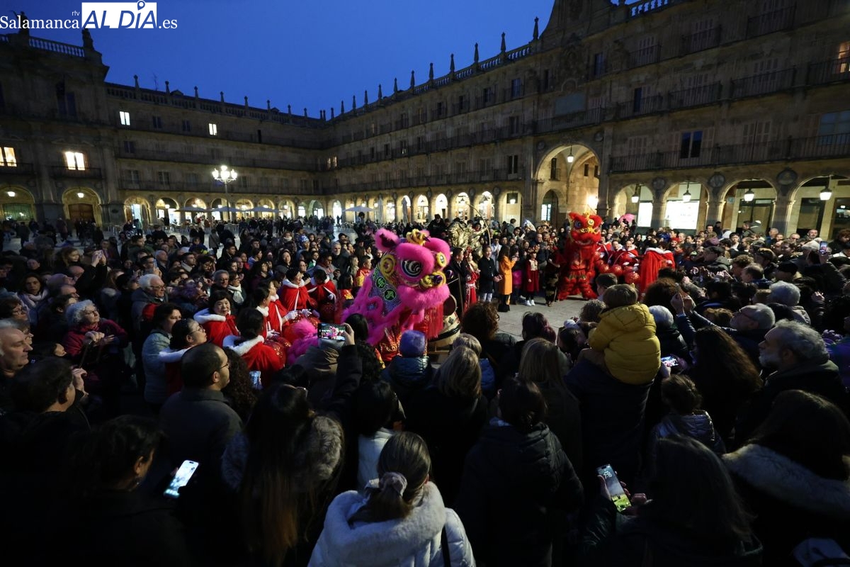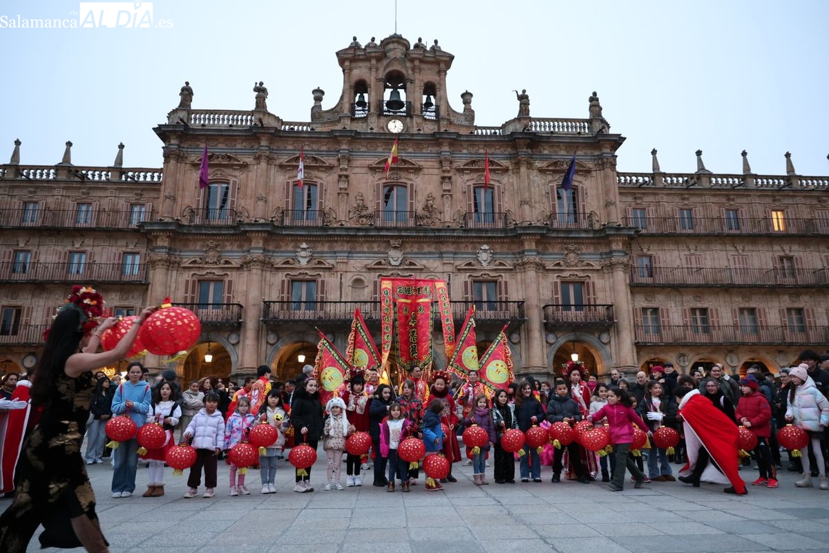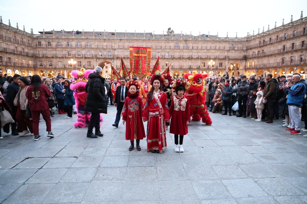 Salamanca continúa con las celebraciones del Año Nuevo Chino, que en la tarde de este jueves han tenido como escenario la Plaza Mayor y la calle Zamora. La programación festiva, organizada por el Ayuntamiento en colaboración con la Asociación Cantonesa de España, ha llenado de color el centro de la ciudad con un desfile tradicional y el encendido de una decoración especial.