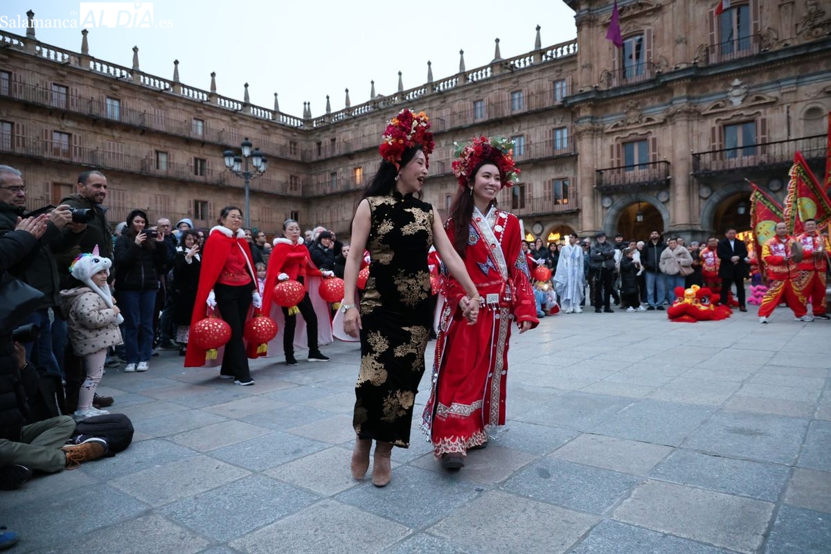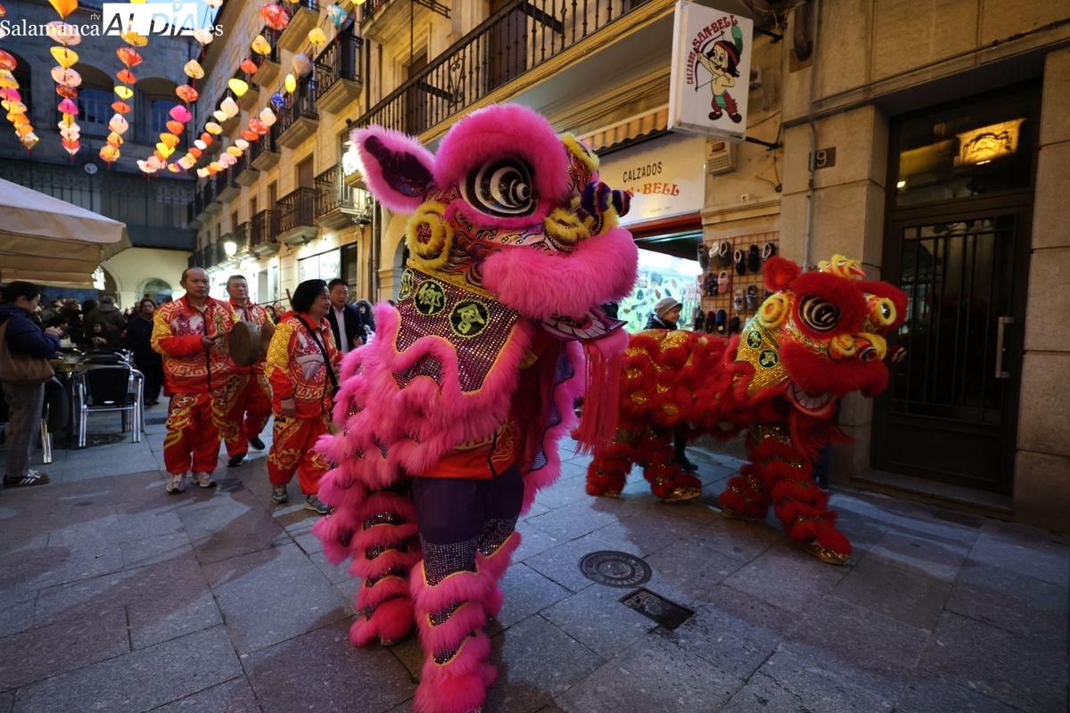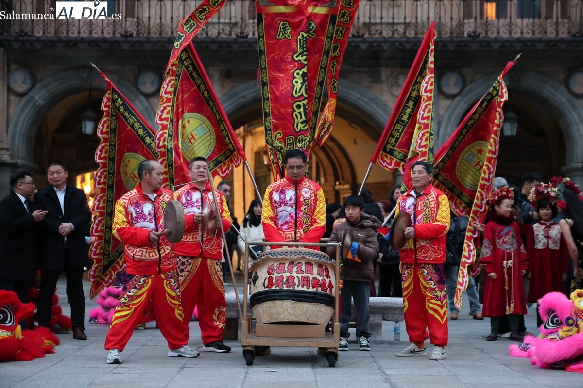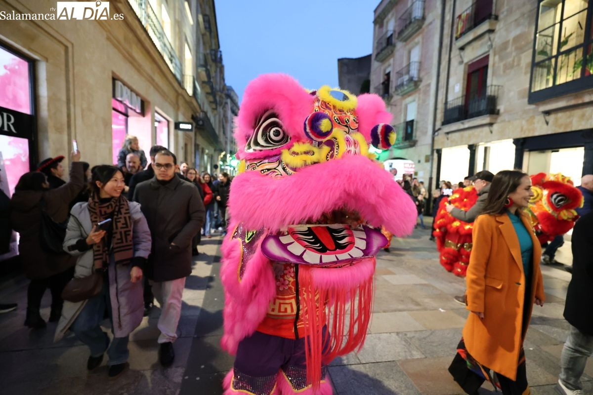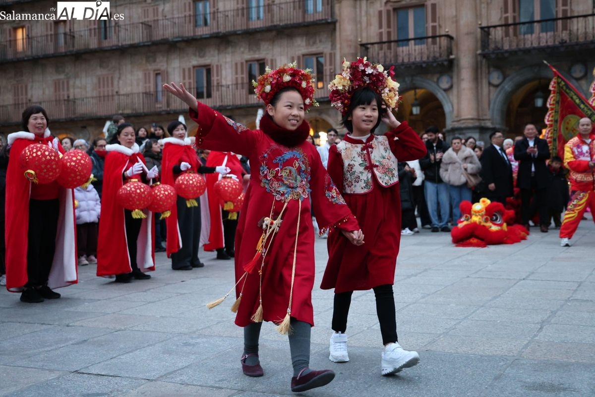 Salamanca continúa con las celebraciones del Año Nuevo Chino, que en la tarde de este jueves han tenido como escenario la Plaza Mayor y la calle Zamora. La programación festiva, organizada por el Ayuntamiento en colaboración con la Asociación Cantonesa de España, ha llenado de color el centro de la ciudad con un desfile tradicional y el encendido de una decoración especial.