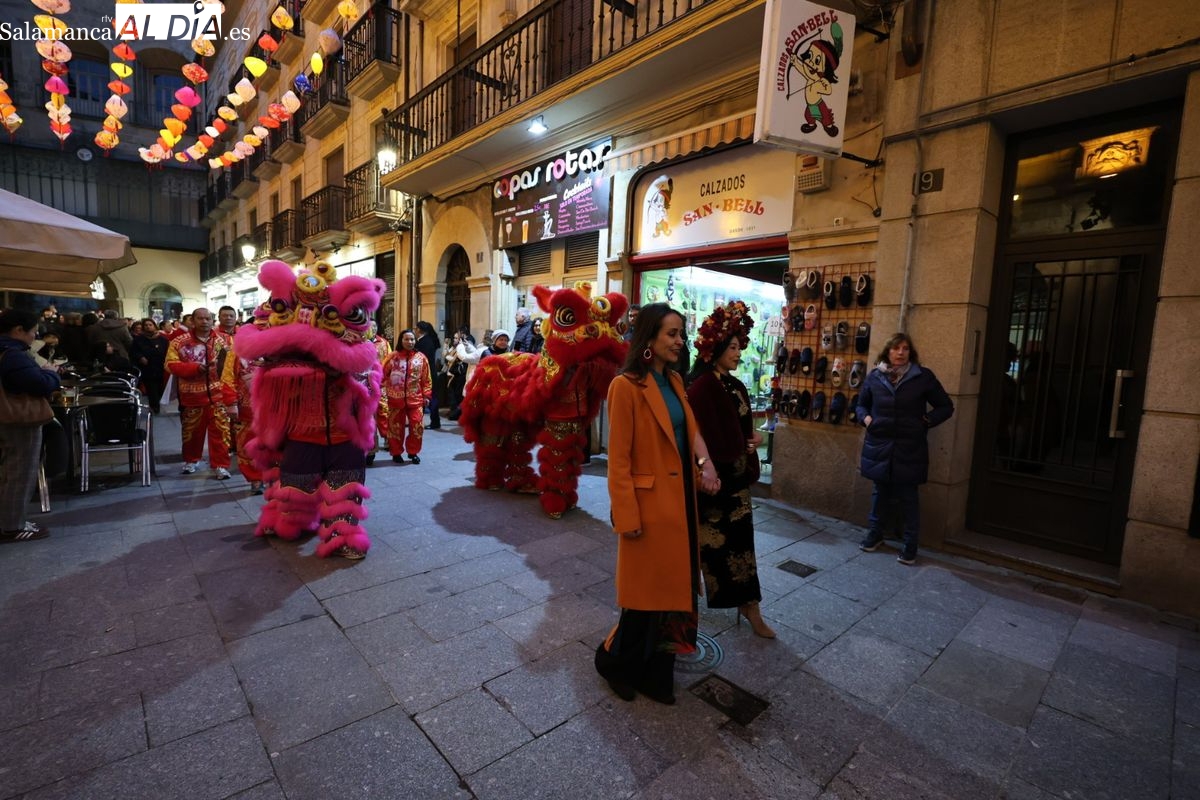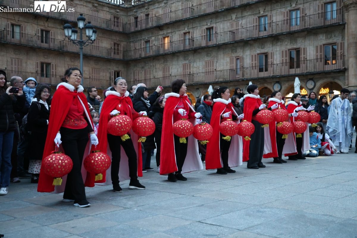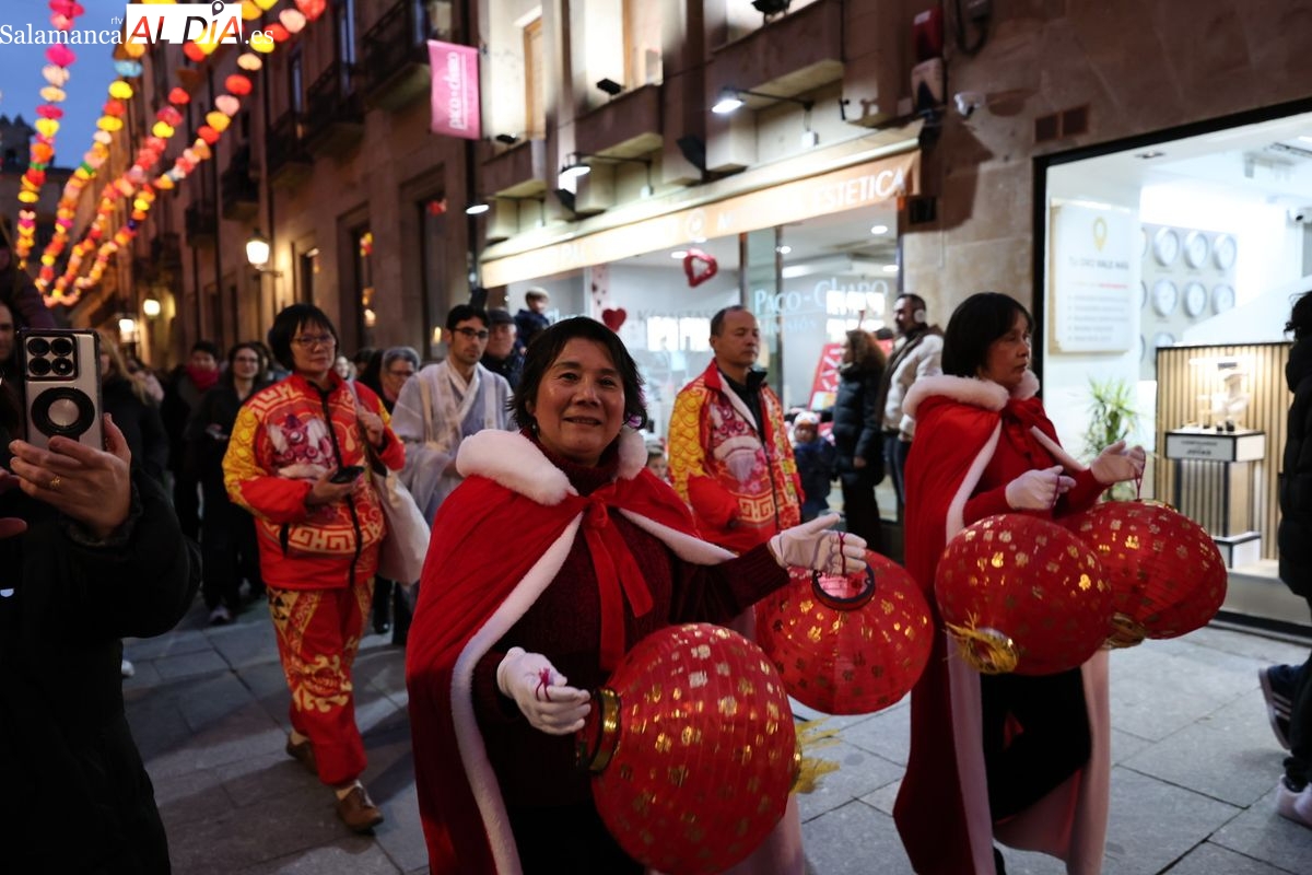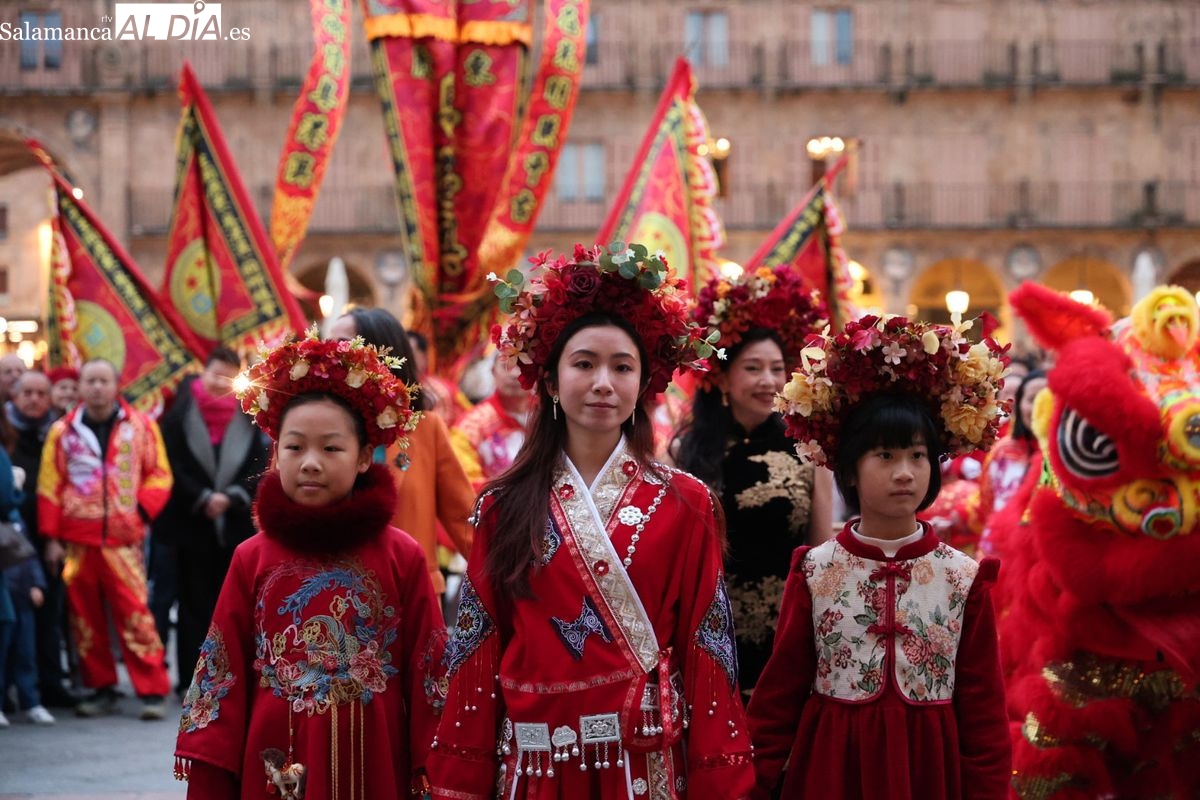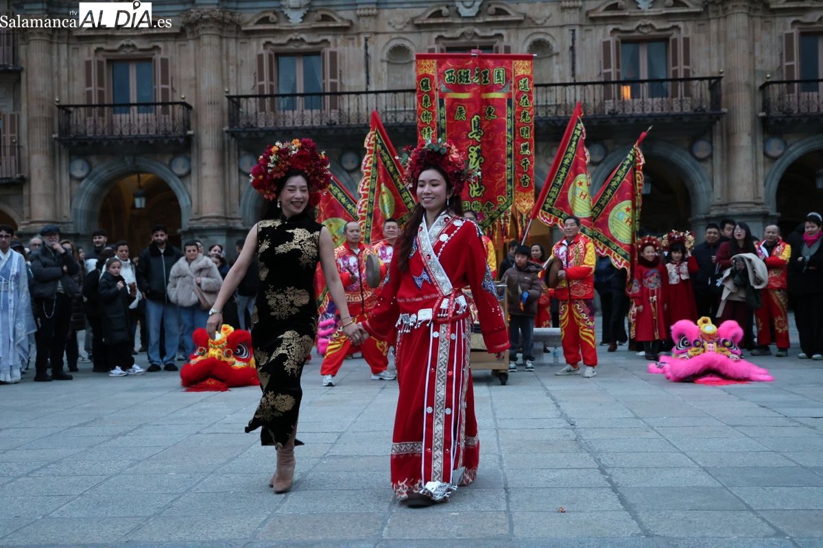 Salamanca continúa con las celebraciones del Año Nuevo Chino, que en la tarde de este jueves han tenido como escenario la Plaza Mayor y la calle Zamora. La programación festiva, organizada por el Ayuntamiento en colaboración con la Asociación Cantonesa de España, ha llenado de color el centro de la ciudad con un desfile tradicional y el encendido de una decoración especial.