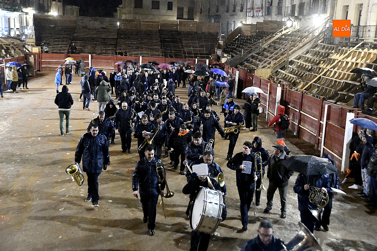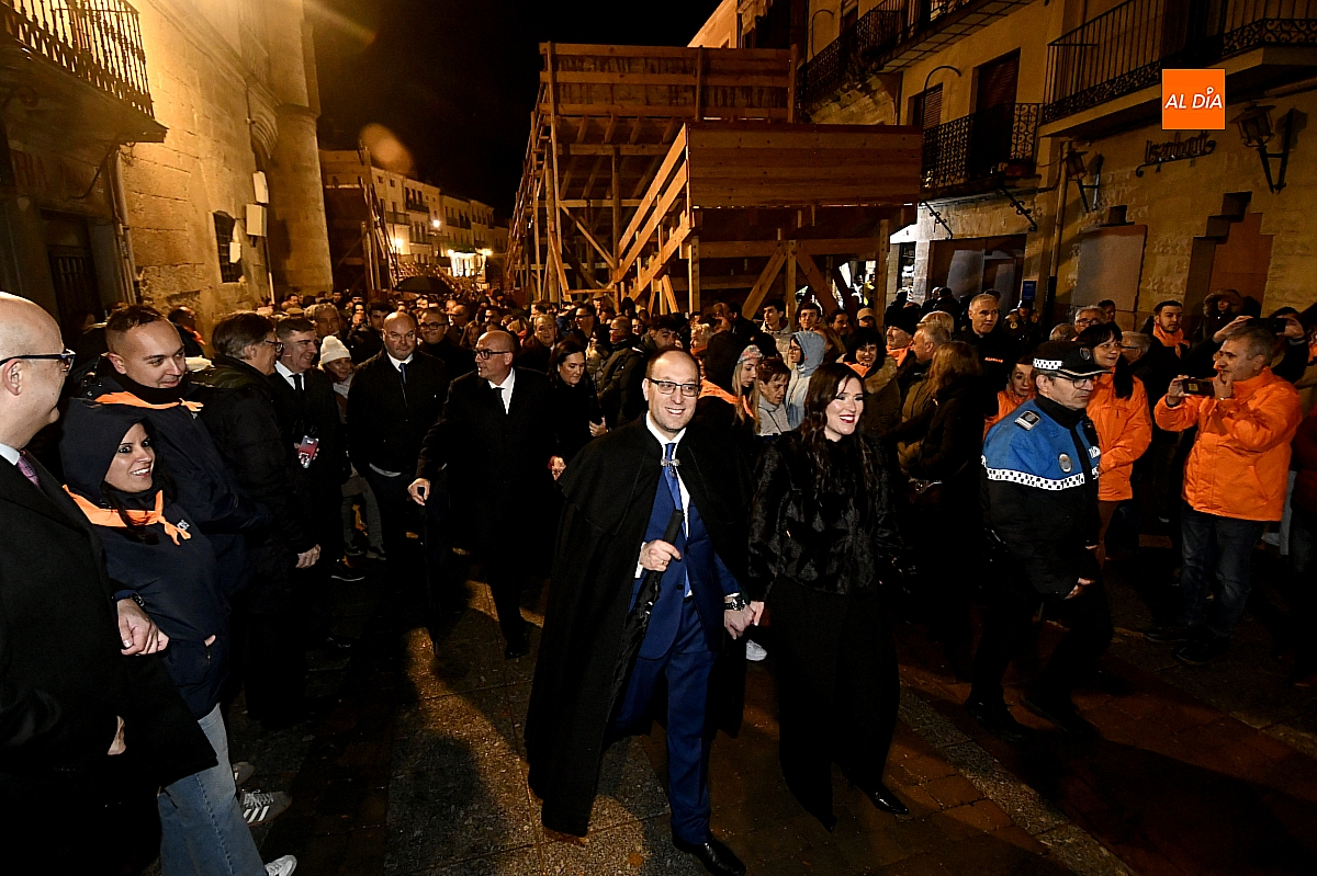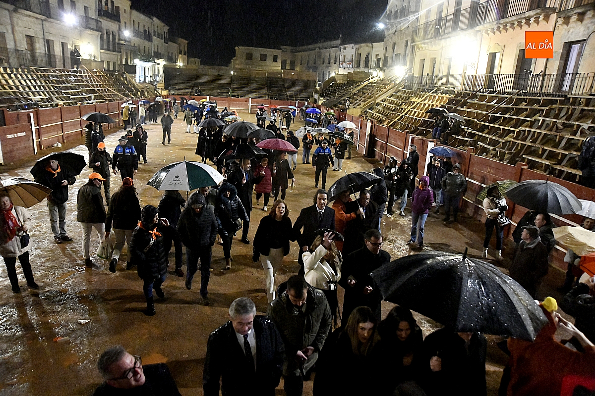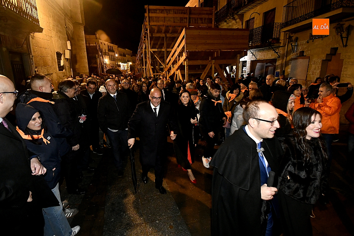 La jornada se inició ante las puertas de la Catedral, donde autoridades y vecinos mirobrigenses dieron la bienvenida al pregonero, investido en esta edición de un protagonismo singular al asumir un triple cometido dentro de las celebraciones. Desde allí partió el cortejo, acompañado por la Banda Municipal de Música, en un pasacalles que la intensa lluvia deslució, obligando a los asistentes a refugiarse y restando brillo a un trayecto concebido para la cercanía y el bullicio.