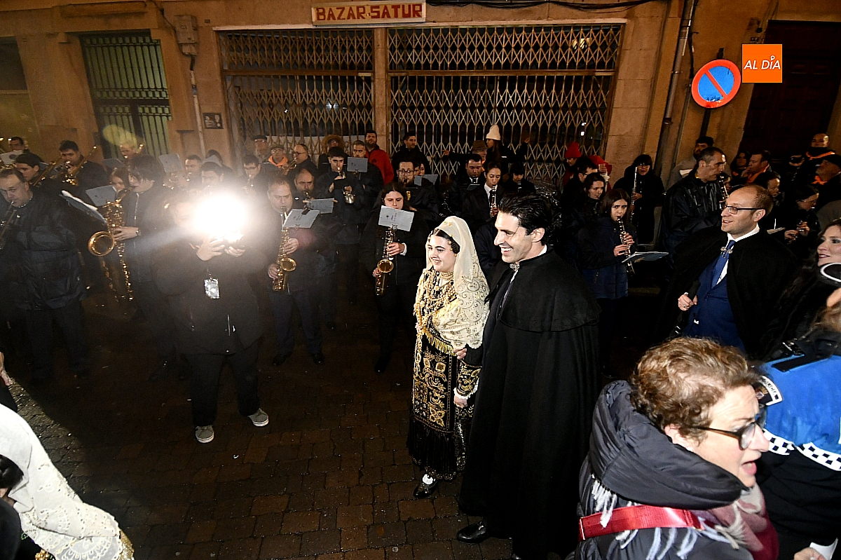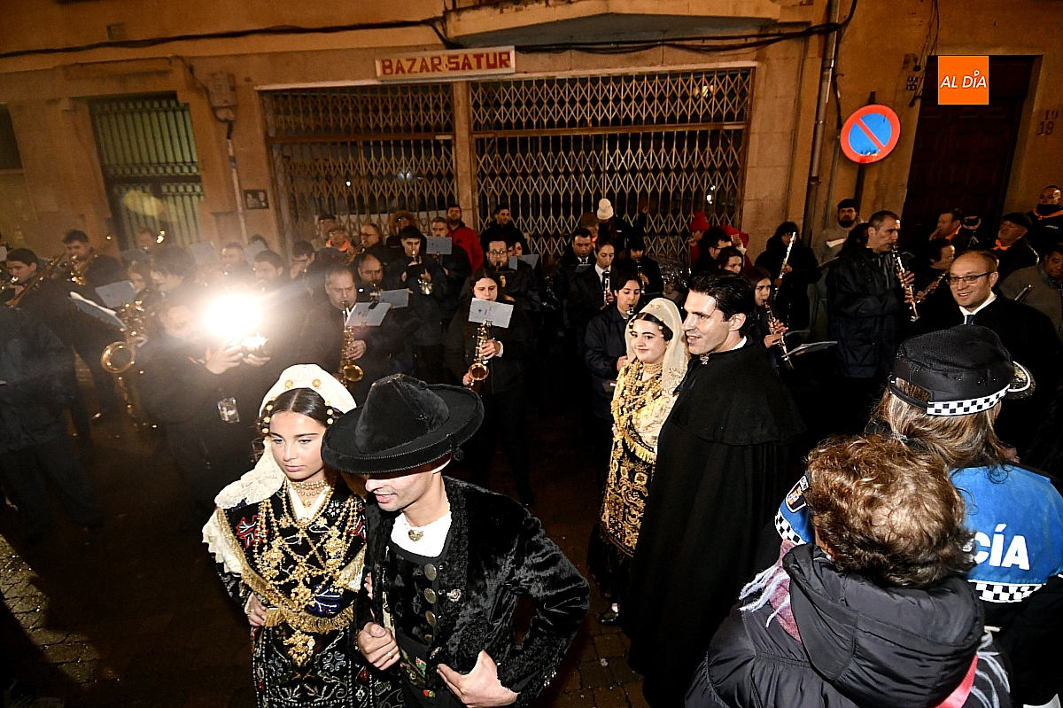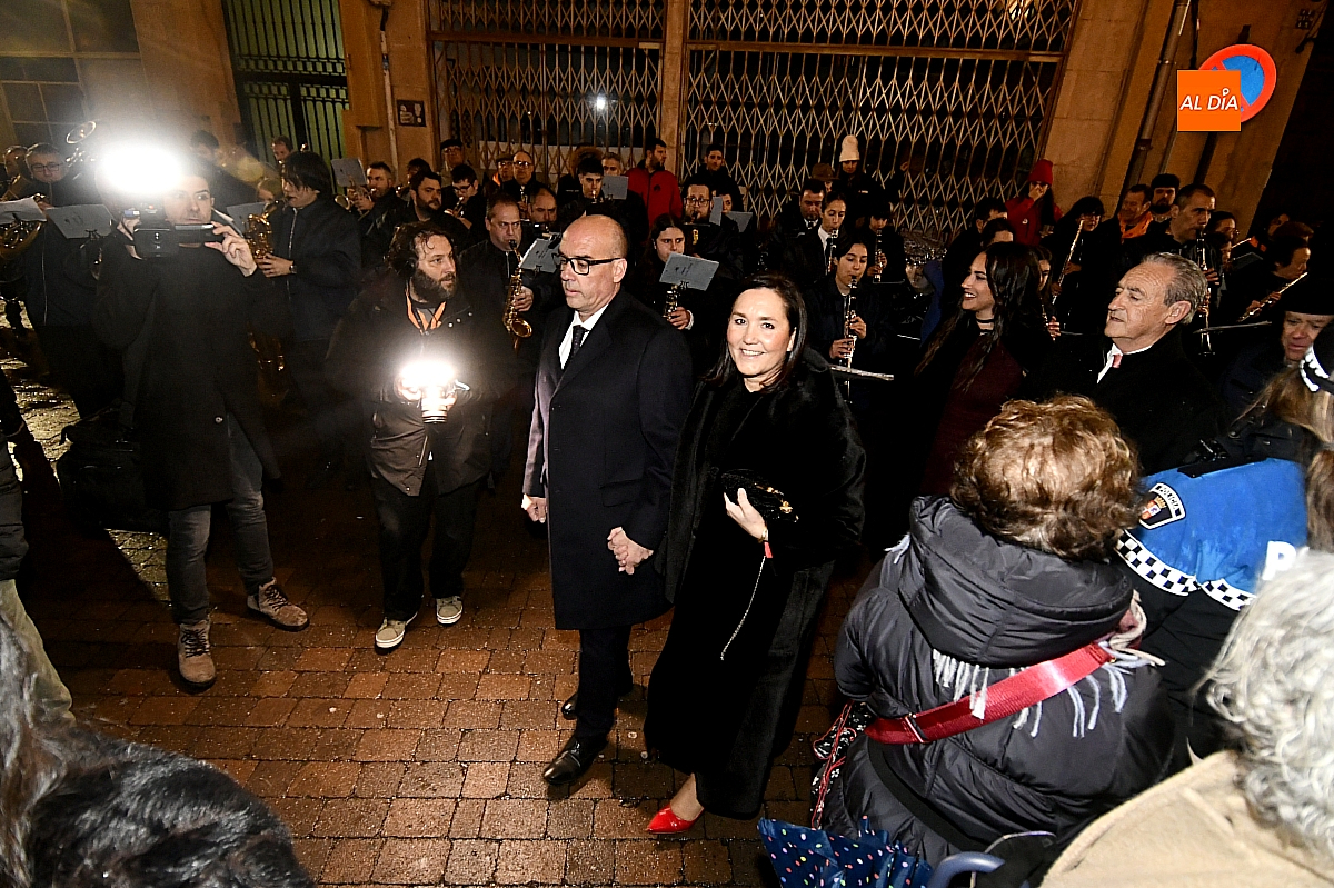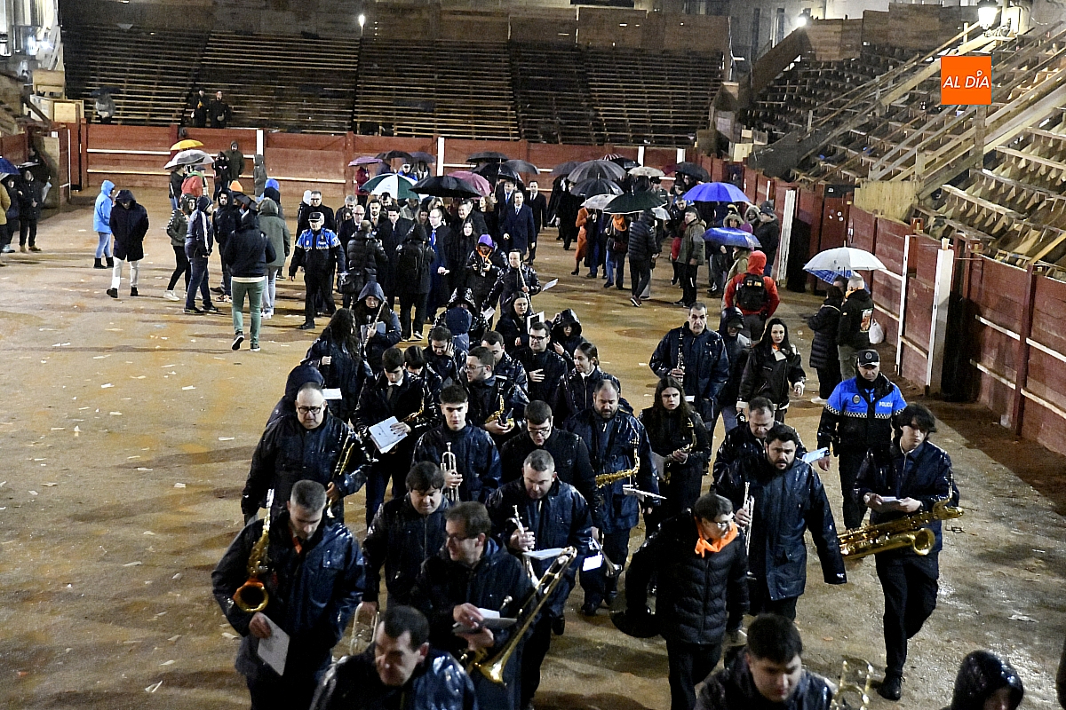 La jornada se inició ante las puertas de la Catedral, donde autoridades y vecinos mirobrigenses dieron la bienvenida al pregonero, investido en esta edición de un protagonismo singular al asumir un triple cometido dentro de las celebraciones. Desde allí partió el cortejo, acompañado por la Banda Municipal de Música, en un pasacalles que la intensa lluvia deslució, obligando a los asistentes a refugiarse y restando brillo a un trayecto concebido para la cercanía y el bullicio.