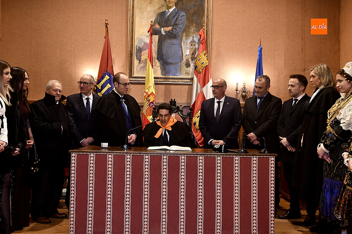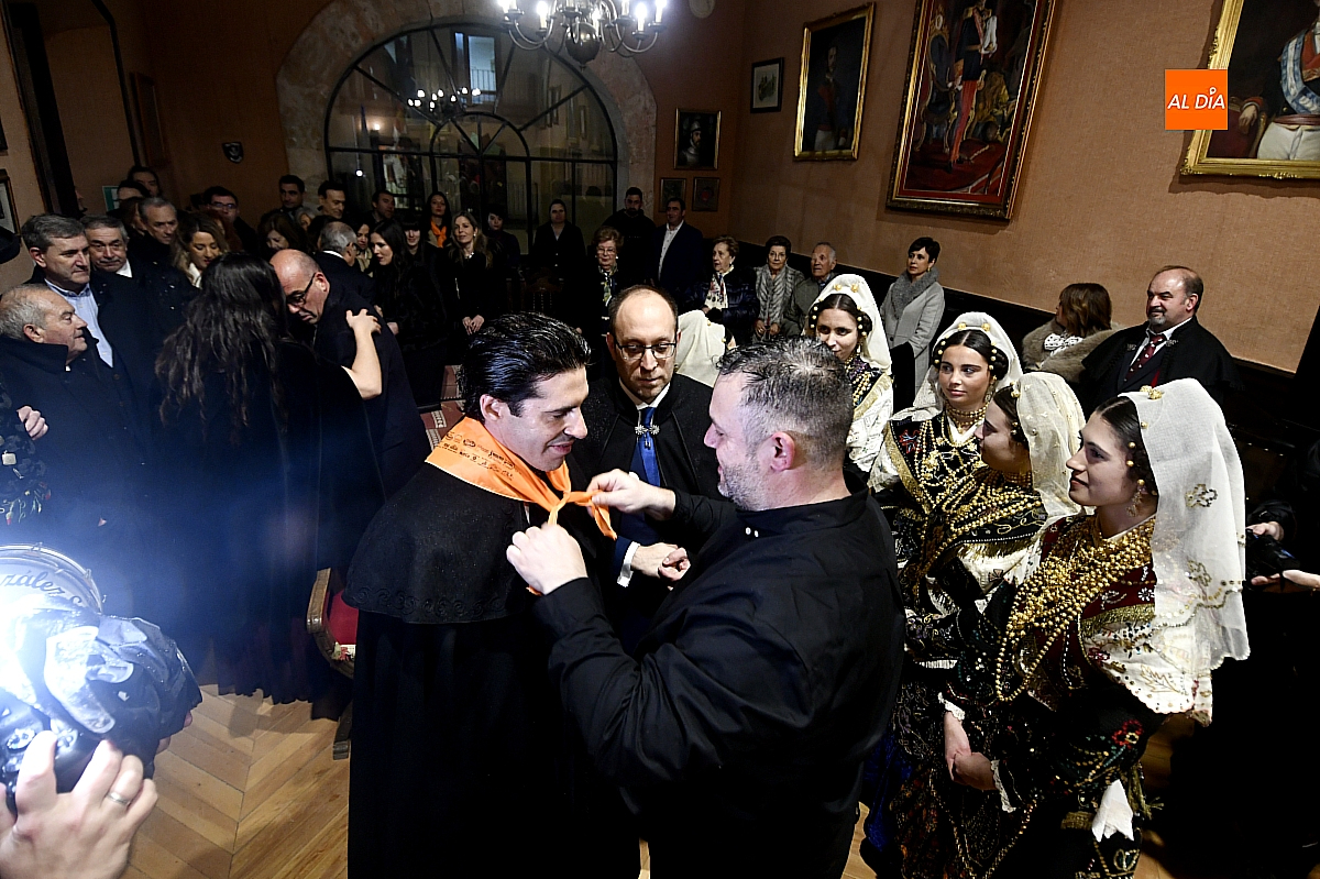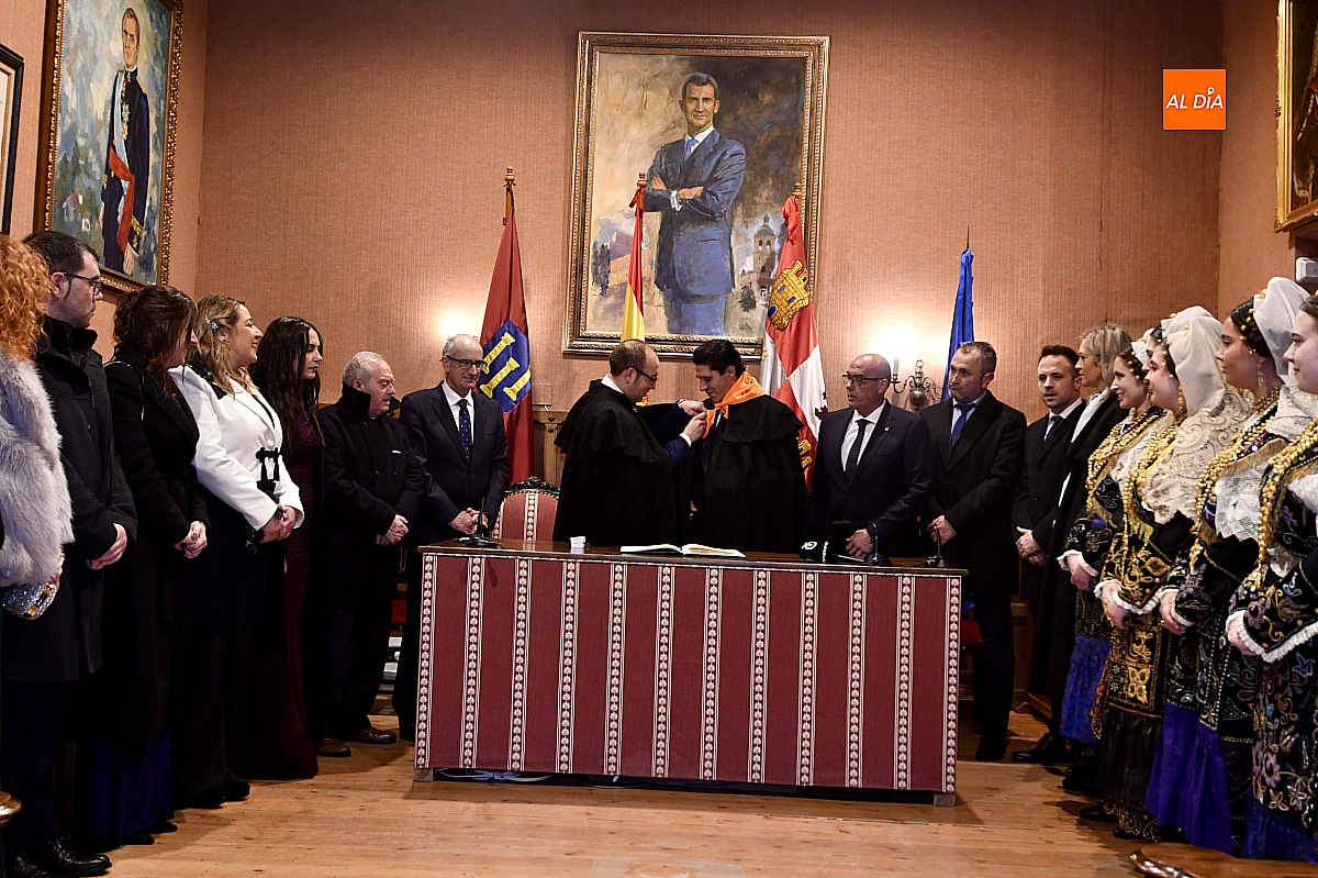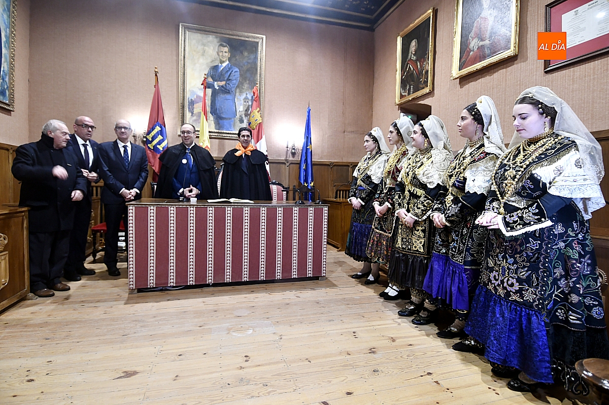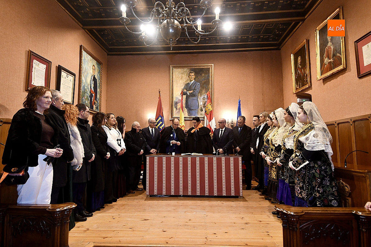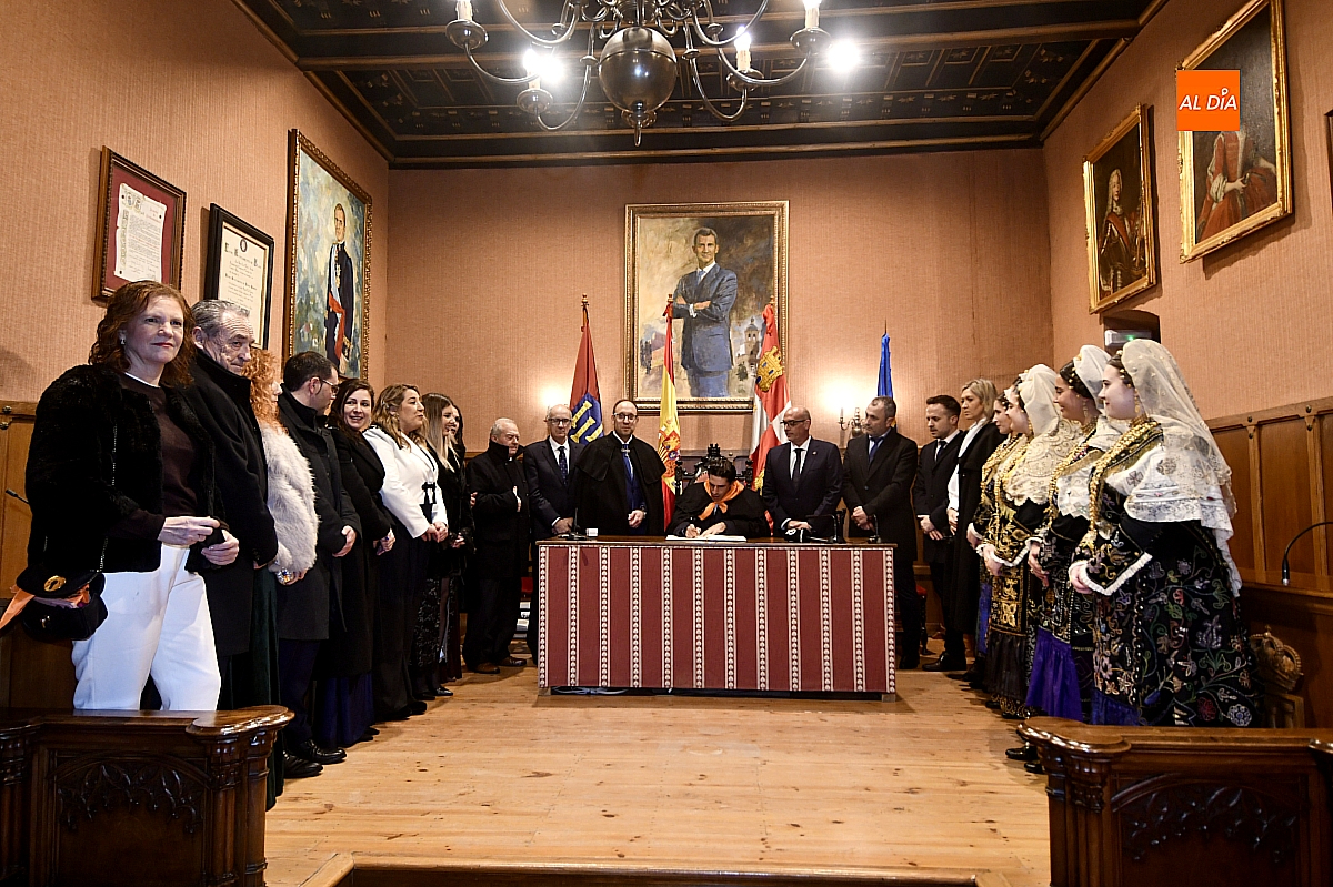 Ya en el Salón de Plenos del Ayuntamiento, la Corte de Honor, ataviada con el traje charro, recibió formalmente al pregonero, quien firmó en el Libro de Honor de la ciudad y recibió el tradicional pin de oro. Tras la fotografía protocolaria, estaba previsto un breve “pregoncillo” desde el balcón consistorial, gesto habitual hacia la Plaza Mayor; sin embargo, la persistencia del aguacero, que había vaciado el espacio público, aconsejó suspender ese saludo.