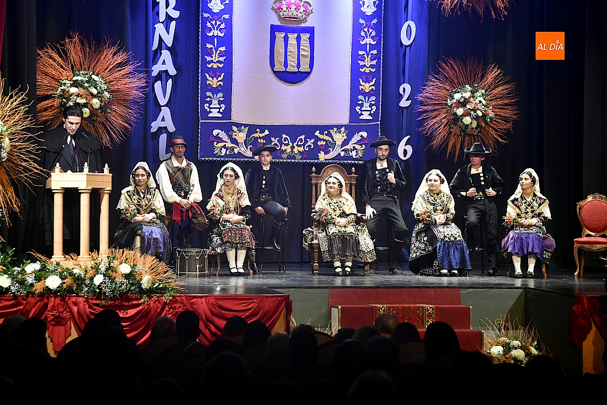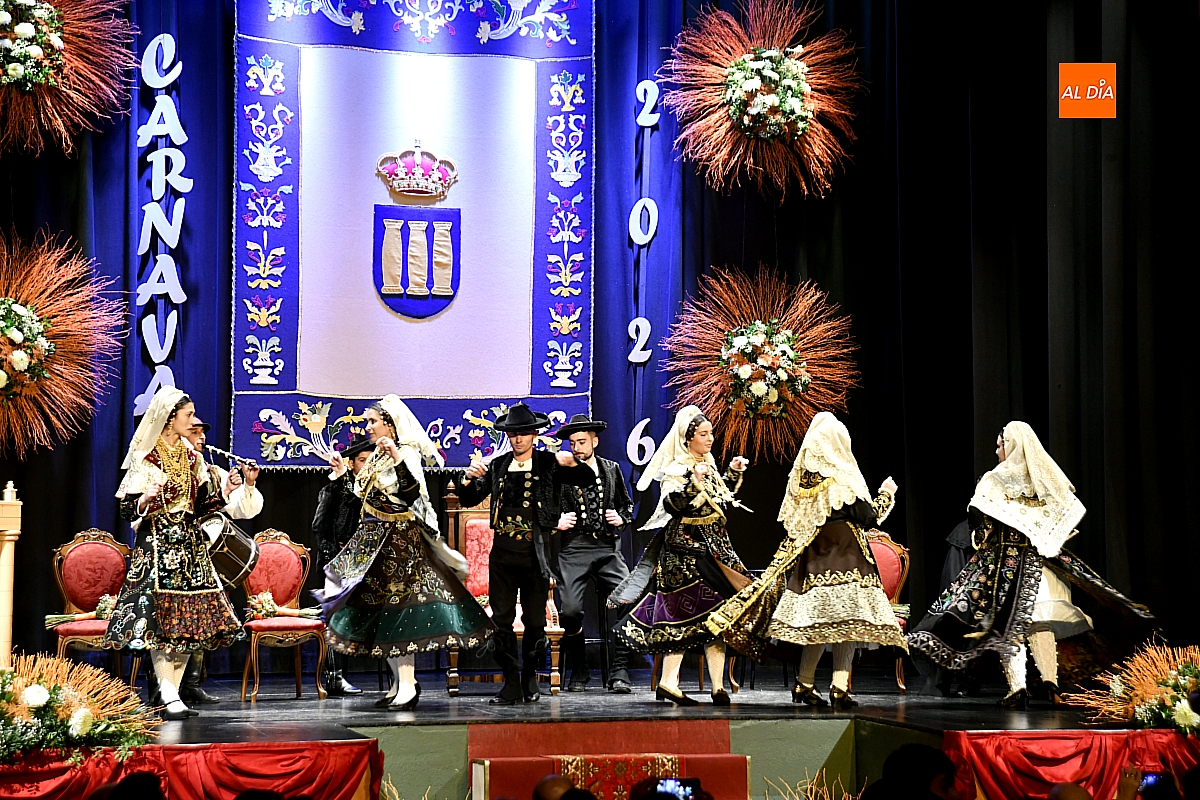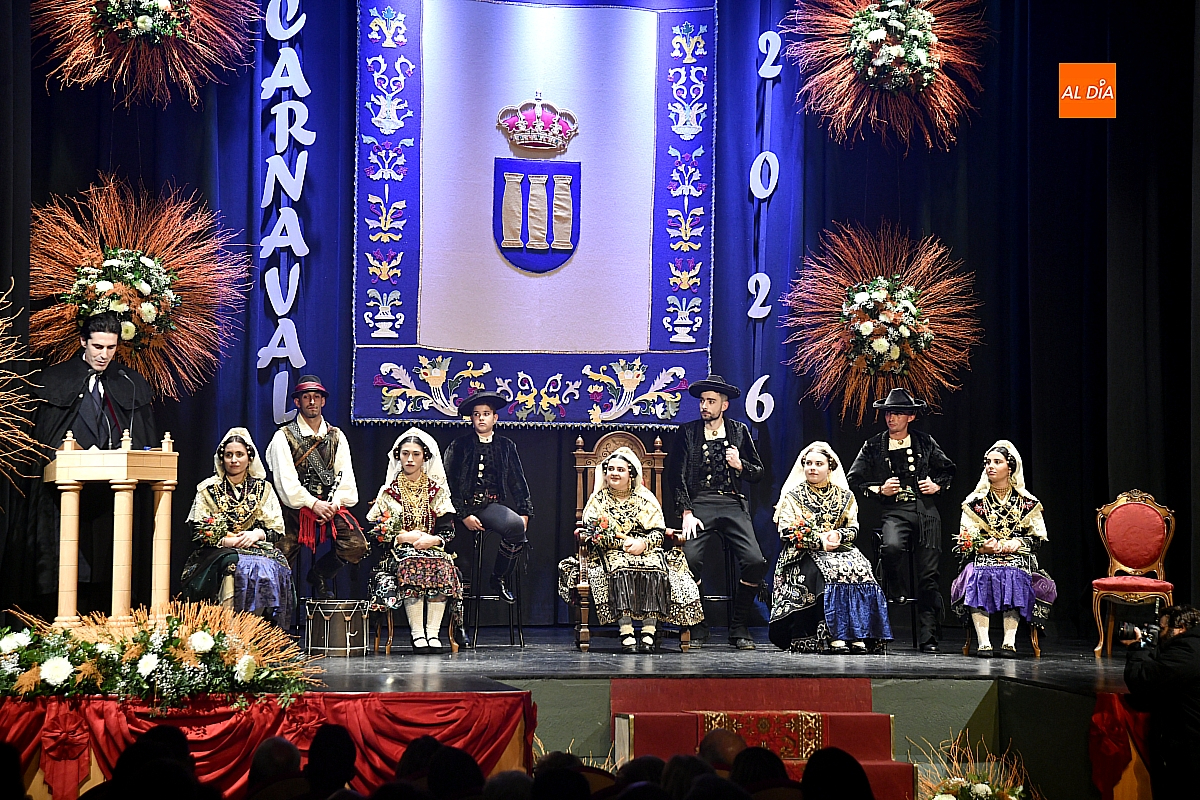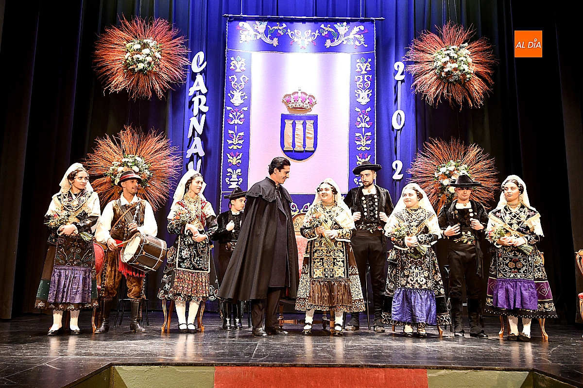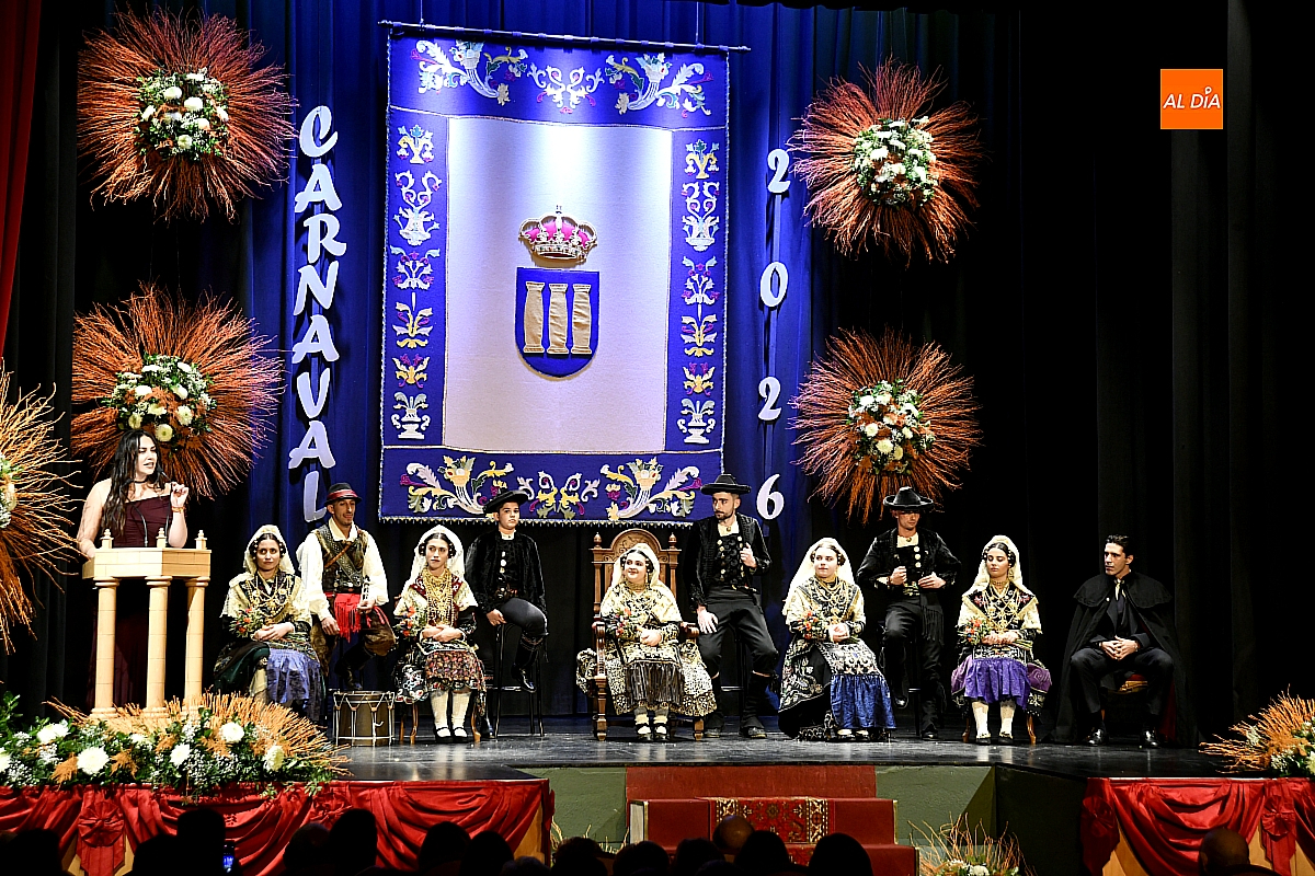 El acto dio comienzo con una cuidada puesta en escena: las damas accedieron al patio de butacas acompañadas por sus respectivos damos, seguidas de la Reina del Carnaval y del Pregonero Mayor, Alejandro Talavante, mientras resonaban la gaita y el tamboril interpretados por Diego González. La concejala Paola Muñoz ejerció como maestra de ceremonias en una apertura de marcado tono tradicional, atreviédose las damas de honor hacer una demostración de Floklore Charro.
