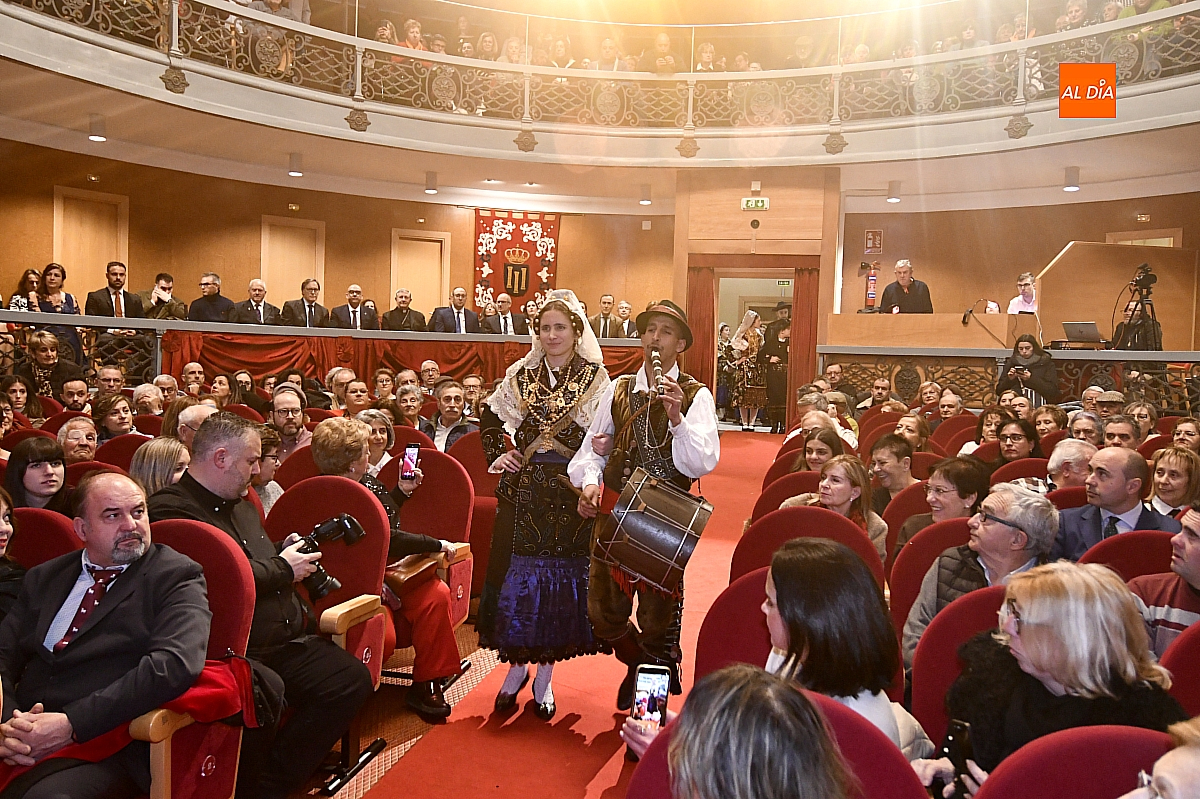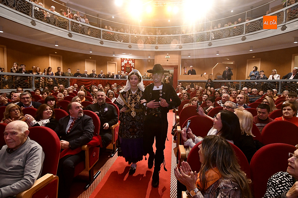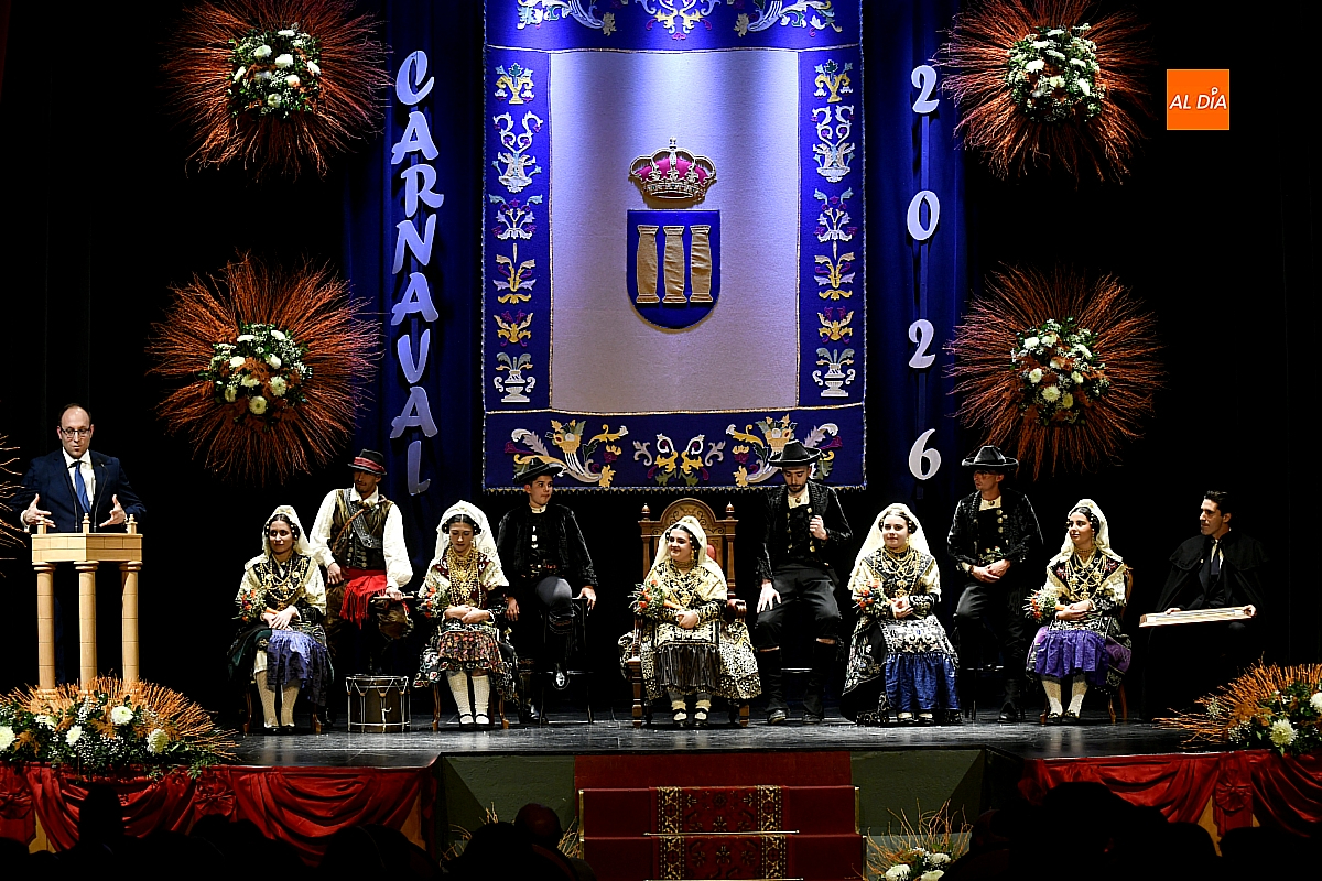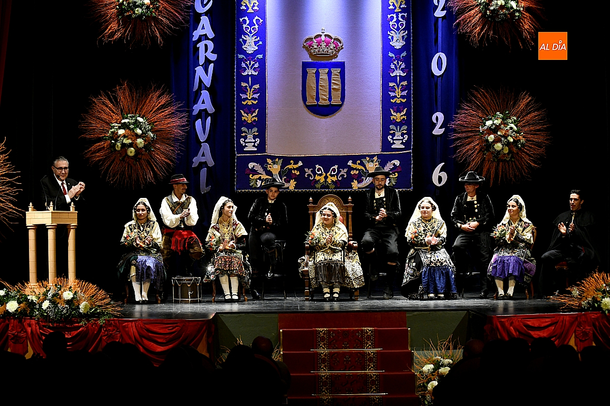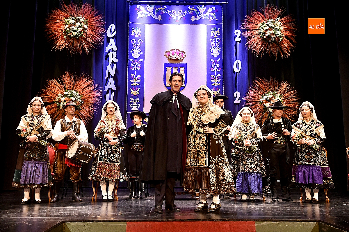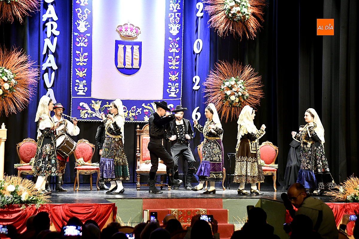 El acto dio comienzo con una cuidada puesta en escena: las damas accedieron al patio de butacas acompañadas por sus respectivos damos, seguidas de la Reina del Carnaval y del Pregonero Mayor, Alejandro Talavante, mientras resonaban la gaita y el tamboril interpretados por Diego González. La concejala Paola Muñoz ejerció como maestra de ceremonias en una apertura de marcado tono tradicional, atreviédose las damas de honor hacer una demostración de Floklore Charro.