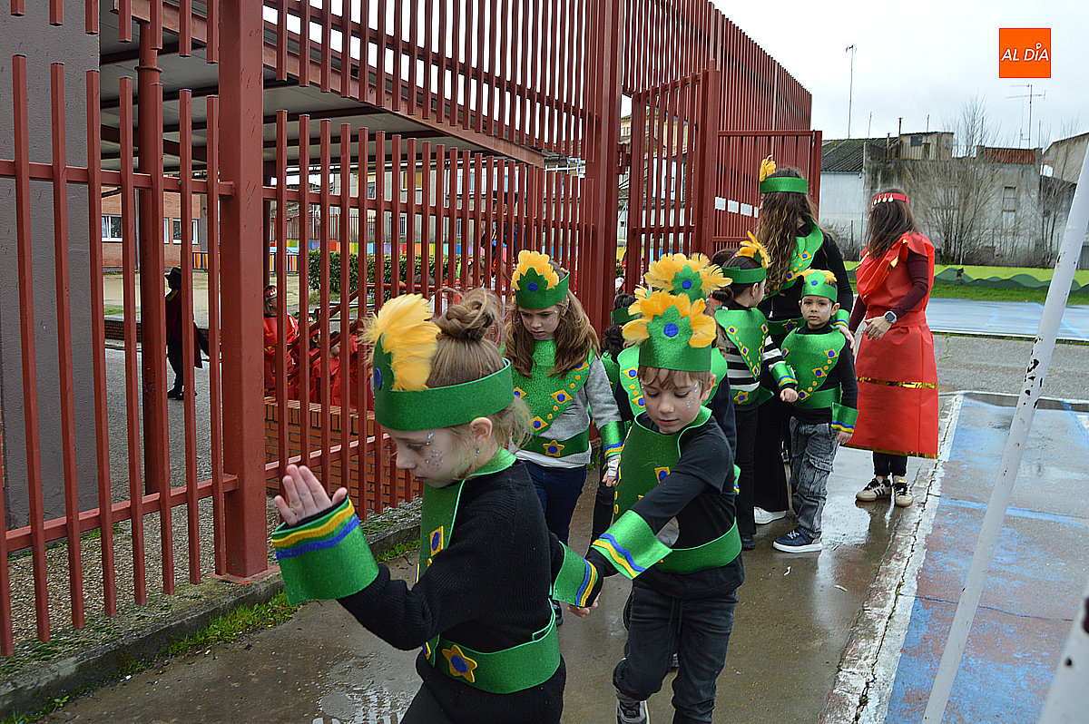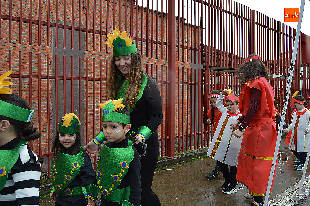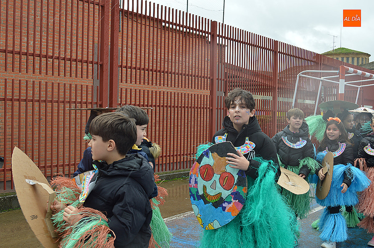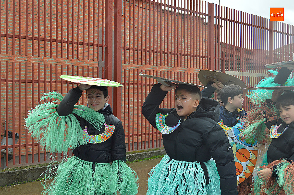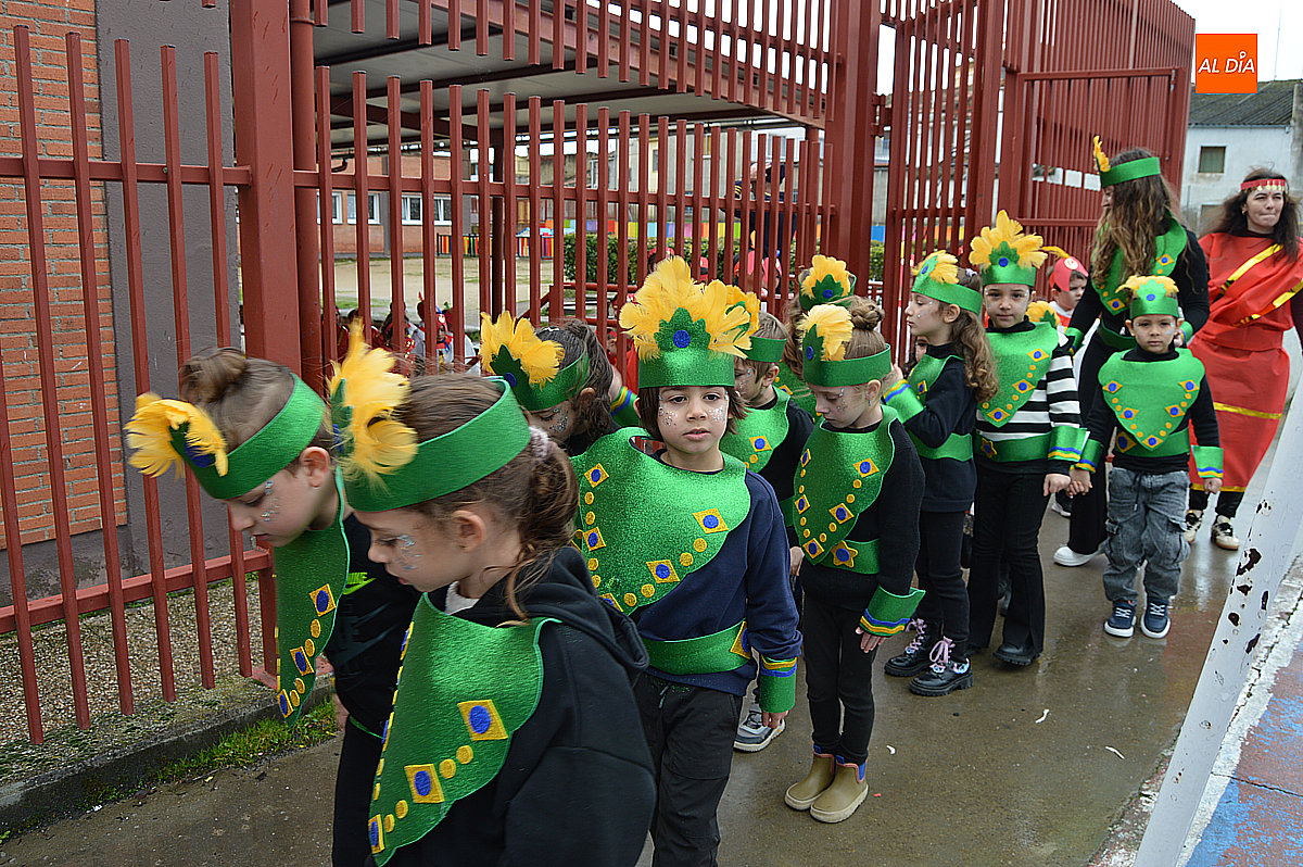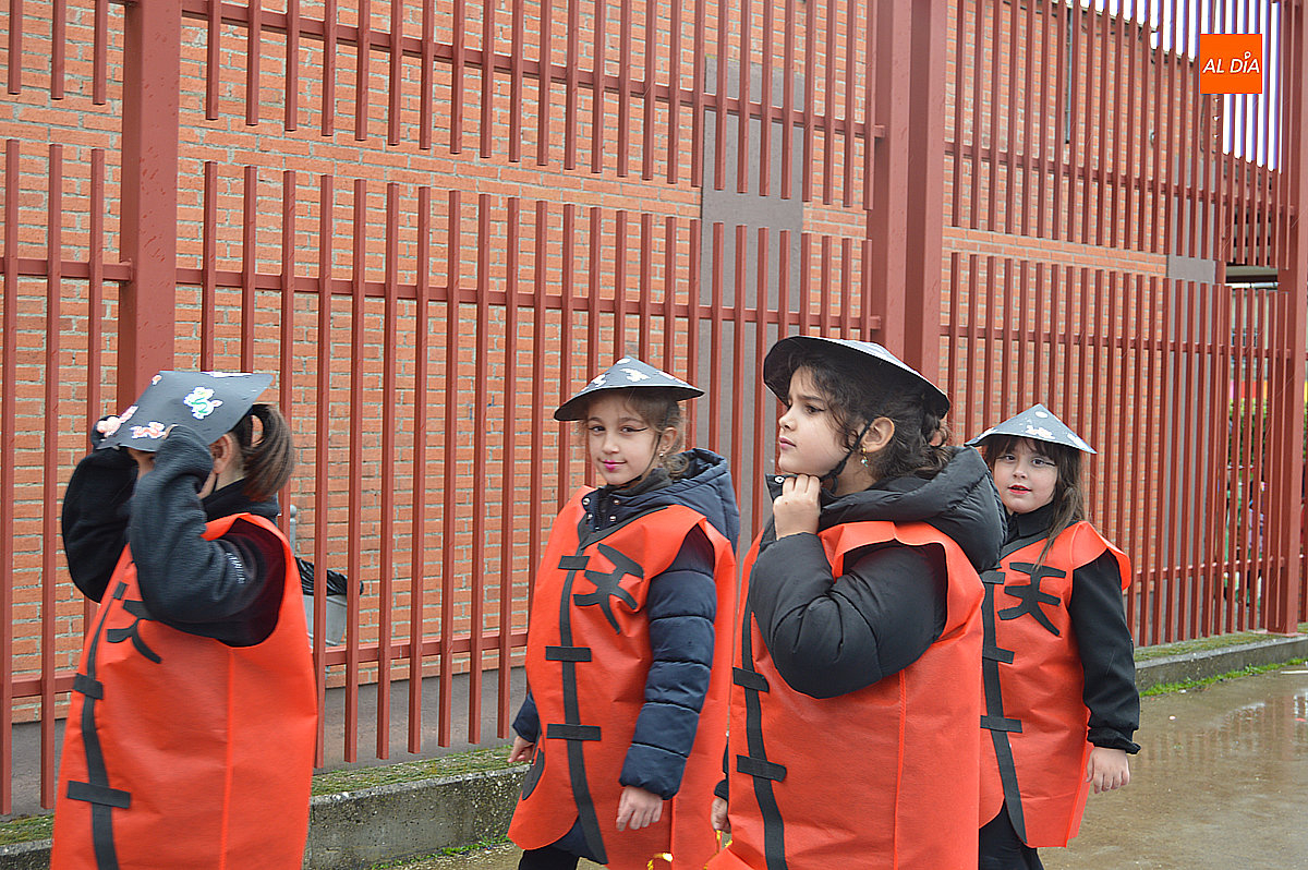 Aunque inicialmente estaba previsto que el desfile recorriera las calles de la localidad hasta la Plaza de Toros, las inclemencias del tiempo obligaron a modificar el itinerario. Sin embargo, la lluvia no frenó las ganas de disfrutar de la jornada y de mostrar sus disfraces. El patio del colegio se transformó en pasarela improvisada por la que fueron desfilando los distintos cursos para mostrar sus creativos y originales disfraces, muchos de ellos elaborados con materiales reciclados.