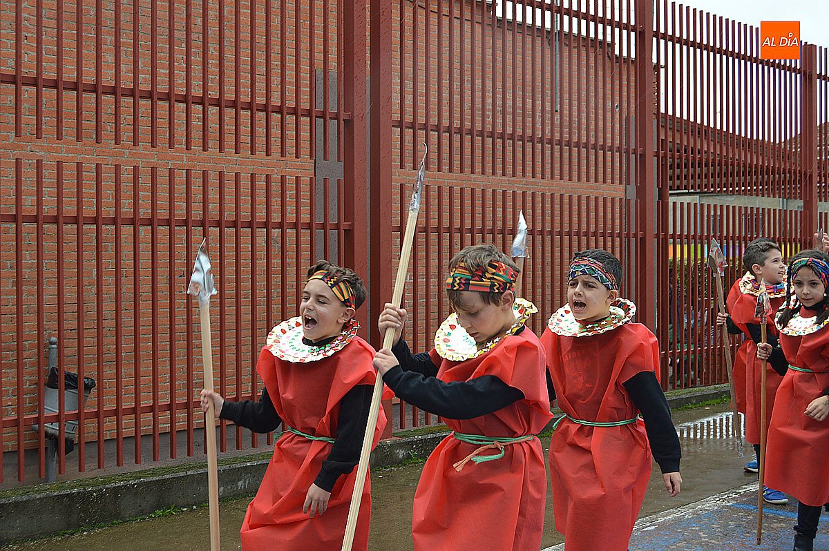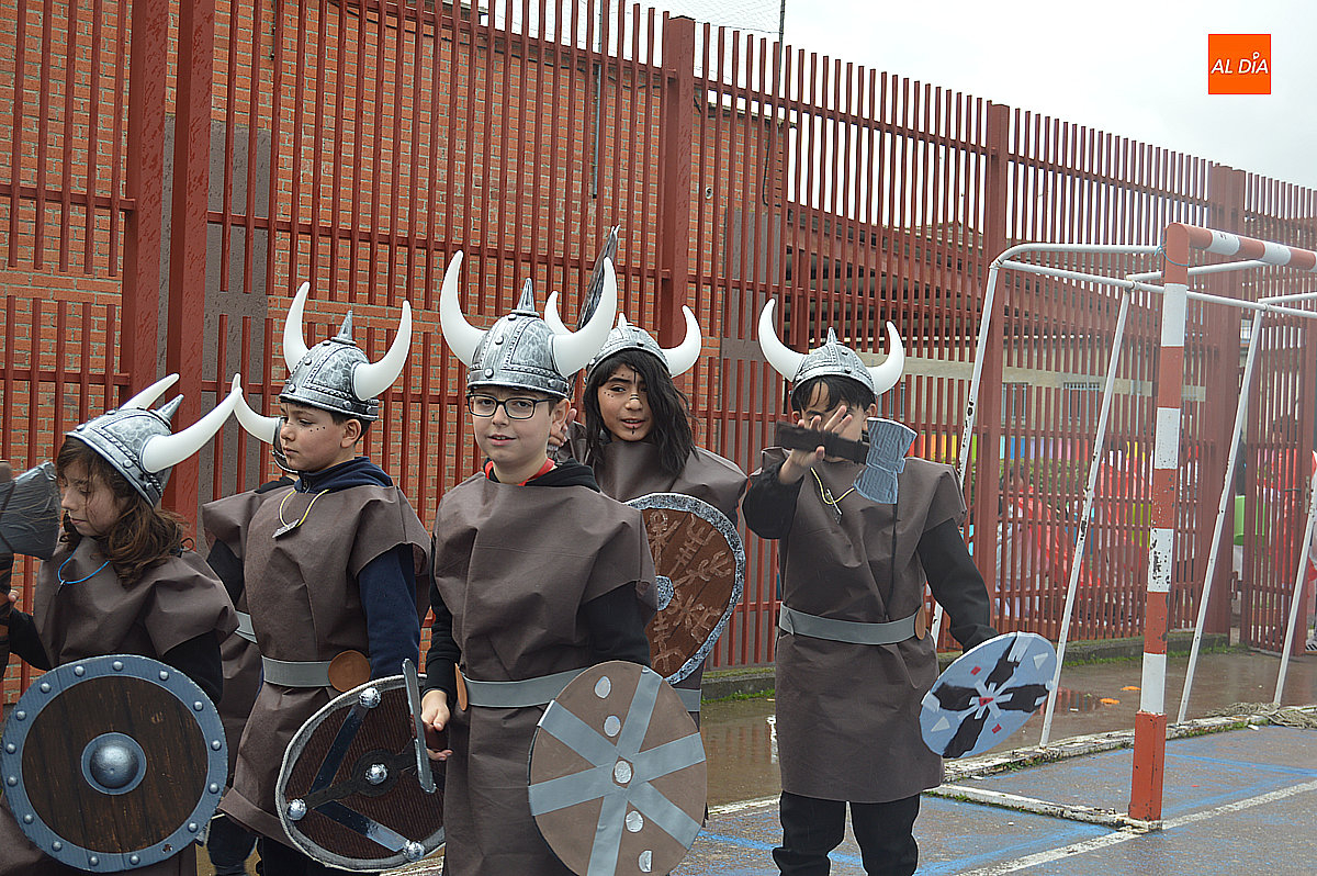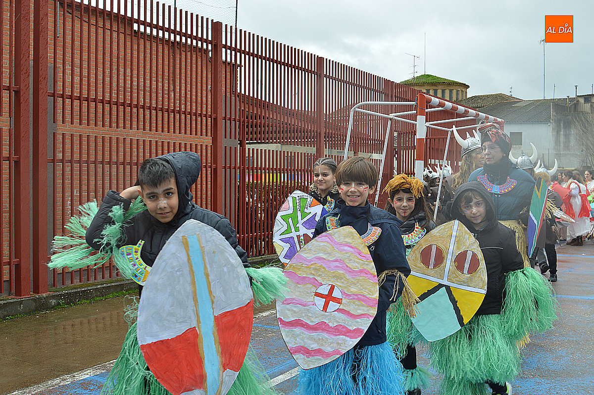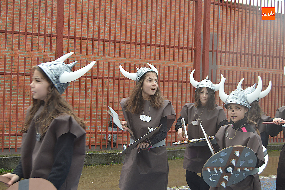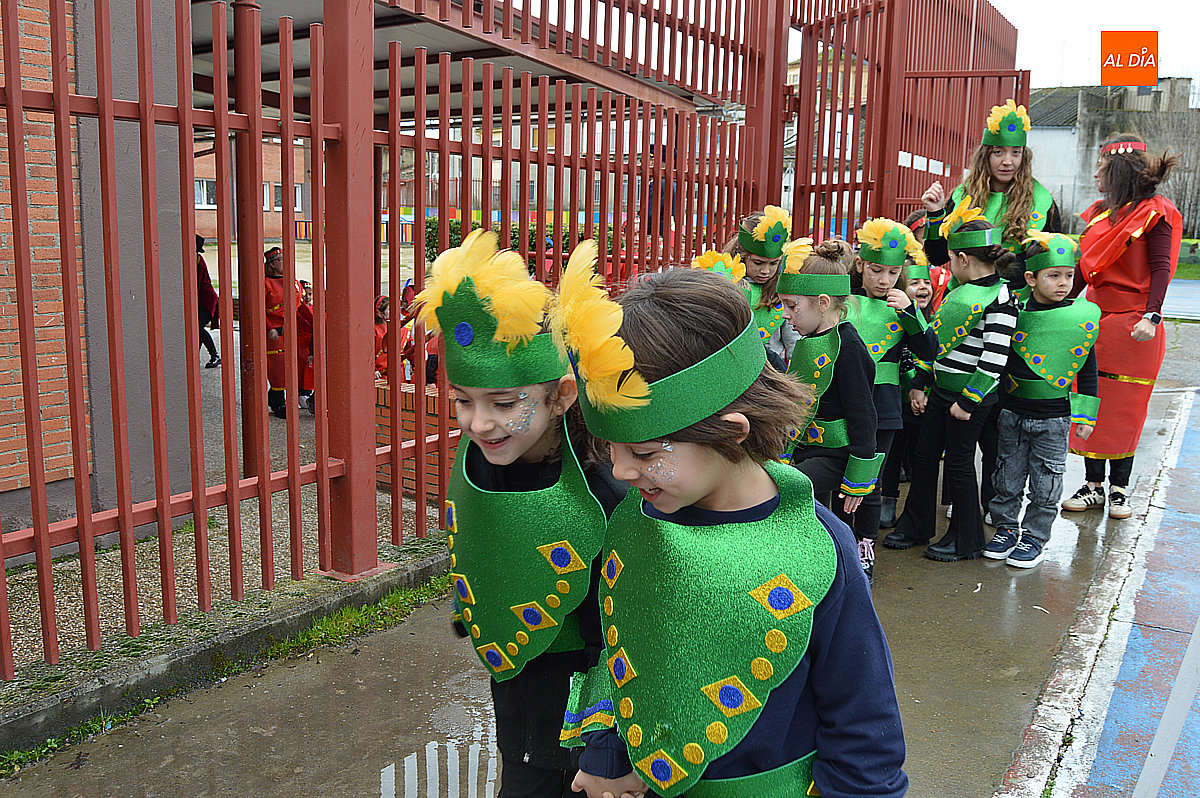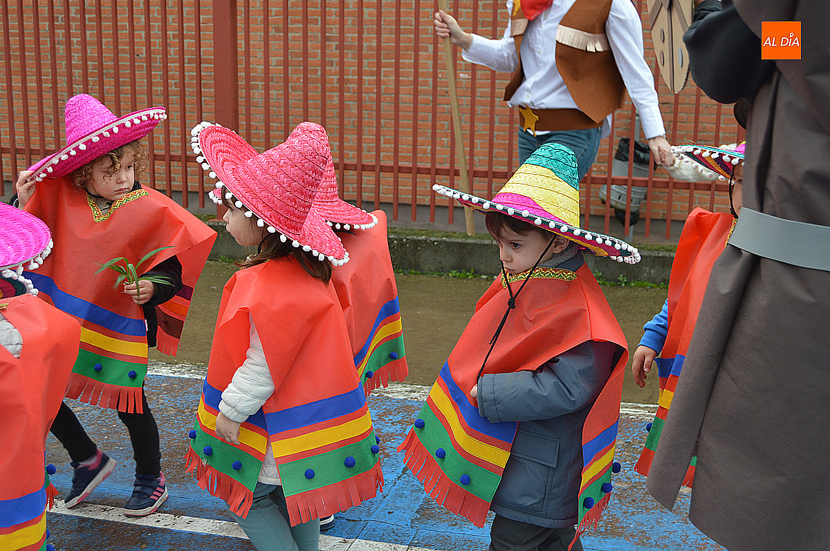 Aunque inicialmente estaba previsto que el desfile recorriera las calles de la localidad hasta la Plaza de Toros, las inclemencias del tiempo obligaron a modificar el itinerario. Sin embargo, la lluvia no frenó las ganas de disfrutar de la jornada y de mostrar sus disfraces. El patio del colegio se transformó en pasarela improvisada por la que fueron desfilando los distintos cursos para mostrar sus creativos y originales disfraces, muchos de ellos elaborados con materiales reciclados.