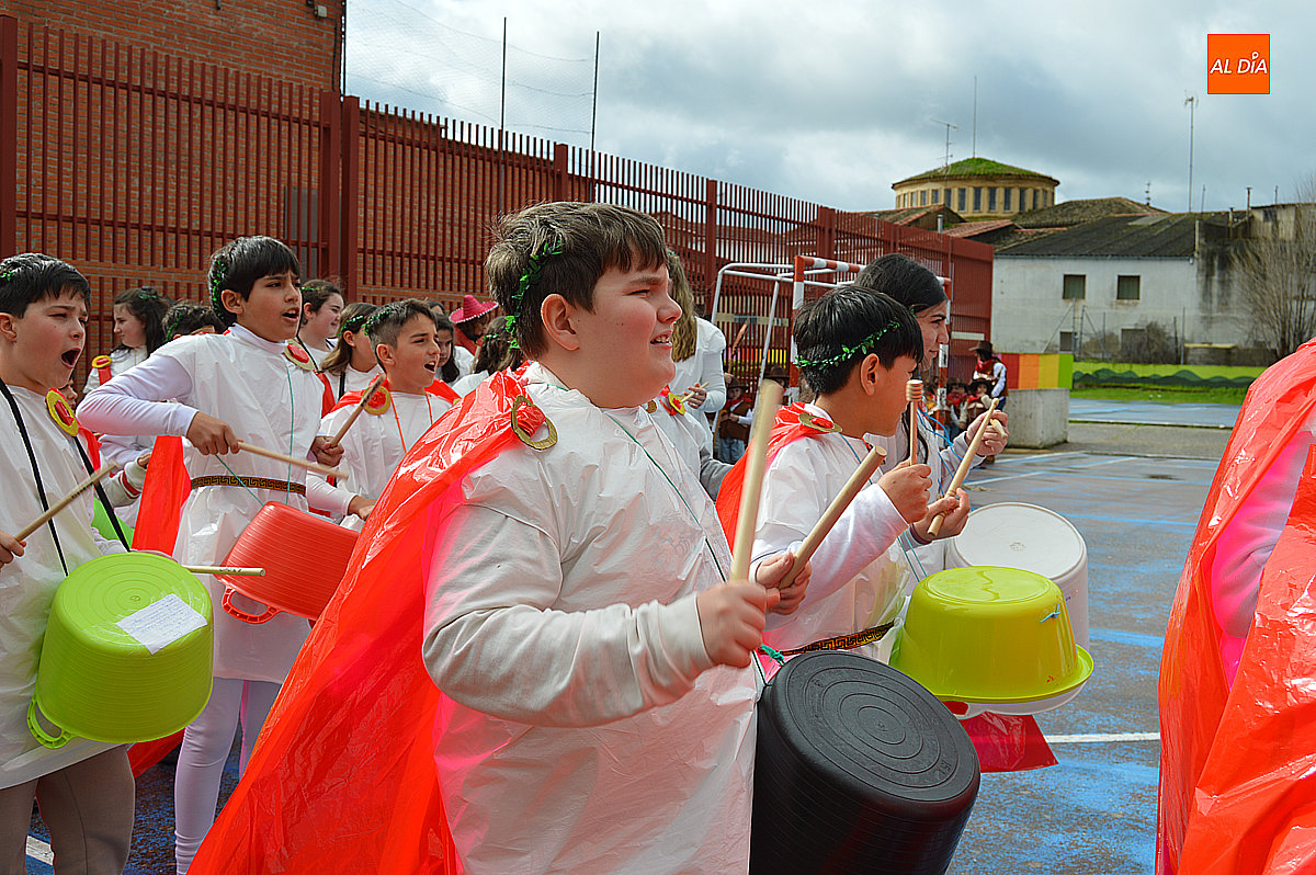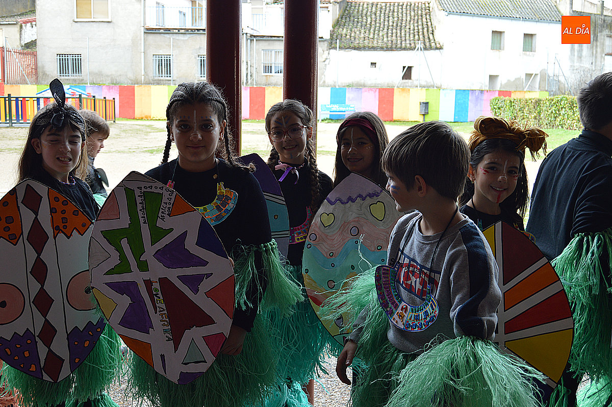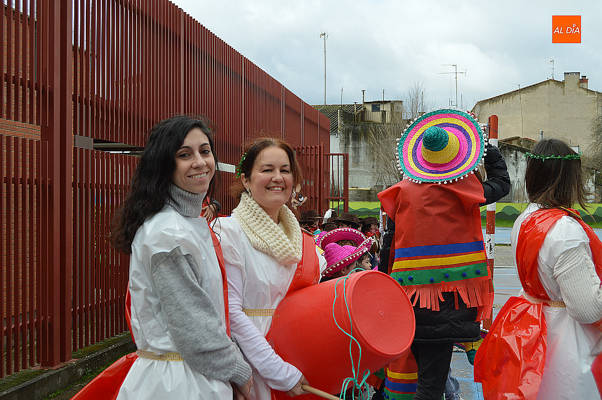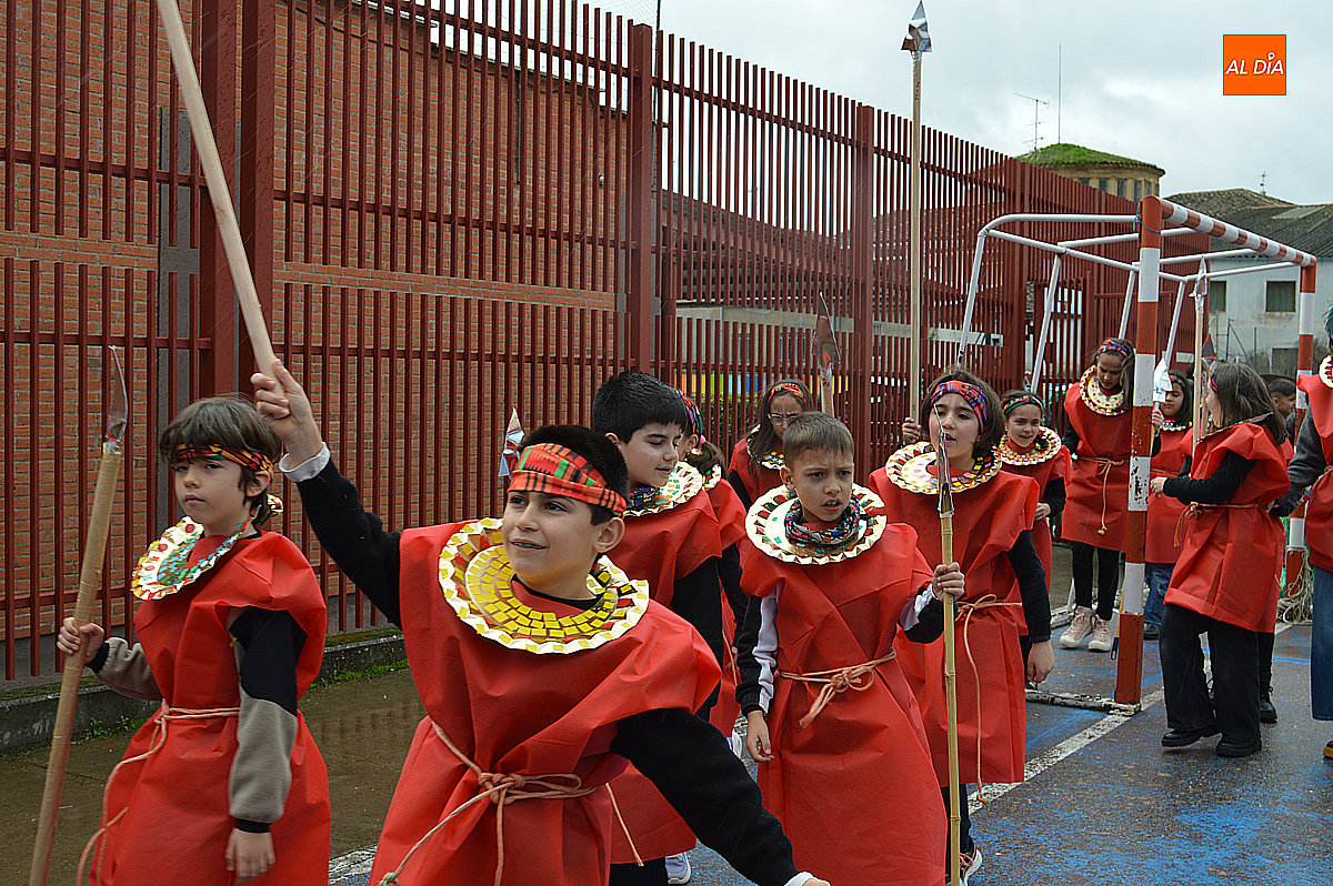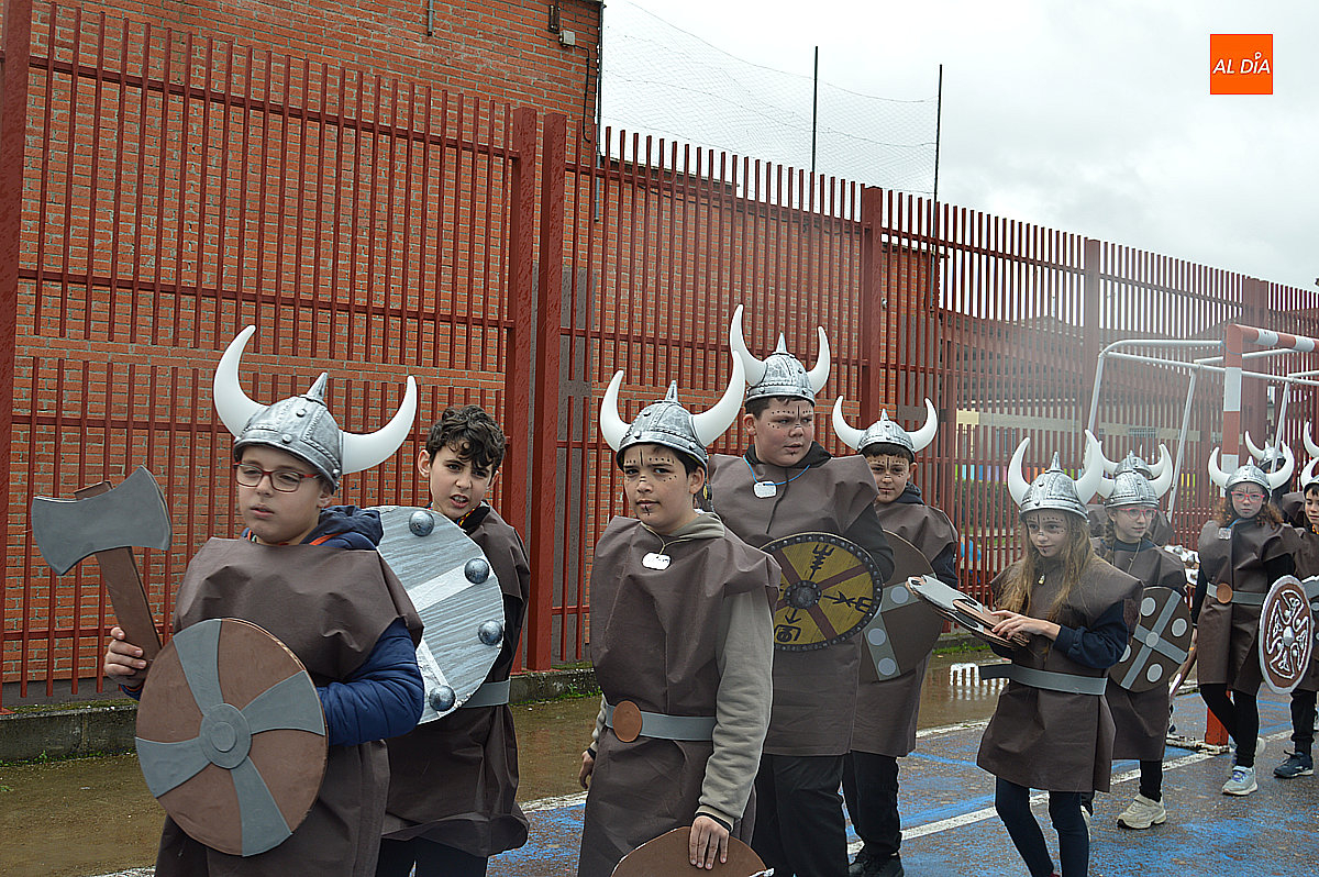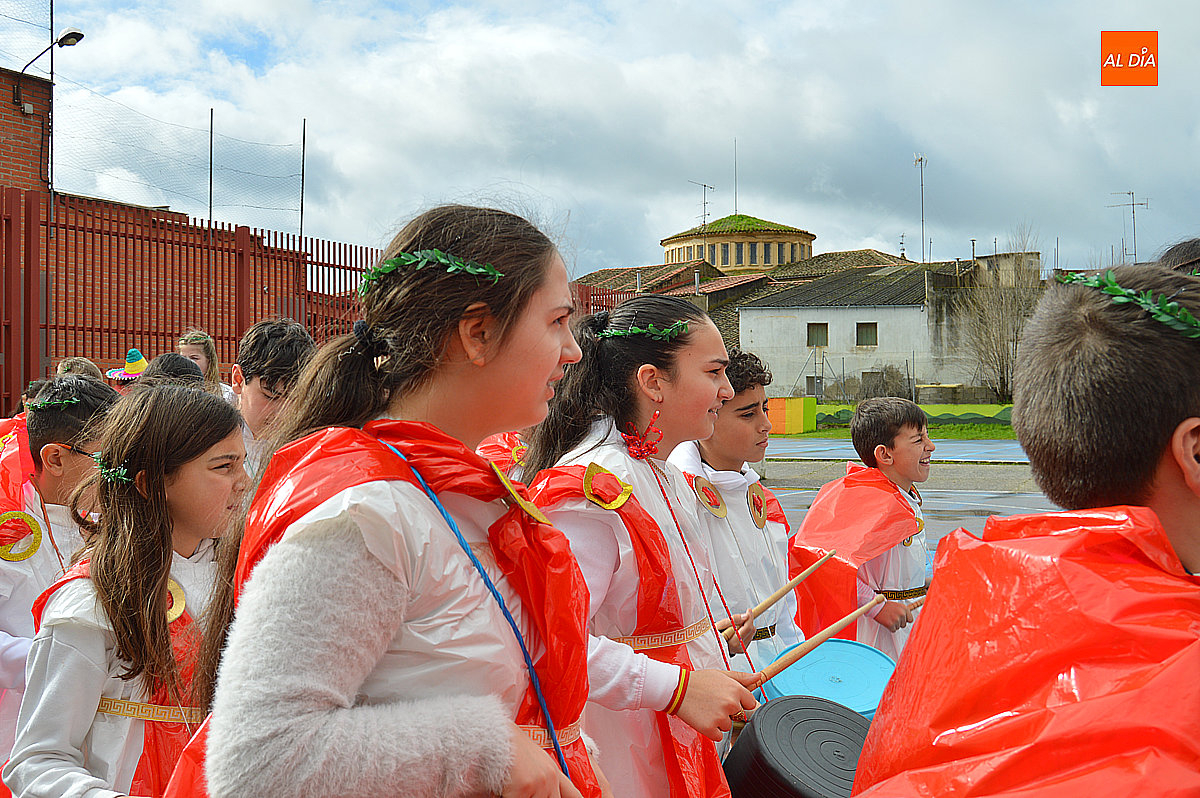 Aunque inicialmente estaba previsto que el desfile recorriera las calles de la localidad hasta la Plaza de Toros, las inclemencias del tiempo obligaron a modificar el itinerario. Sin embargo, la lluvia no frenó las ganas de disfrutar de la jornada y de mostrar sus disfraces. El patio del colegio se transformó en pasarela improvisada por la que fueron desfilando los distintos cursos para mostrar sus creativos y originales disfraces, muchos de ellos elaborados con materiales reciclados.