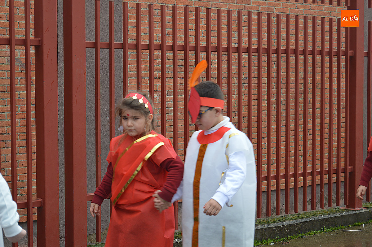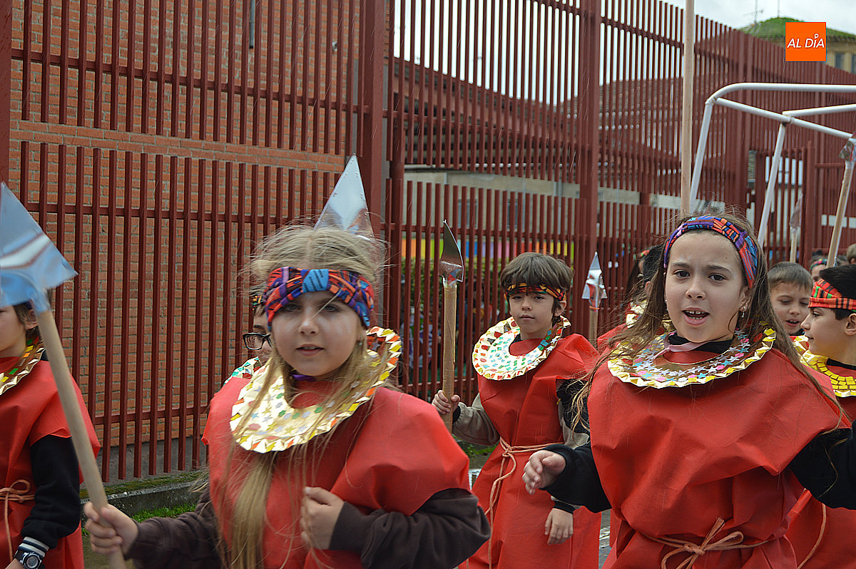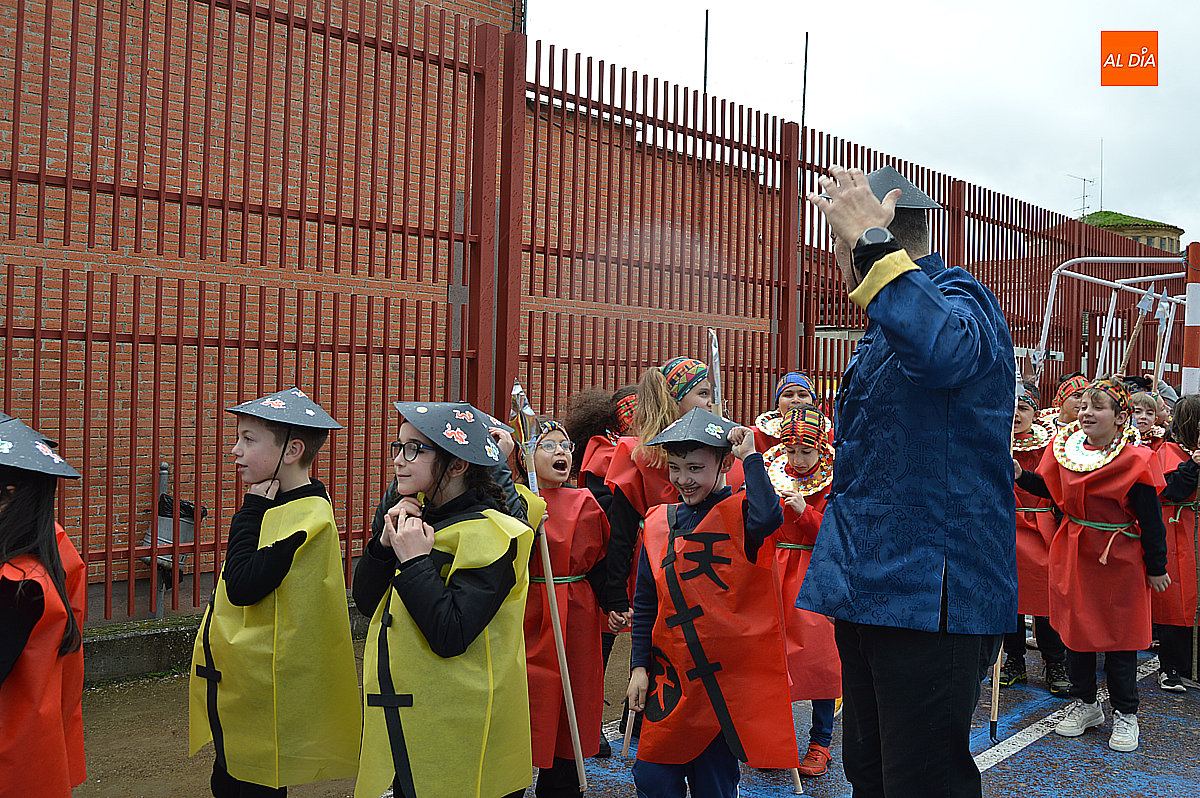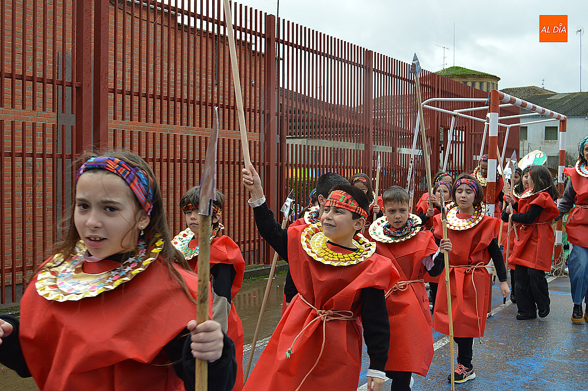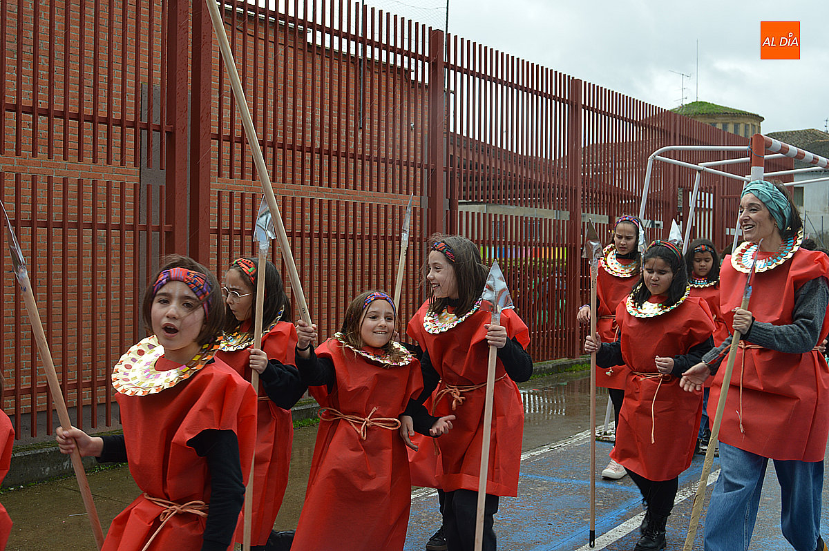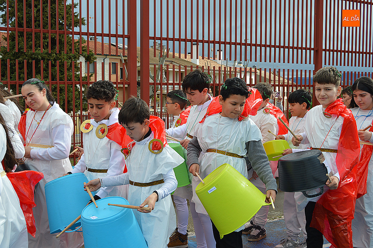 Aunque inicialmente estaba previsto que el desfile recorriera las calles de la localidad hasta la Plaza de Toros, las inclemencias del tiempo obligaron a modificar el itinerario. Sin embargo, la lluvia no frenó las ganas de disfrutar de la jornada y de mostrar sus disfraces. El patio del colegio se transformó en pasarela improvisada por la que fueron desfilando los distintos cursos para mostrar sus creativos y originales disfraces, muchos de ellos elaborados con materiales reciclados.