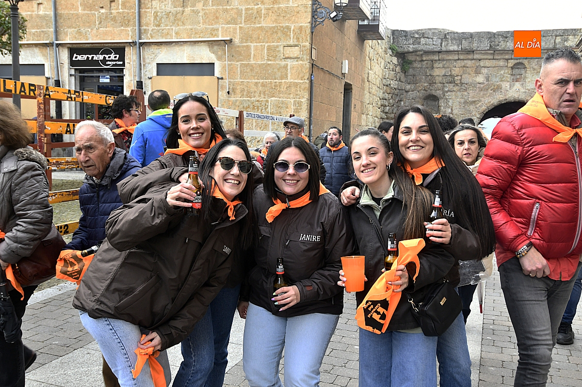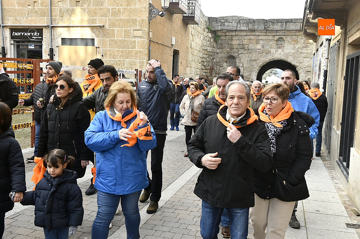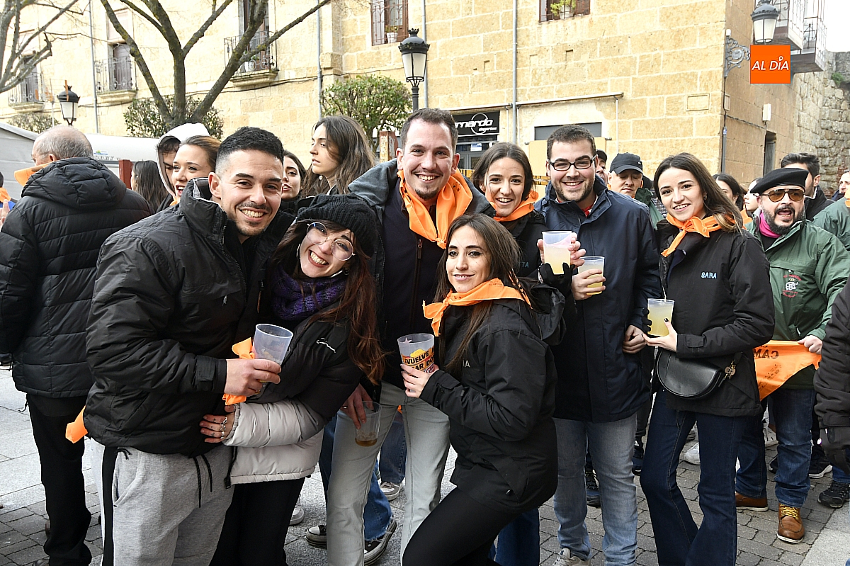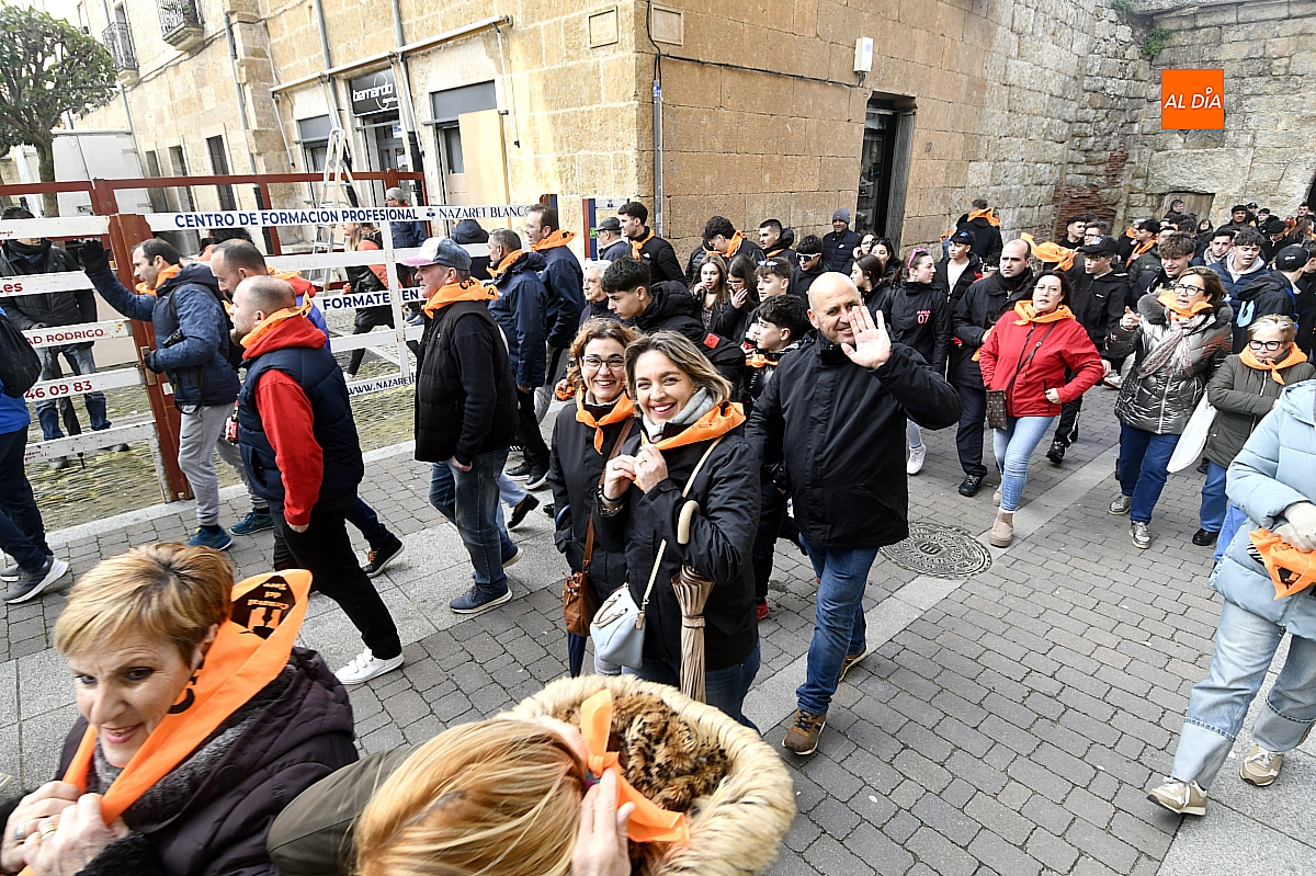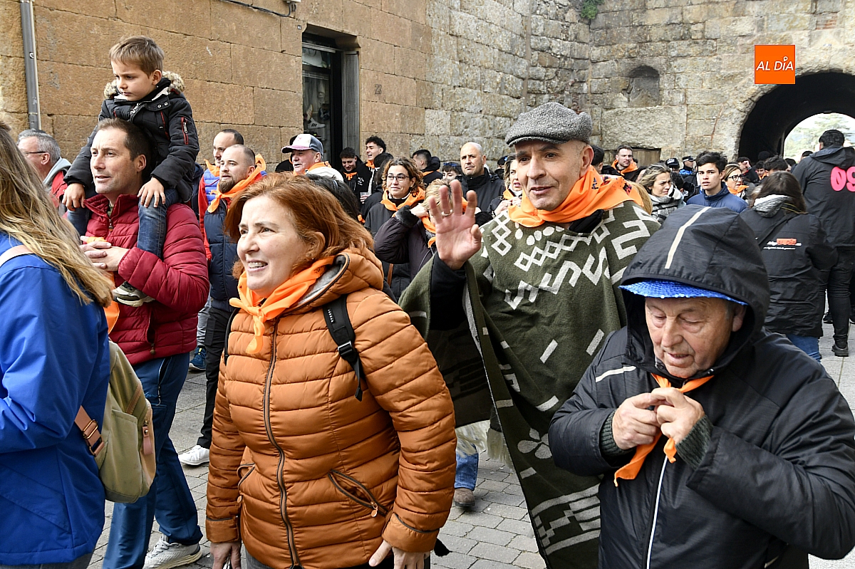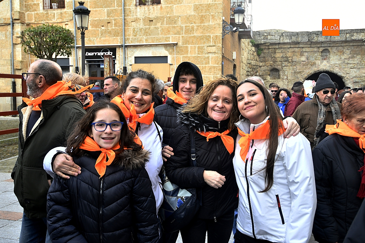 Miles de mirobrigenses y forasteros se concentraban en el registro a las cinco de la tarde para recoger su panuelo naranja, peñas, familas y amigos continauron la marcha hasta la Plaza Mayor llenándola de color naranja y dándose calor en la fría tarde de invierno, aguantando la lluvia y el viento que tampoco quería perderse la fiesta.