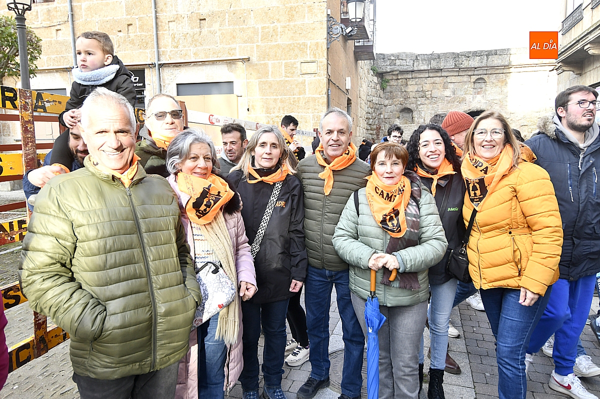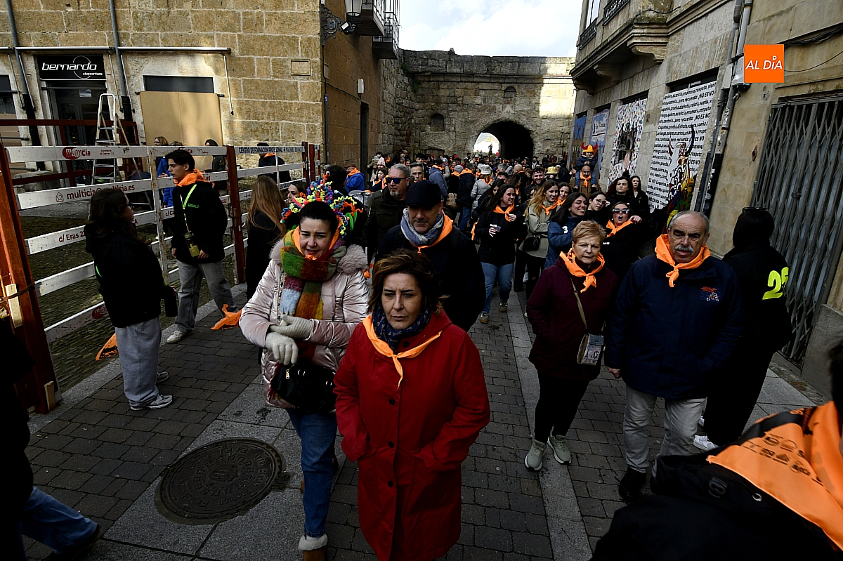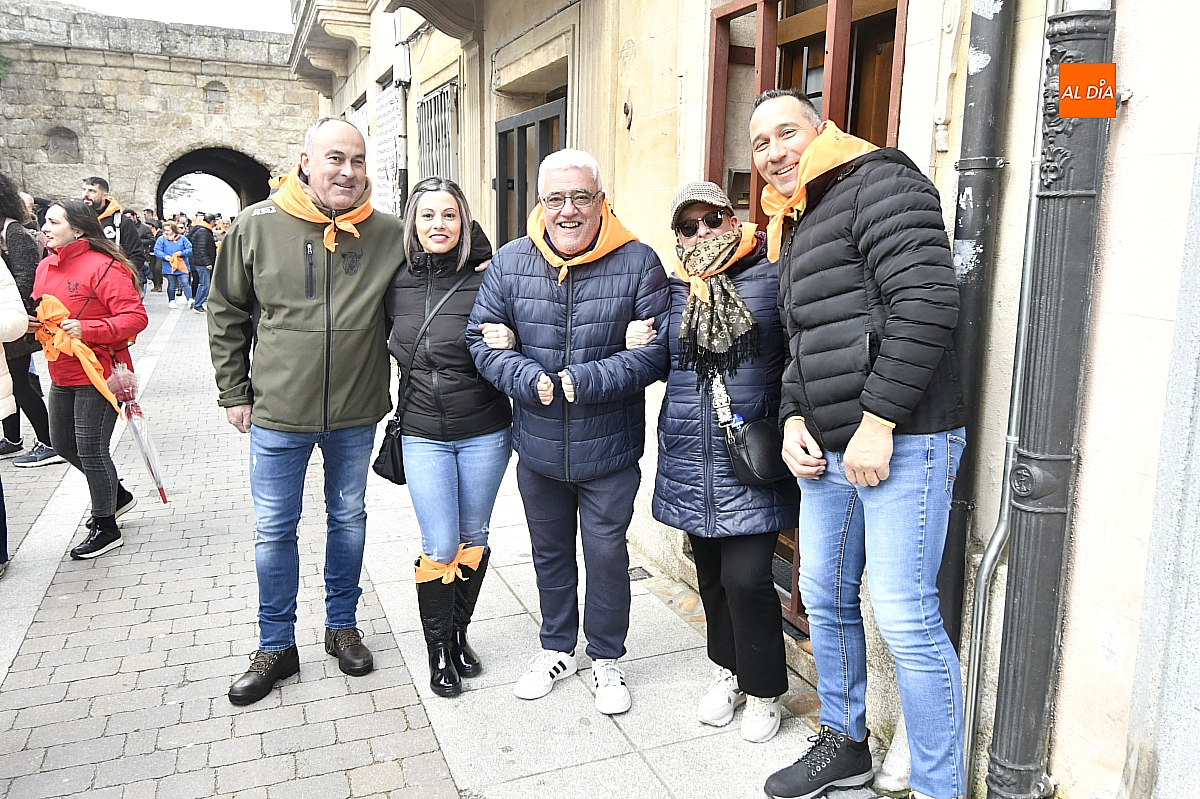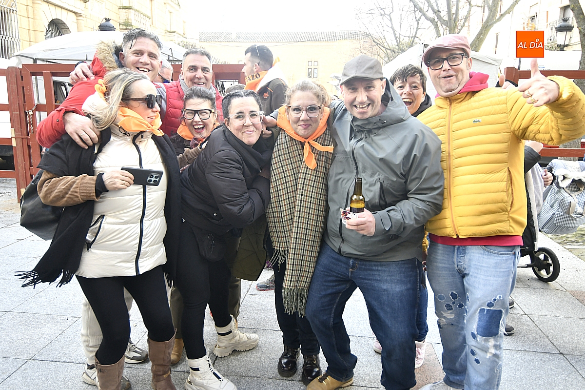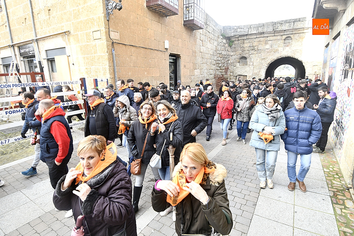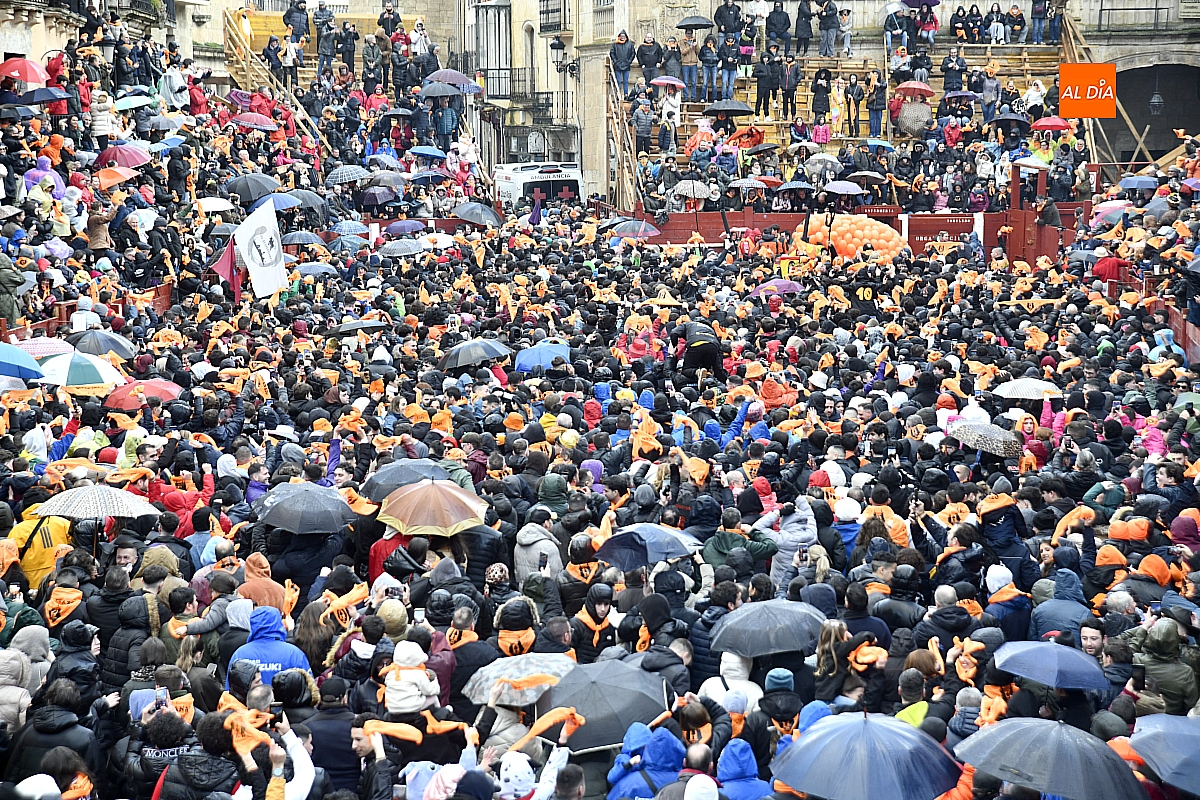 Miles de mirobrigenses y forasteros se concentraban en el registro a las cinco de la tarde para recoger su panuelo naranja, peñas, familas y amigos continauron la marcha hasta la Plaza Mayor llenándola de color naranja y dándose calor en la fría tarde de invierno, aguantando la lluvia y el viento que tampoco quería perderse la fiesta.
