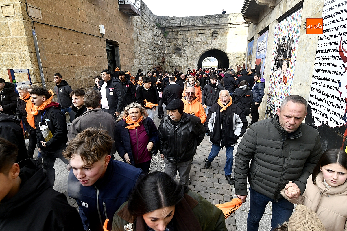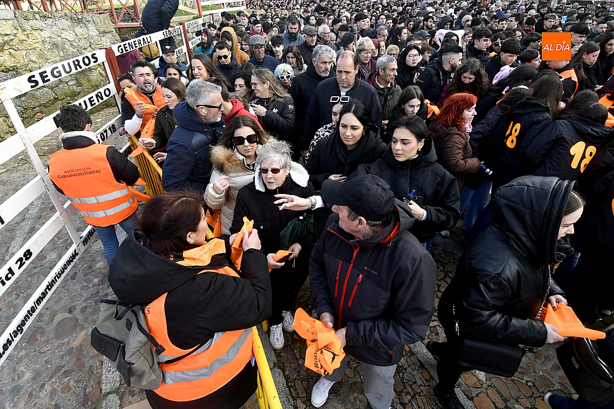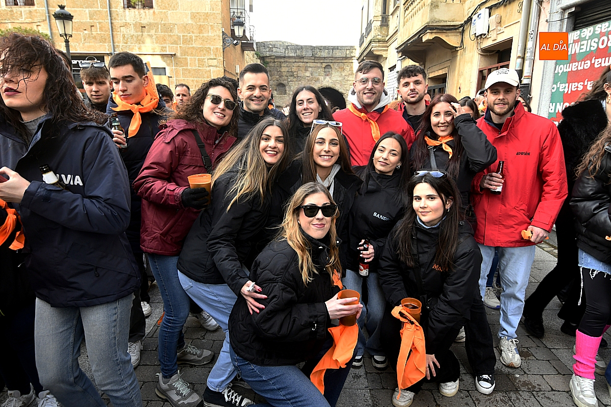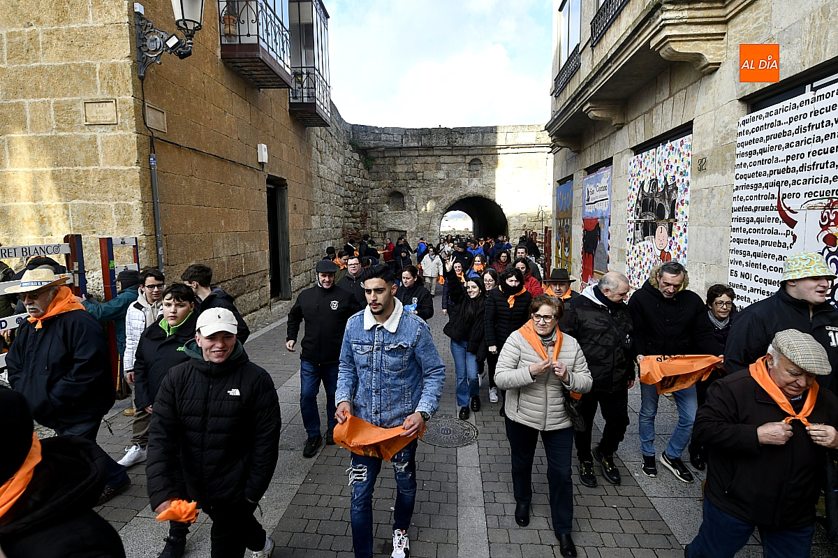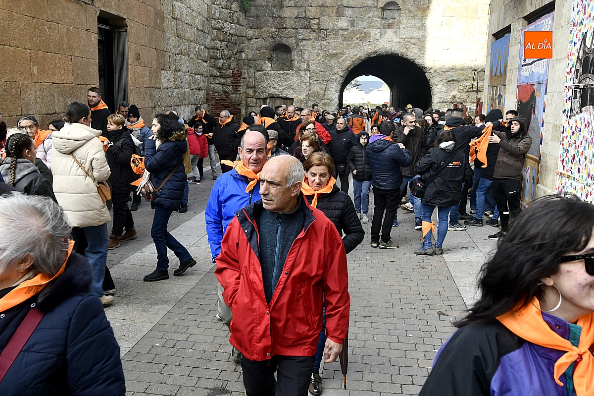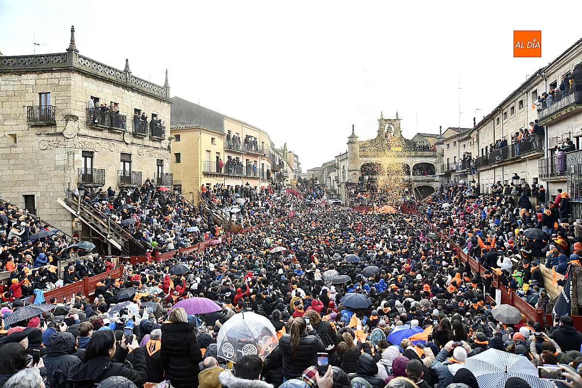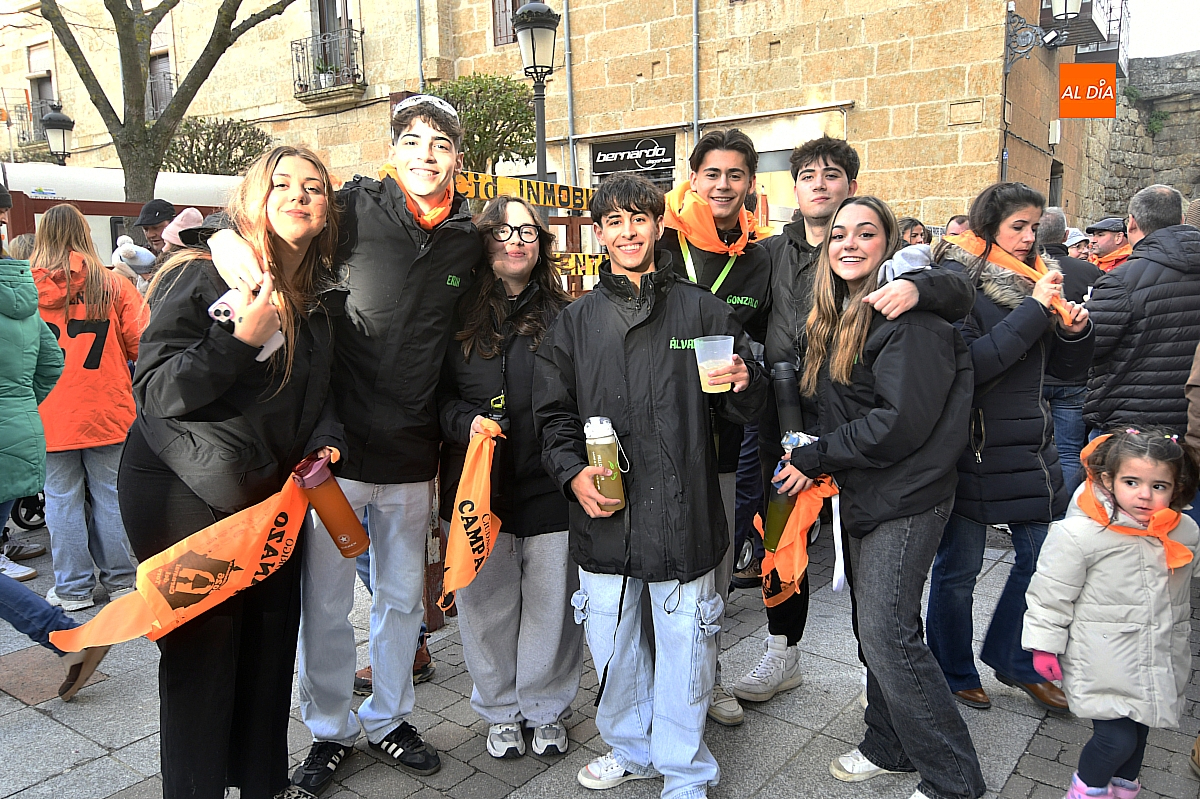 Miles de mirobrigenses y forasteros se concentraban en el registro a las cinco de la tarde para recoger su panuelo naranja, peñas, familas y amigos continauron la marcha hasta la Plaza Mayor llenándola de color naranja y dándose calor en la fría tarde de invierno, aguantando la lluvia y el viento que tampoco quería perderse la fiesta.
