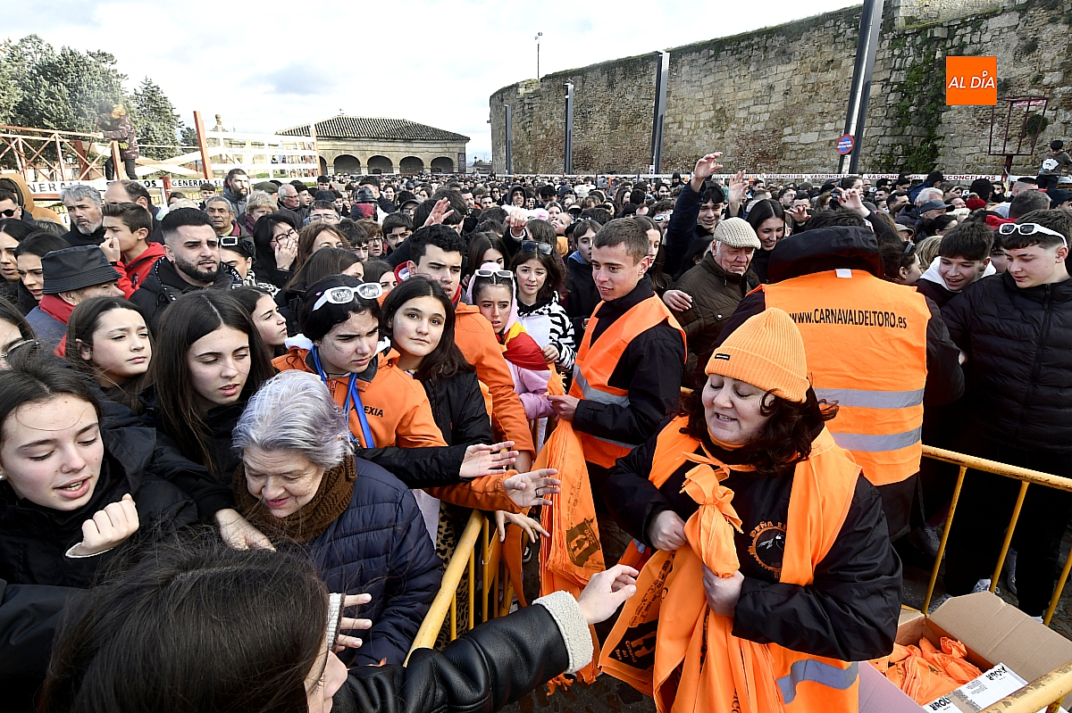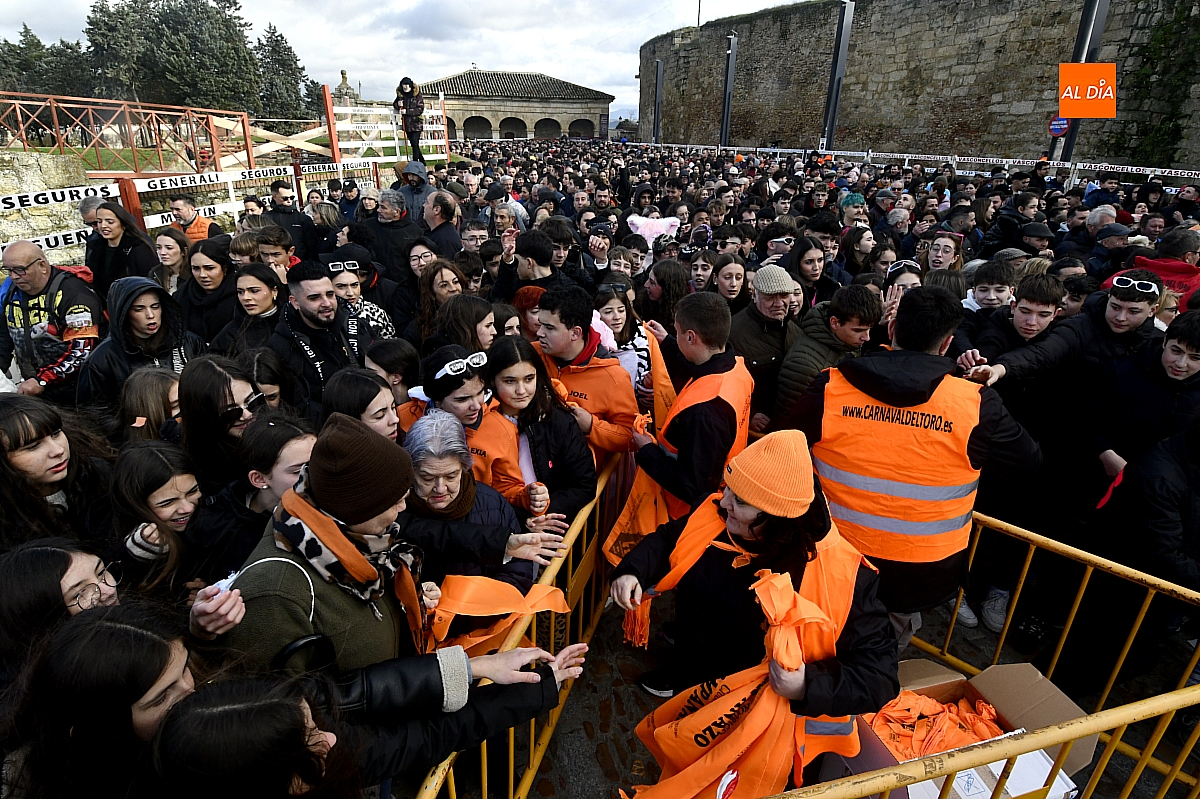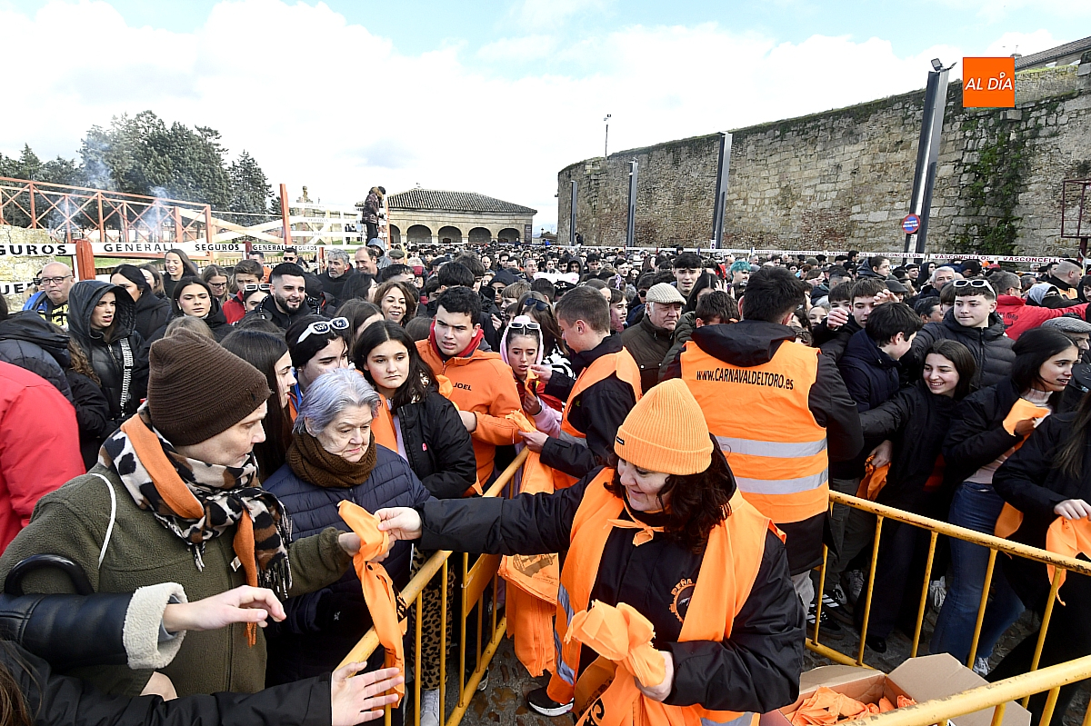 El color farinato ha logrado imponerse al gris del cielo gracias a la iniciativa de la Asociación Carnavaldeltoro.es. La entidad ha repartido un total de 10.000 pañuelos gratis, que ya lucen al cuello de la multitud, tiñendo de naranja el inicio de un ciclo taurino que se extenderá hasta el próximo martes.