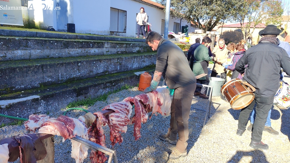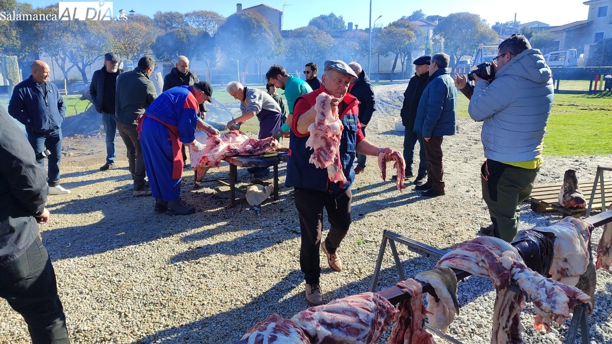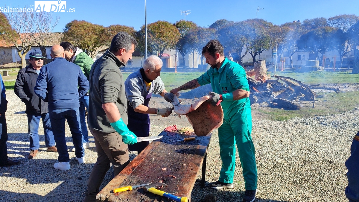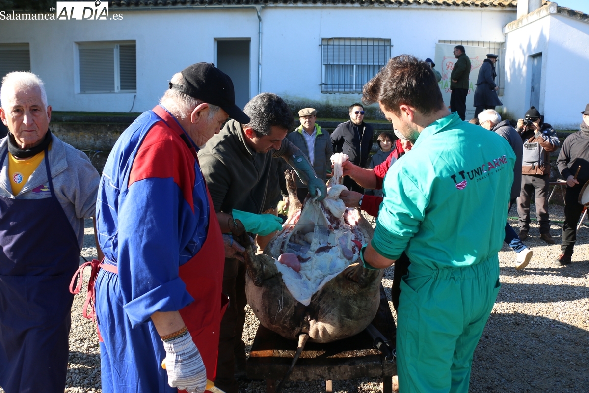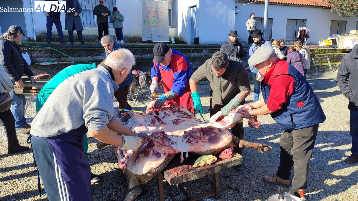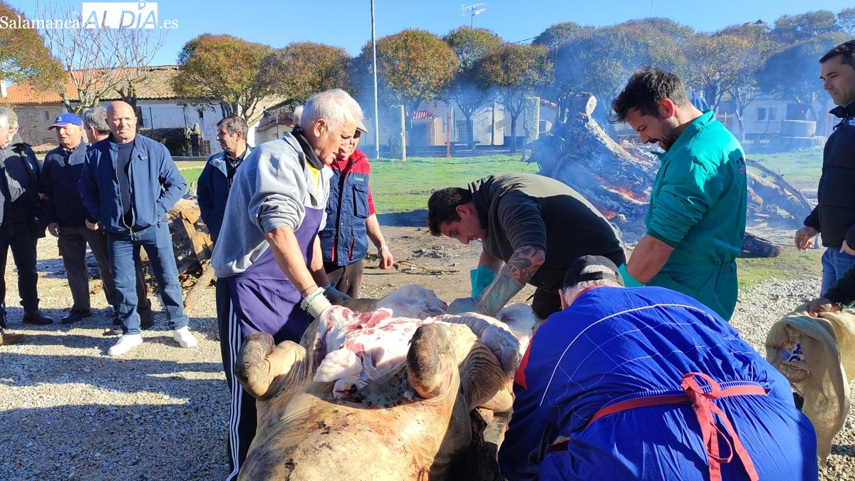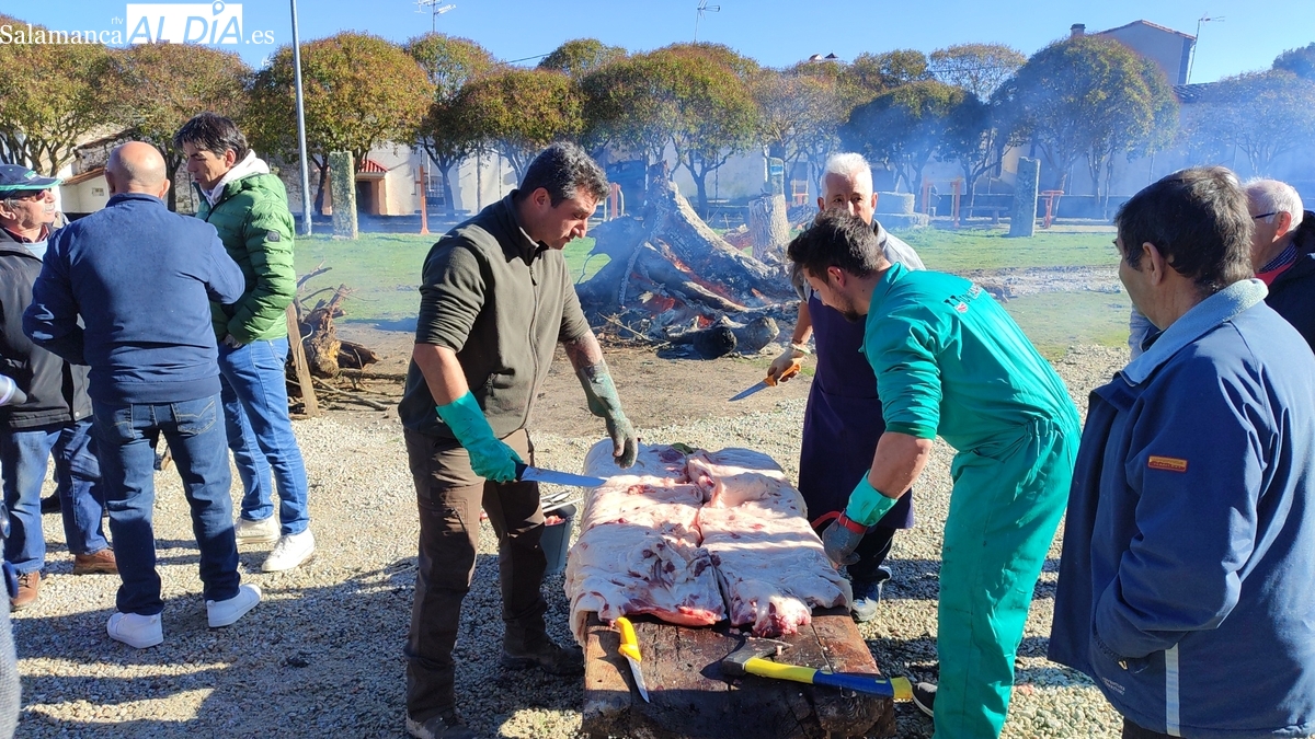 El protagonista de la jornada era una cerda de gran envergadura, con un peso aproximado de 300 kilos, casi 26 arrobas de cochina y donada, como viene siendo tradición, por el ganadero local Eloy Vaquero, conocido cariñosamente en el pueblo como Eloy ‘Trilla’. Un grupo de colaboradores locales, con Carlos a los mandos, se encargó del chamuscado y posterior despiece del animal, un proceso didáctico que fue narrado paso a paso por el pregonero matancero contratado por la Diputación de Salamanca, perteneciente al grupo Kamaru Teatro.
