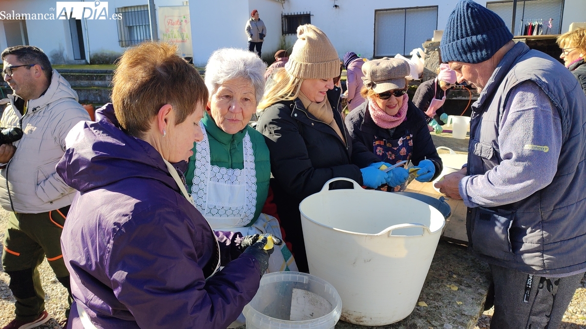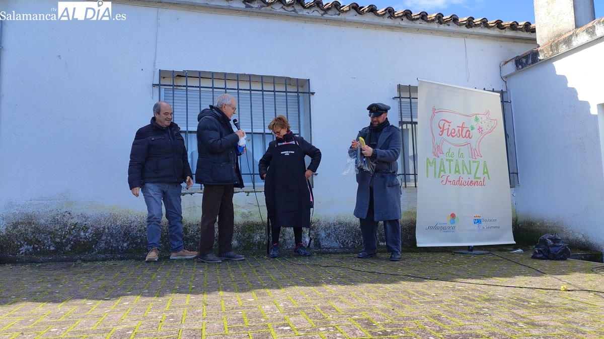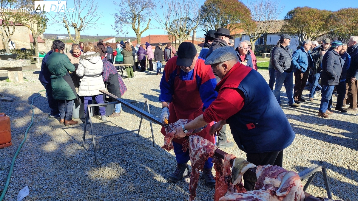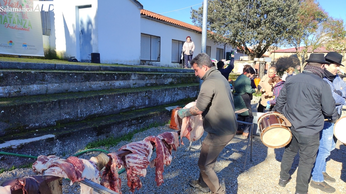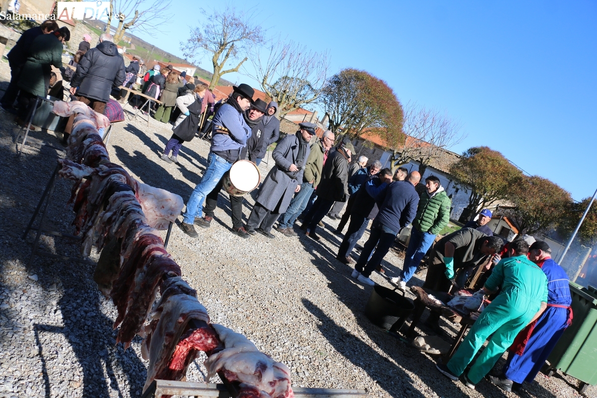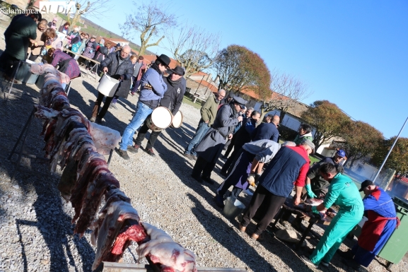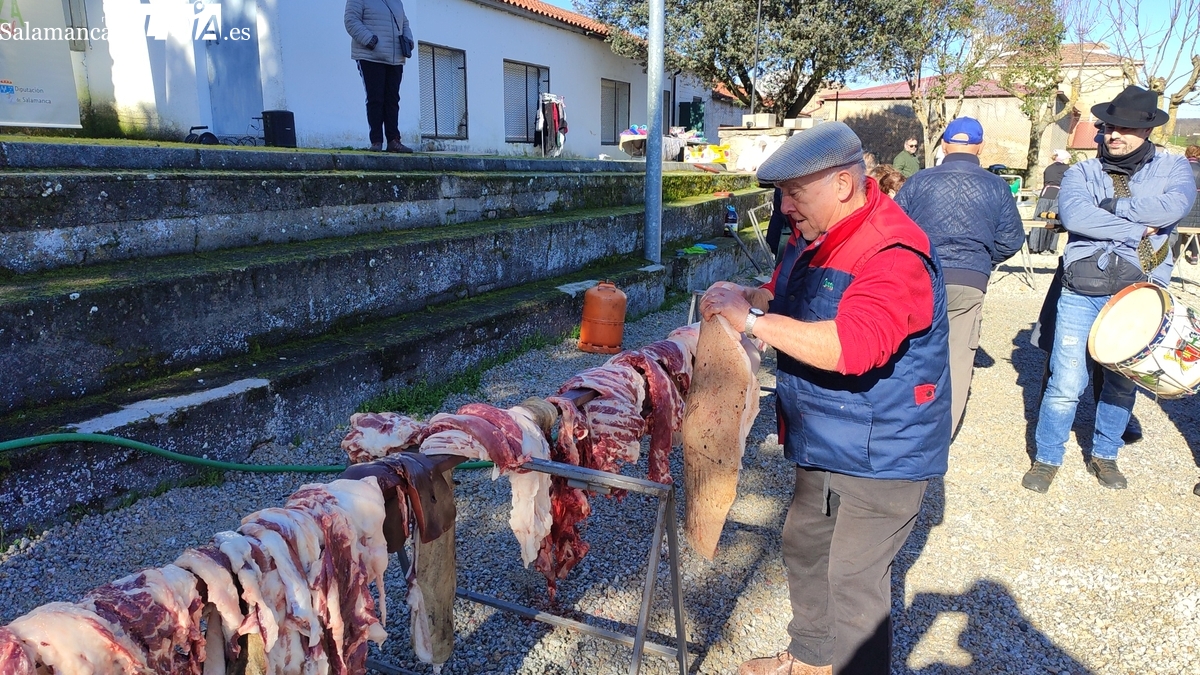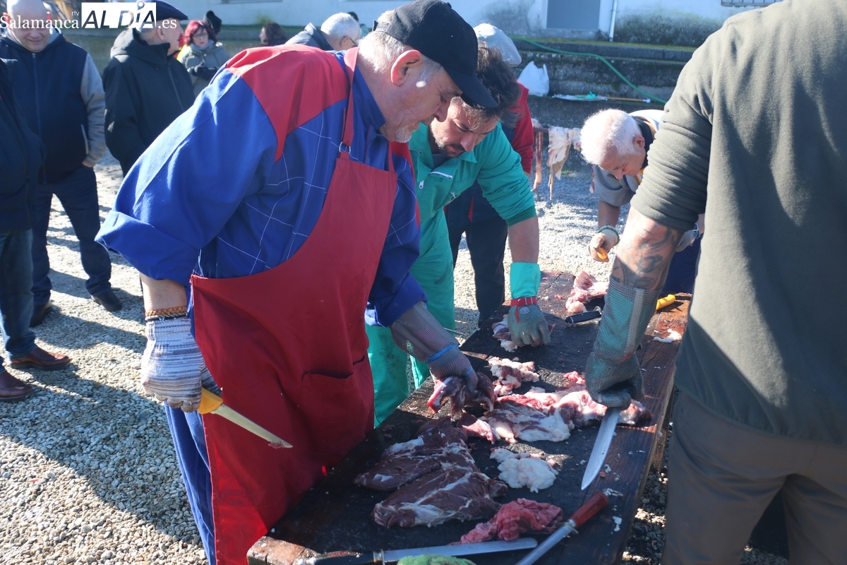 El protagonista de la jornada era una cerda de gran envergadura, con un peso aproximado de 300 kilos, casi 26 arrobas de cochina y donada, como viene siendo tradición, por el ganadero local Eloy Vaquero, conocido cariñosamente en el pueblo como Eloy ‘Trilla’. Un grupo de colaboradores locales, con Carlos a los mandos, se encargó del chamuscado y posterior despiece del animal, un proceso didáctico que fue narrado paso a paso por el pregonero matancero contratado por la Diputación de Salamanca, perteneciente al grupo Kamaru Teatro.
