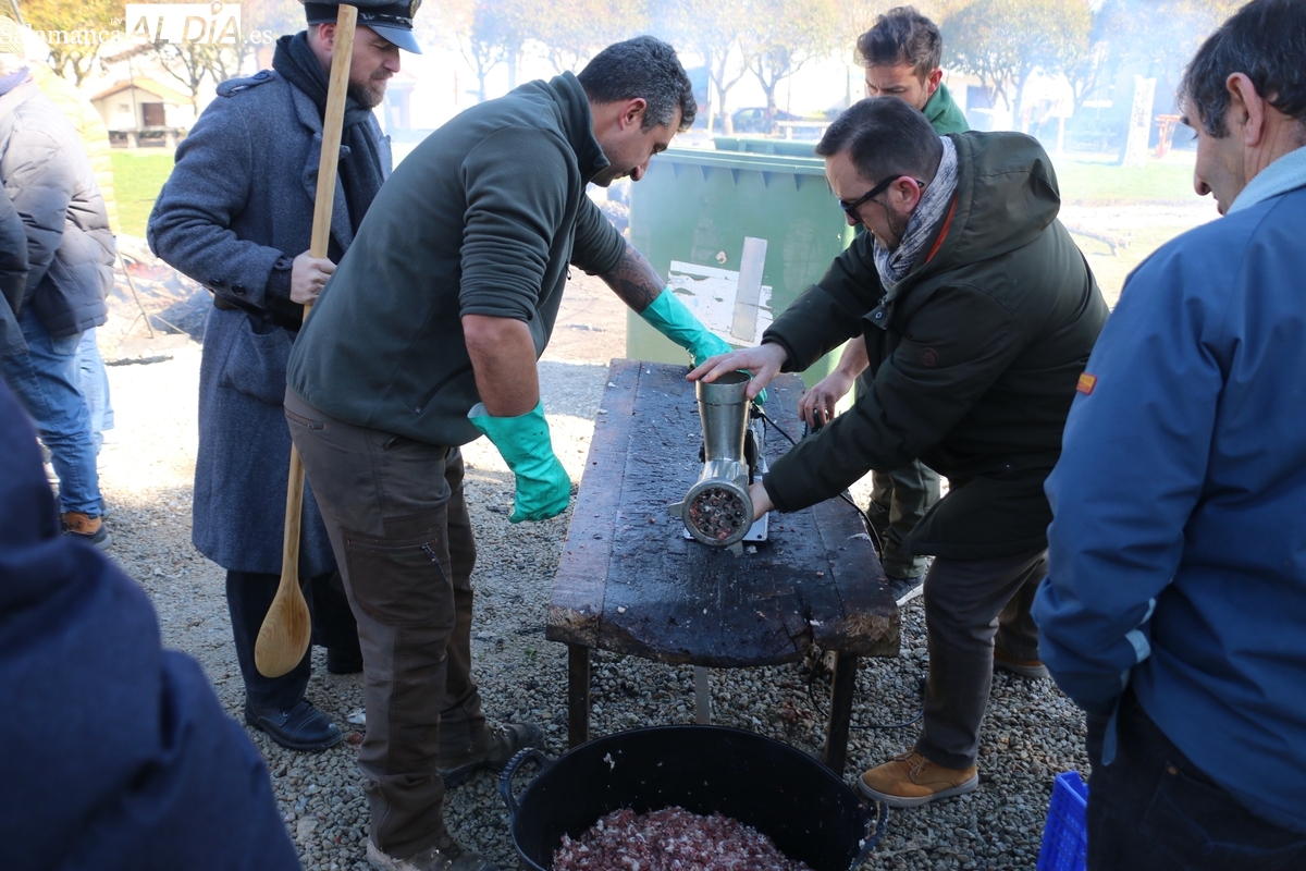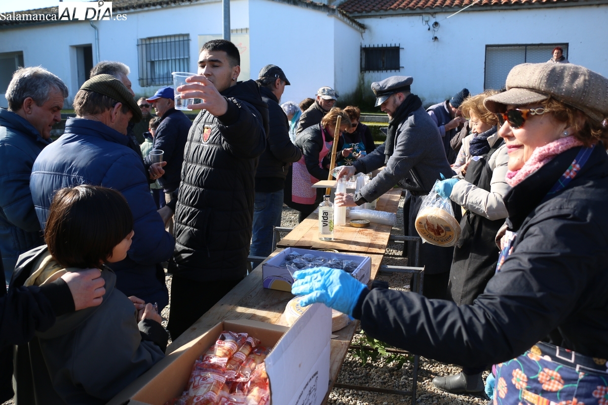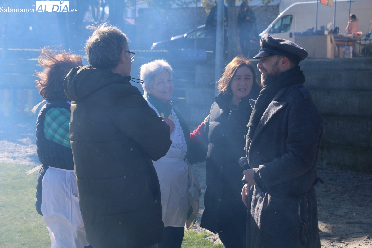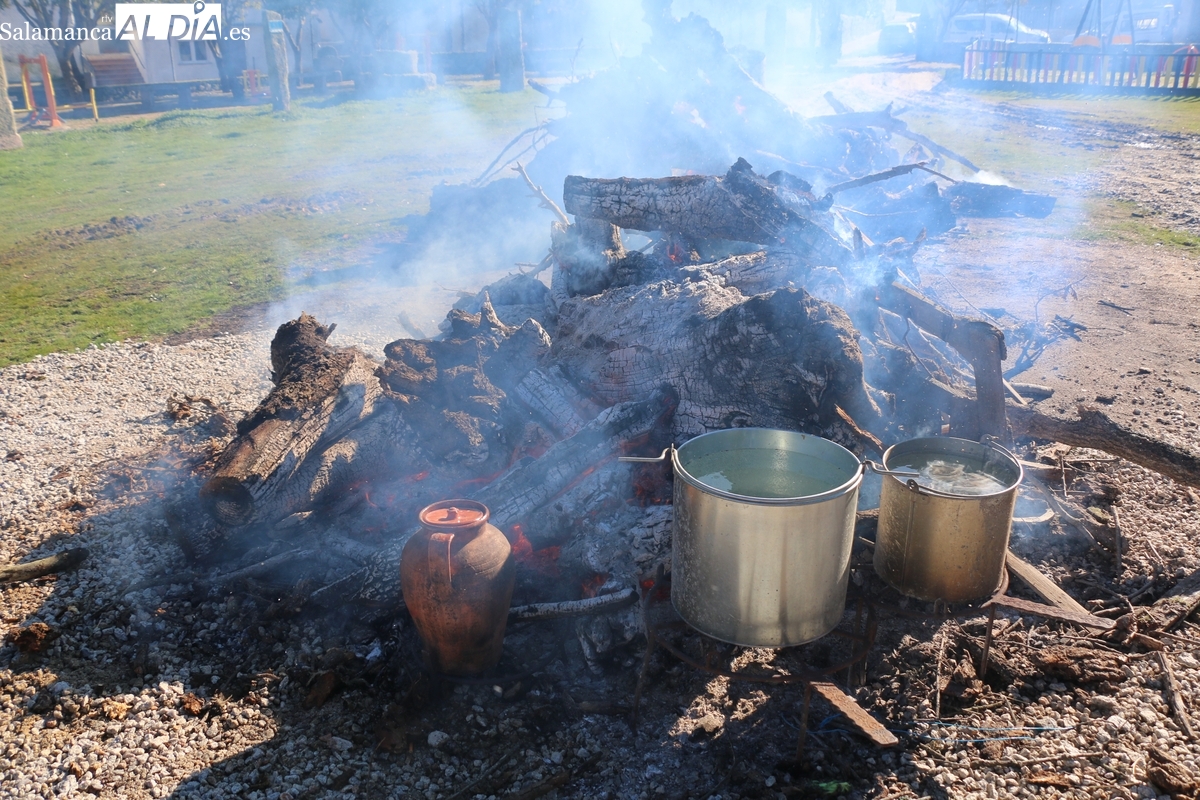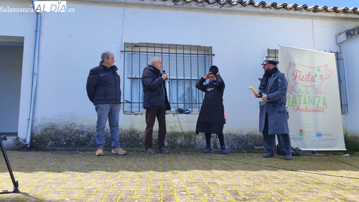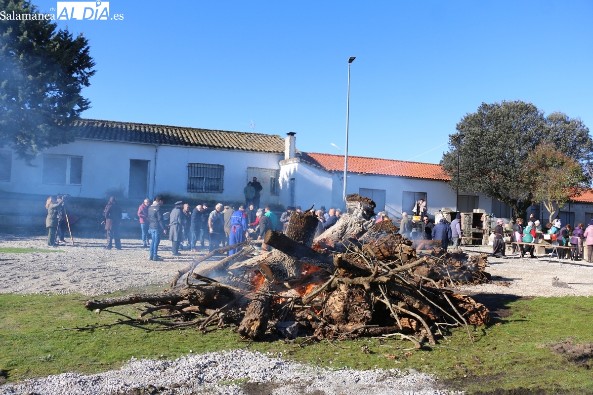 El protagonista de la jornada era una cerda de gran envergadura, con un peso aproximado de 300 kilos, casi 26 arrobas de cochina y donada, como viene siendo tradición, por el ganadero local Eloy Vaquero, conocido cariñosamente en el pueblo como Eloy ‘Trilla’. Un grupo de colaboradores locales, con Carlos a los mandos, se encargó del chamuscado y posterior despiece del animal, un proceso didáctico que fue narrado paso a paso por el pregonero matancero contratado por la Diputación de Salamanca, perteneciente al grupo Kamaru Teatro.