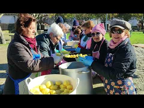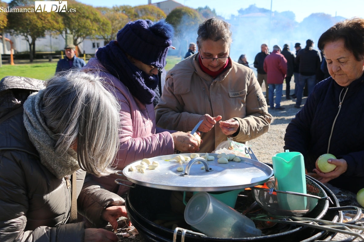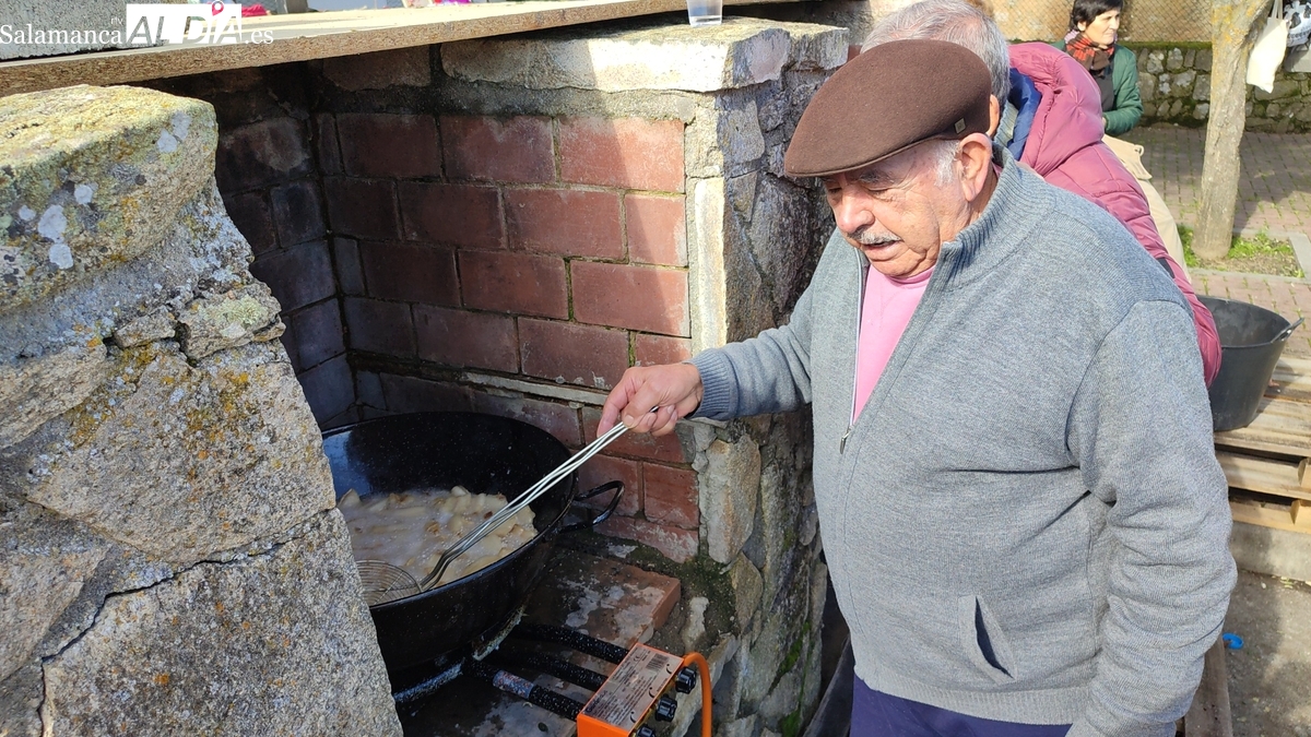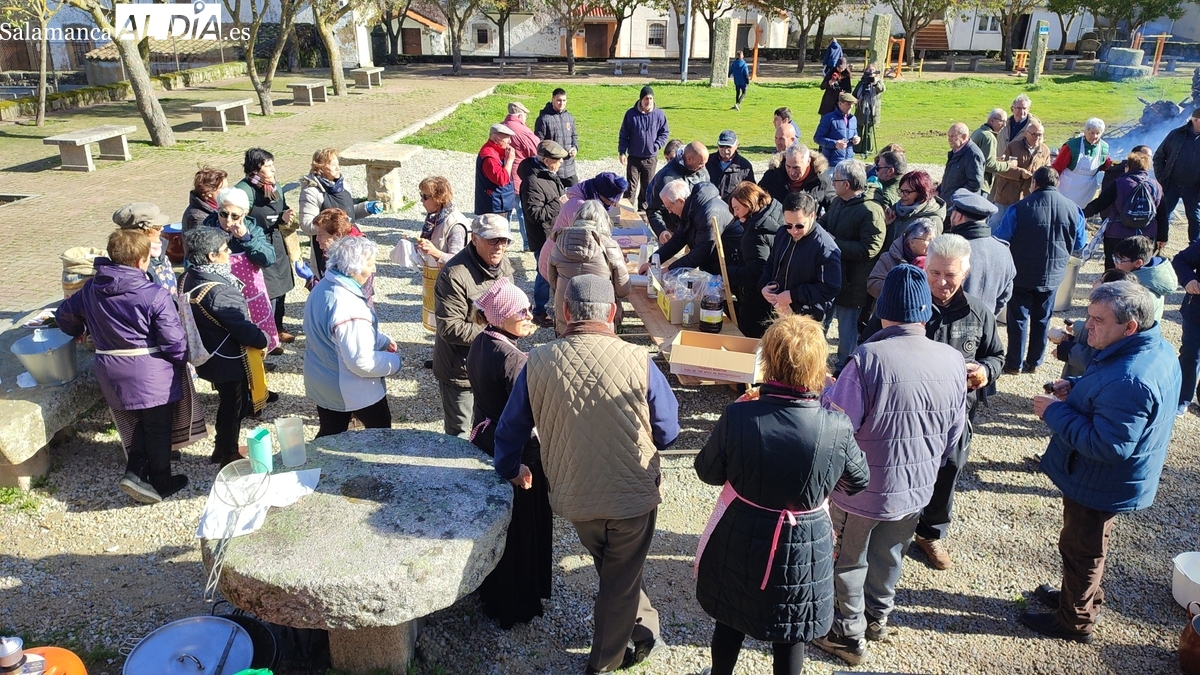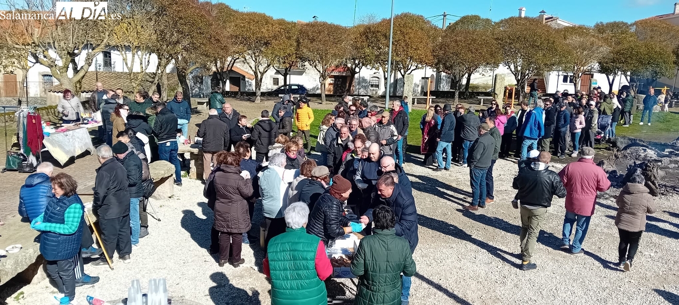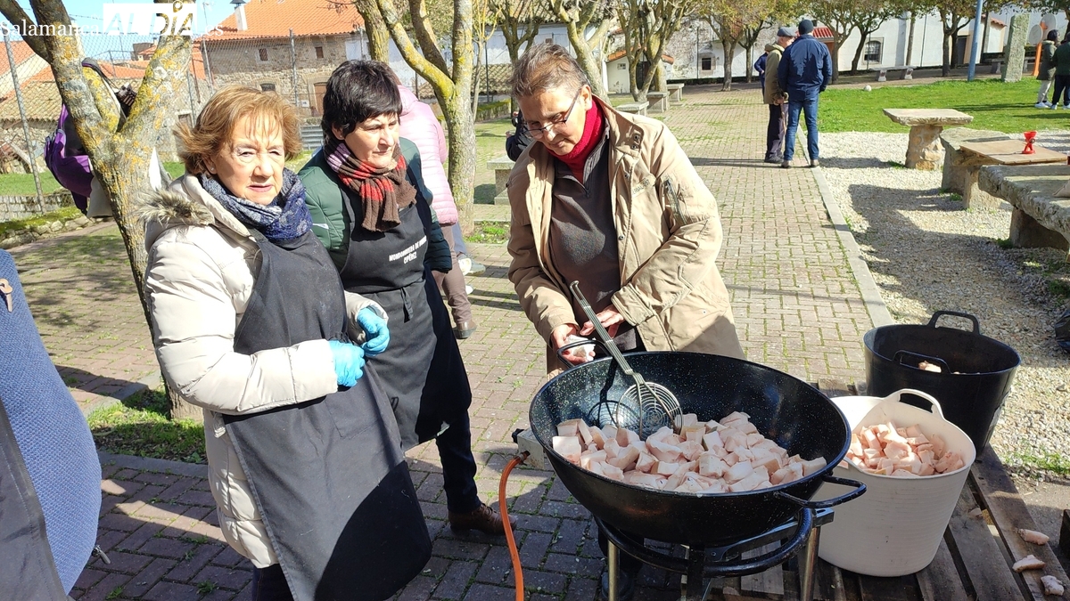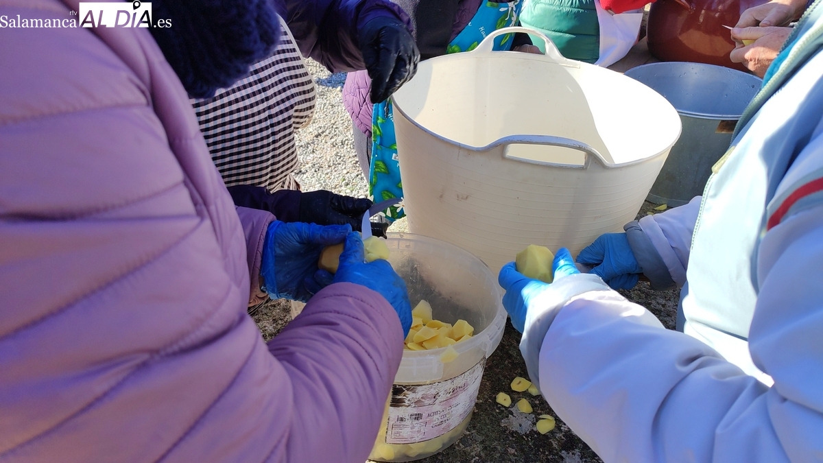 La vertiente gastronómica ha sido el otro pilar fundamental de la celebración. Mientras los hombres se encargaban del despiece del cerdo y de freír los torreznos, un amplio grupo de mujeres se ocupaba de pelar y preparar los 150 kilos de patatas necesarios para la comida. El menú consistió en las tradicionales patatas meneás acompañadas de torreznos, chichas, hígado encebollado y otras partes del cerdo. La organización estimó la preparación de comida para unas 400 personas, reafirmando el carácter gratuito y hospitalario del evento. "Aquí ni se subasta nada, ni se vende nada, todo es gratis para quien quiera venir", enfatizó el alcalde.