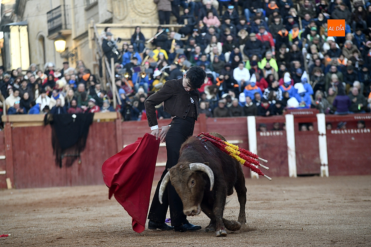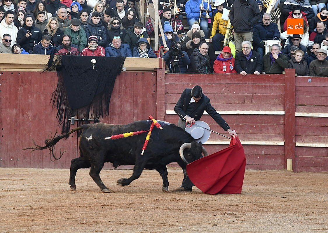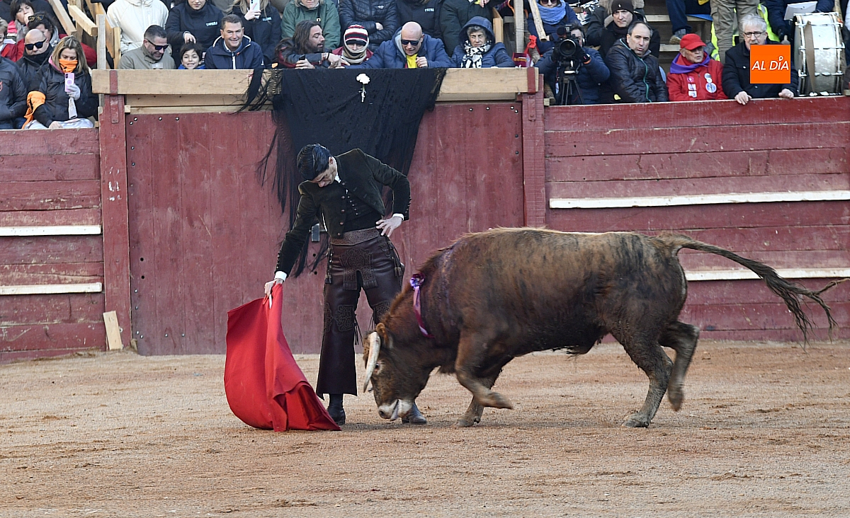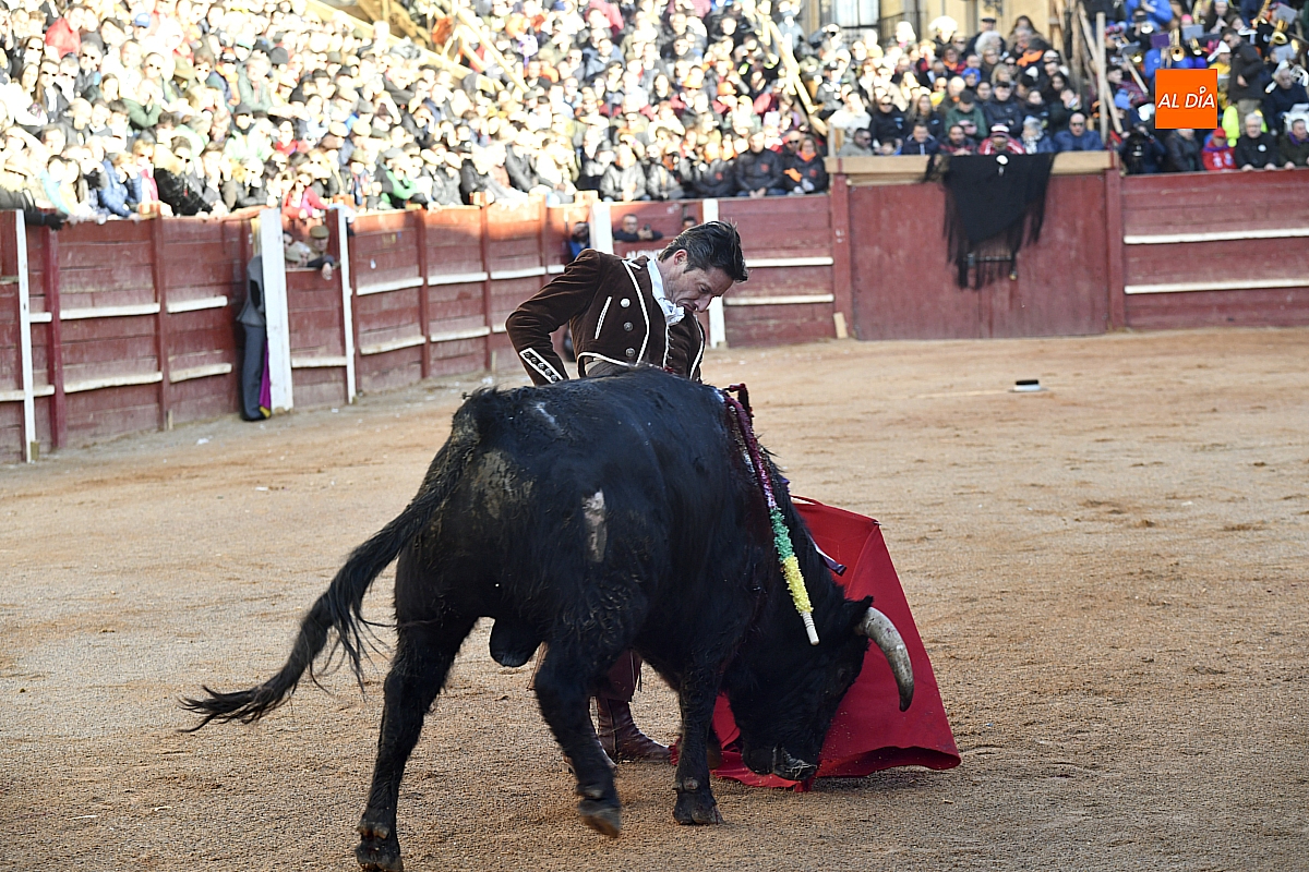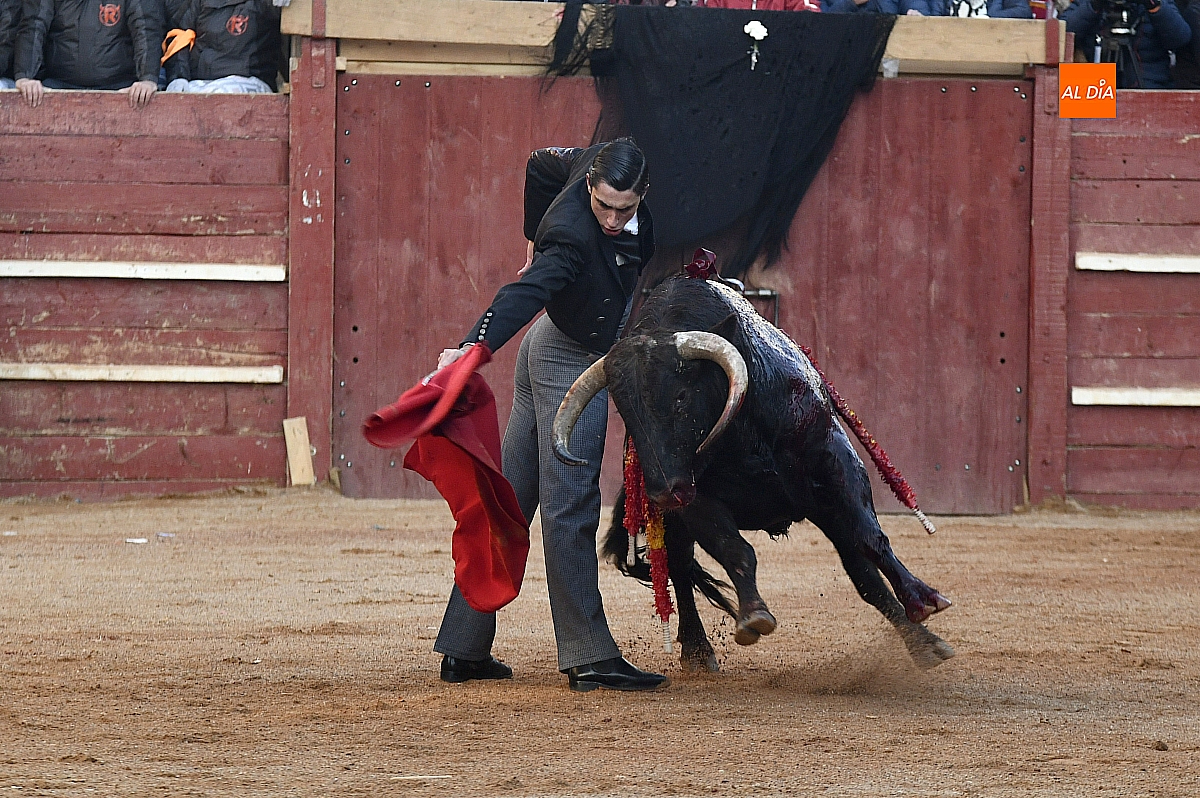 Cambiando el tercio, el riojano cogió el sombrero y desde el centro del ruedo brindó al cielo a la memoria de Taquio, de nuevo con un silencio conmovedor. Inmediatamente, con parsimonia se fue al distraído torete y, siempre con el inconveniente del viento, tuvo los mejores momentos sobre el pitón izquierdo, que era el bueno; por el otro no tuvo un pase, dejando detalles de la exquisitez de su sello. Mató de estocada y paseó una oreja.