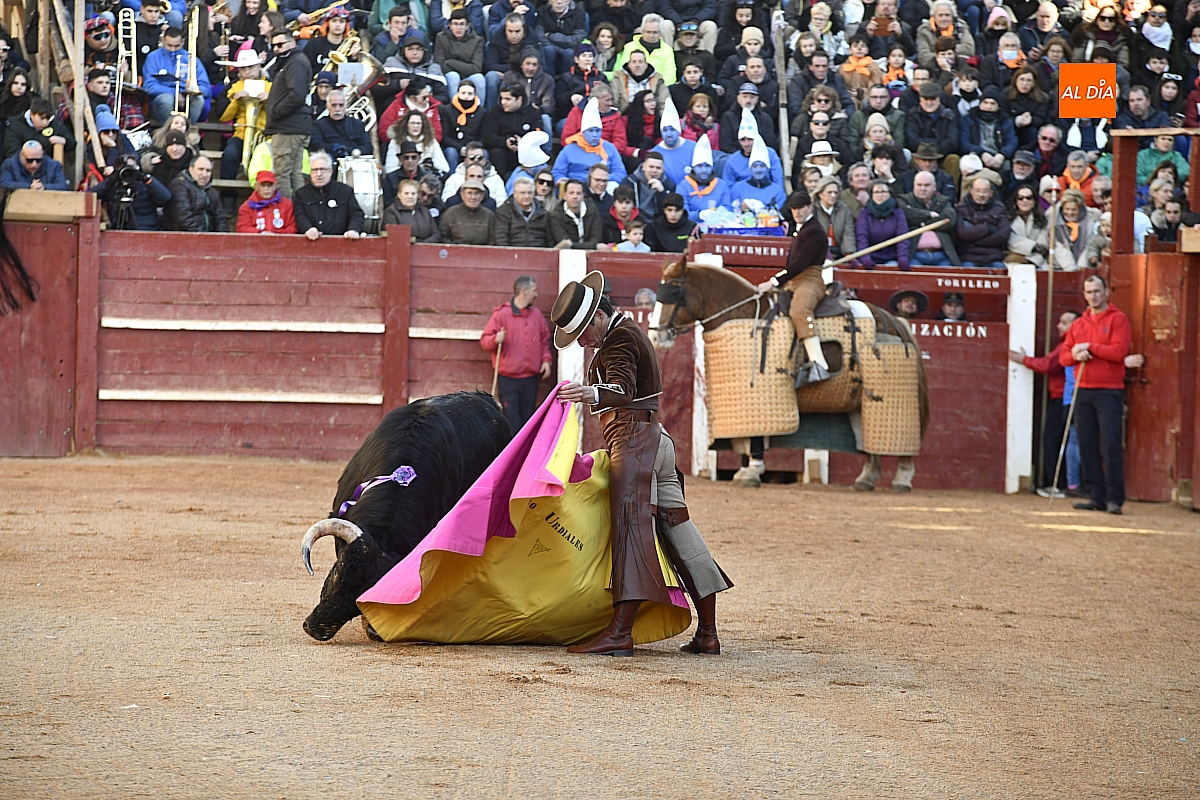 Finalizado el sobrecogedor minuto de silencio comenzó el festejo y salió el primer utrero de Talavante, quien este carnaval ha sido pregonero, ganadero y torero, que enseguida mostró su escasa condición en el capote de Diego Urdiales —que lució zajones— y además con el viento molestando mucho, lo que posibilitó que el saludo de capa se limitase a un par de lances de bella ejecución.