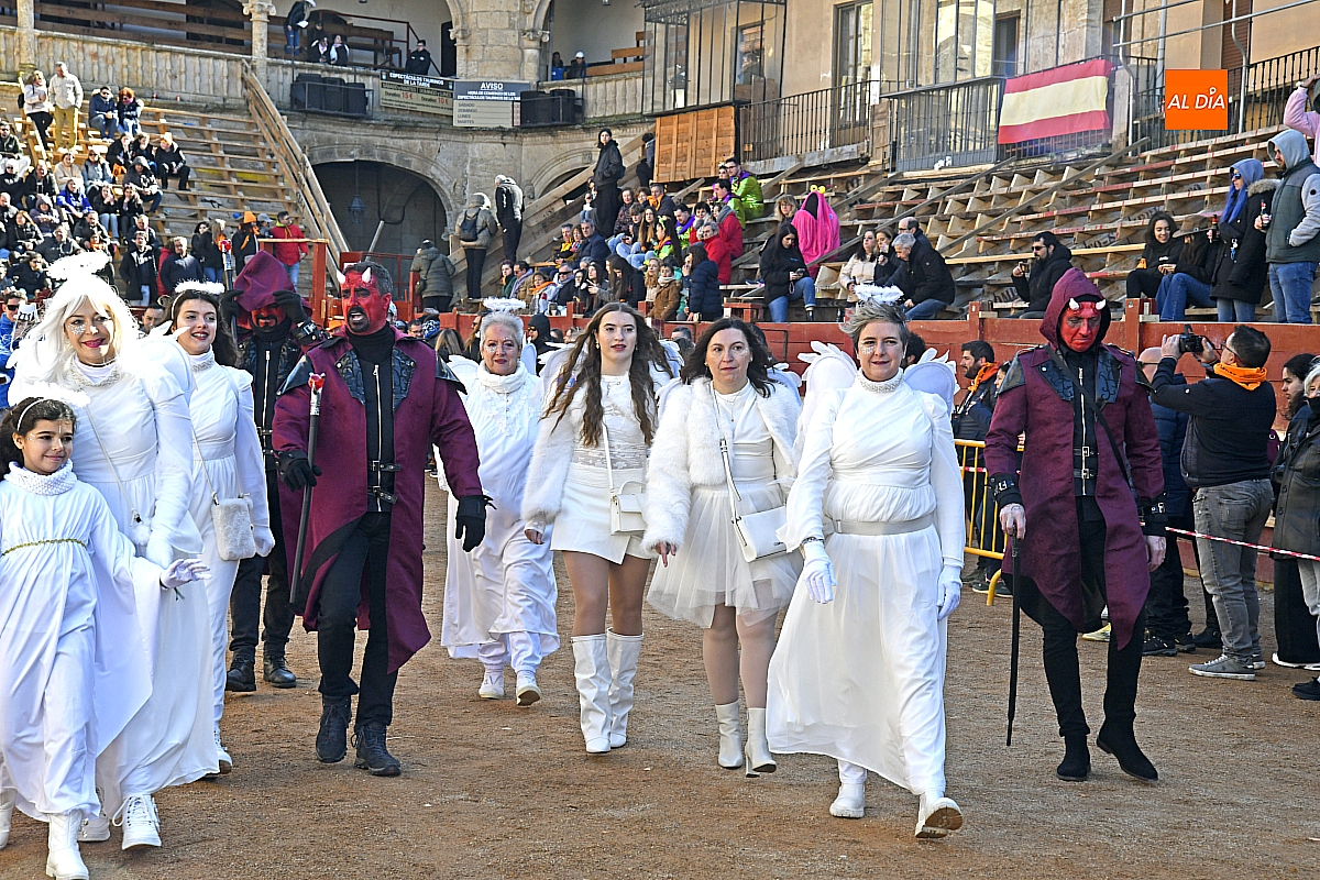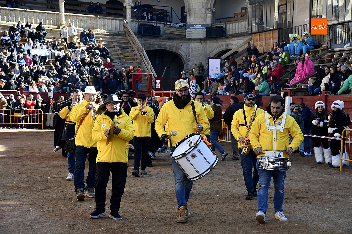 Además, el desfile de disfraces estuvo acompañado por las charangas Manliao, Santa Ana y Al Rojo, que pusieron ritmo y animación a otro desfile de disfraces que volvió a llenar de color y alegría el coso taurino.