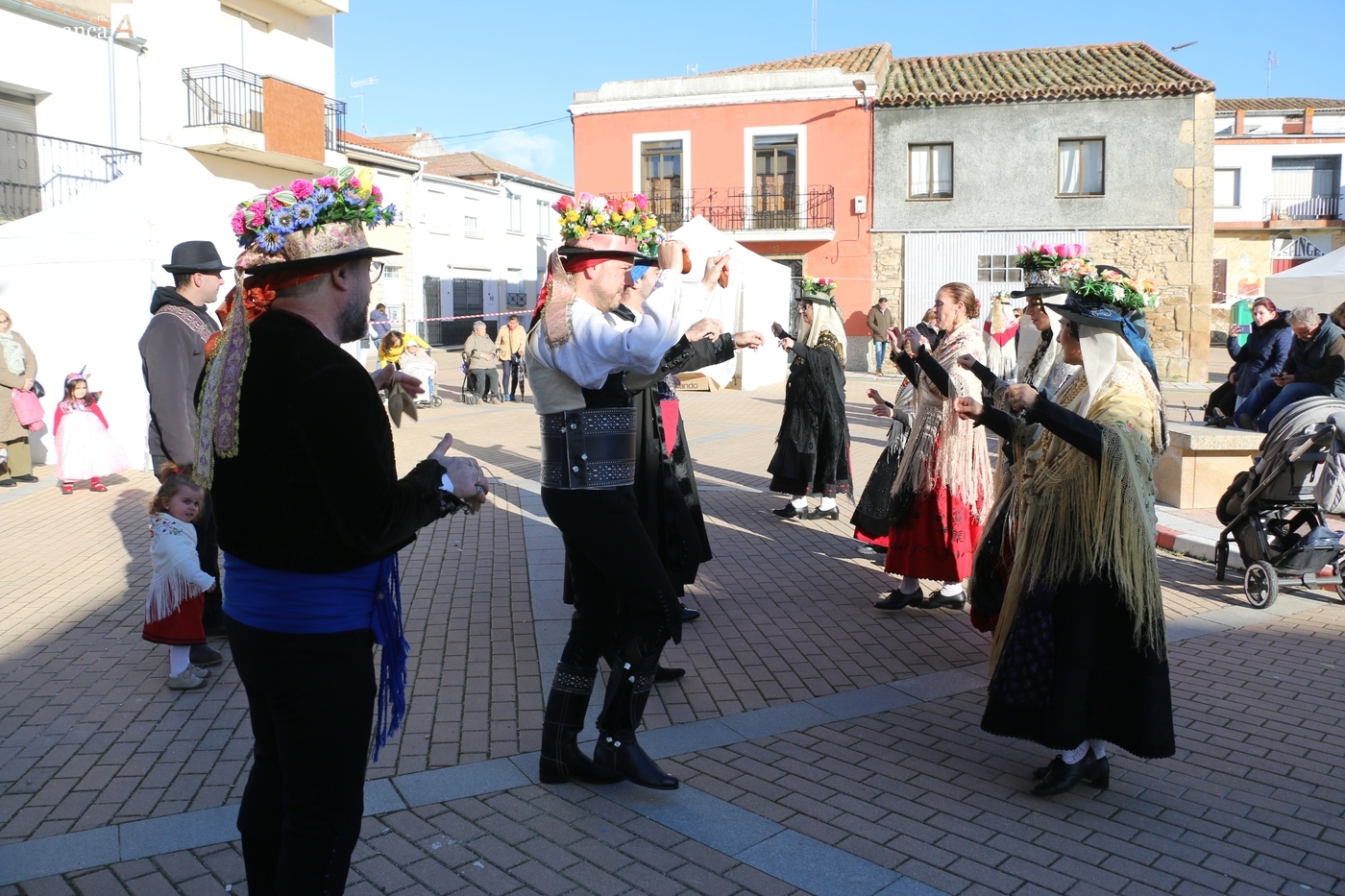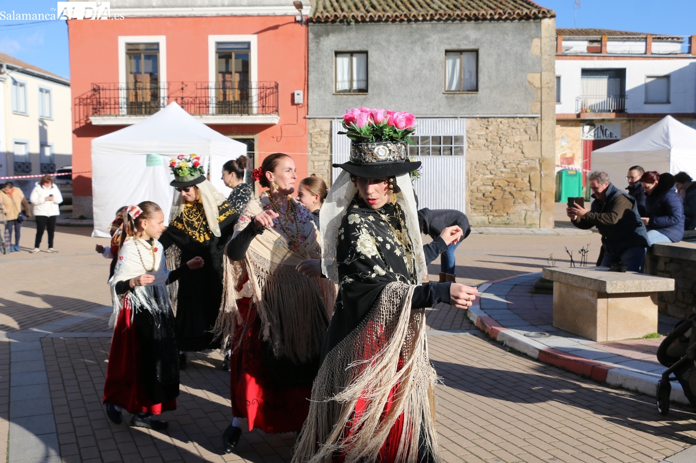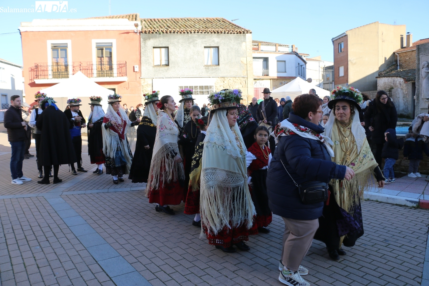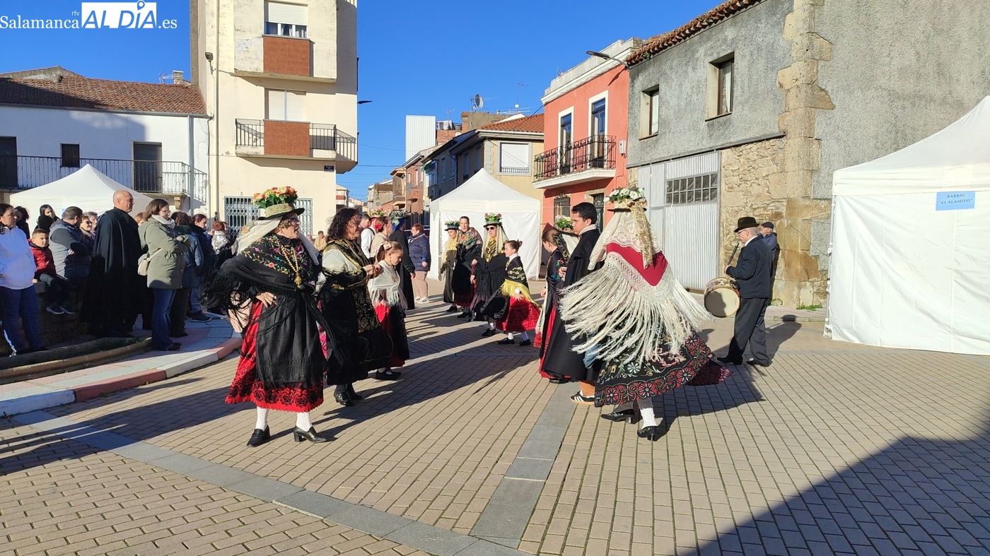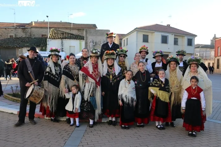 El protagonismo artístico de la jornada ha recaído en el grupo de folclore Santa María de Liminares. Sus integrantes han llenado de color la plaza luciendo sus trajes charros, joyas y complementos, entre los que han destacado los vistosos tocados de sombreros floreados, típicos de esta zona del Abadengo.