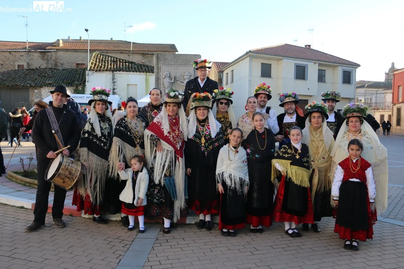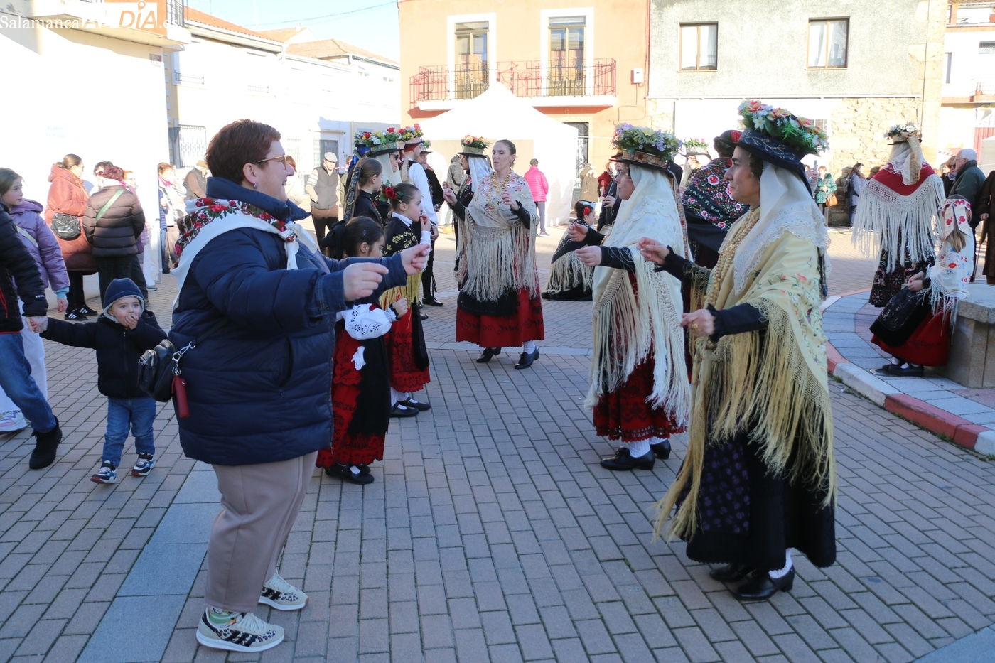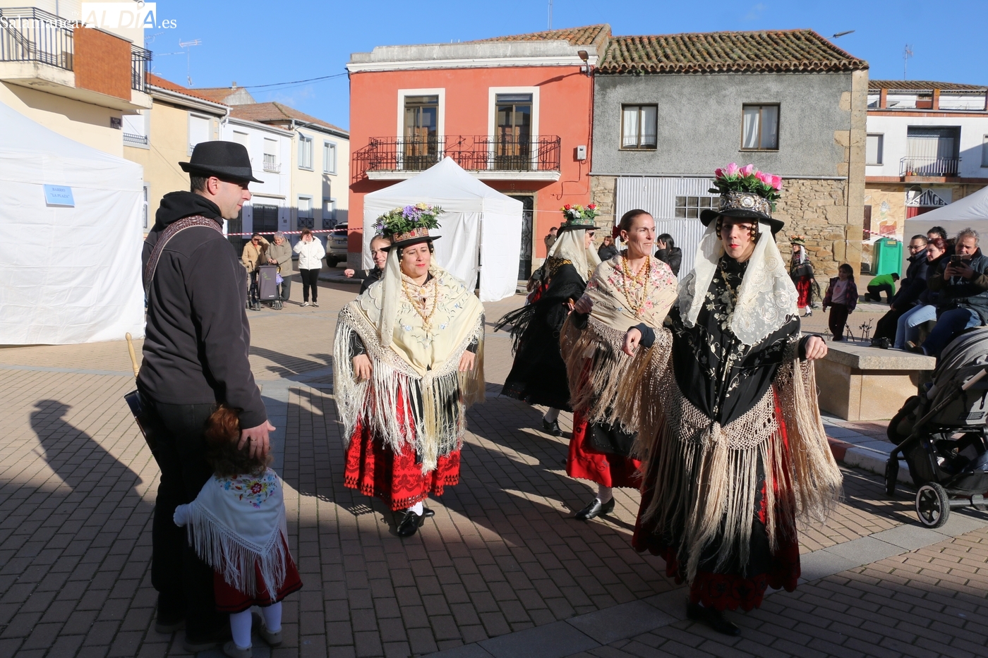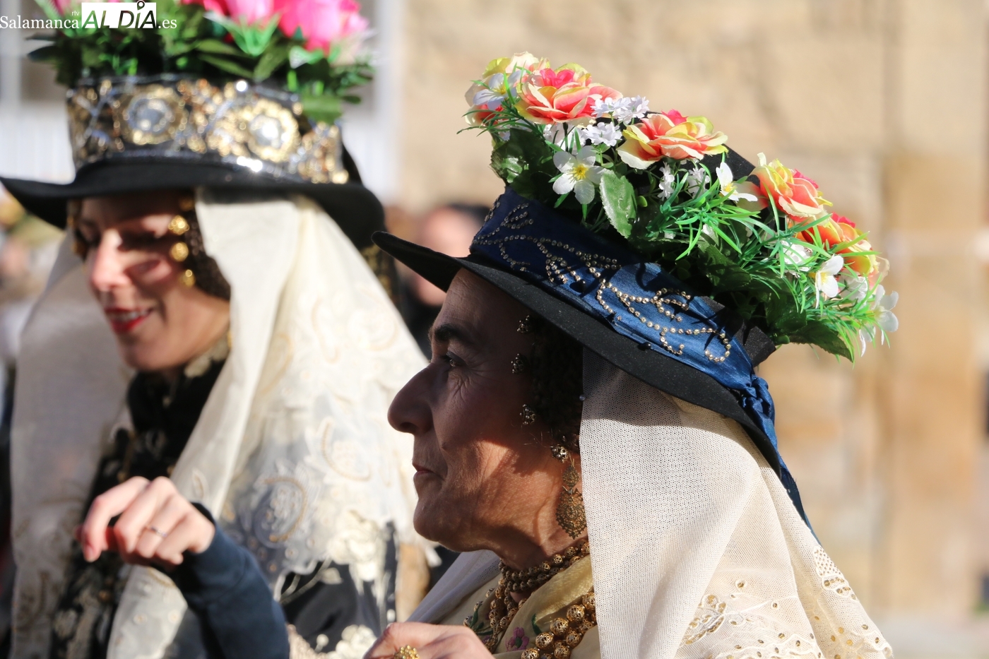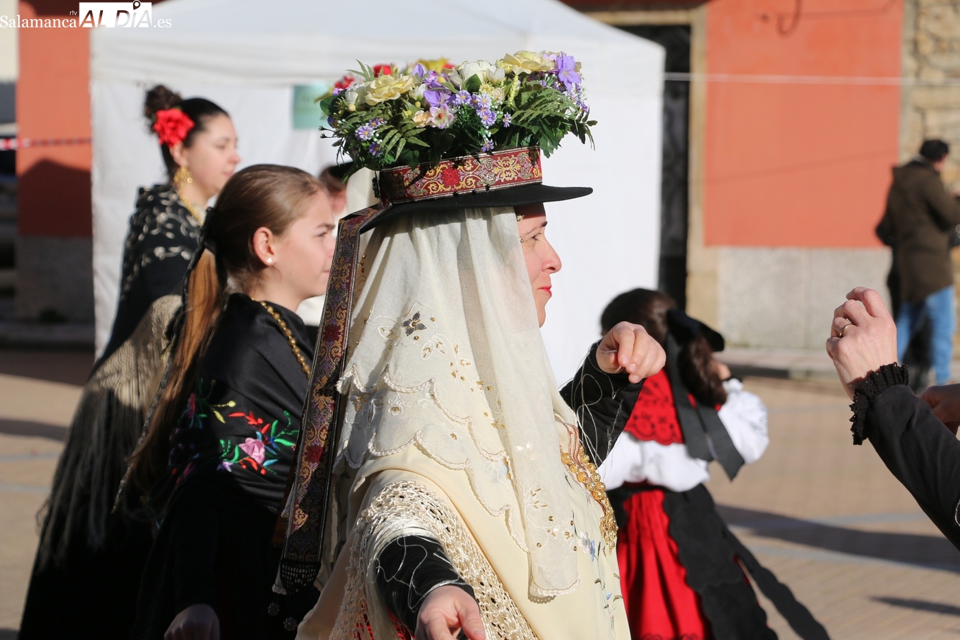 El protagonismo artístico de la jornada ha recaído en el grupo de folclore Santa María de Liminares. Sus integrantes han llenado de color la plaza luciendo sus trajes charros, joyas y complementos, entre los que han destacado los vistosos tocados de sombreros floreados, típicos de esta zona del Abadengo.