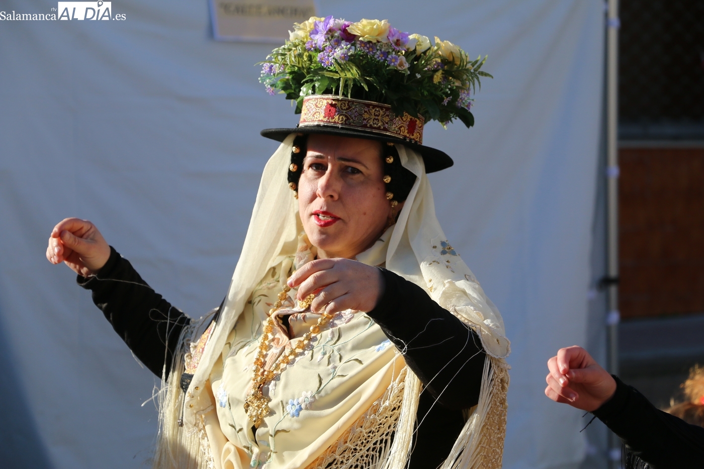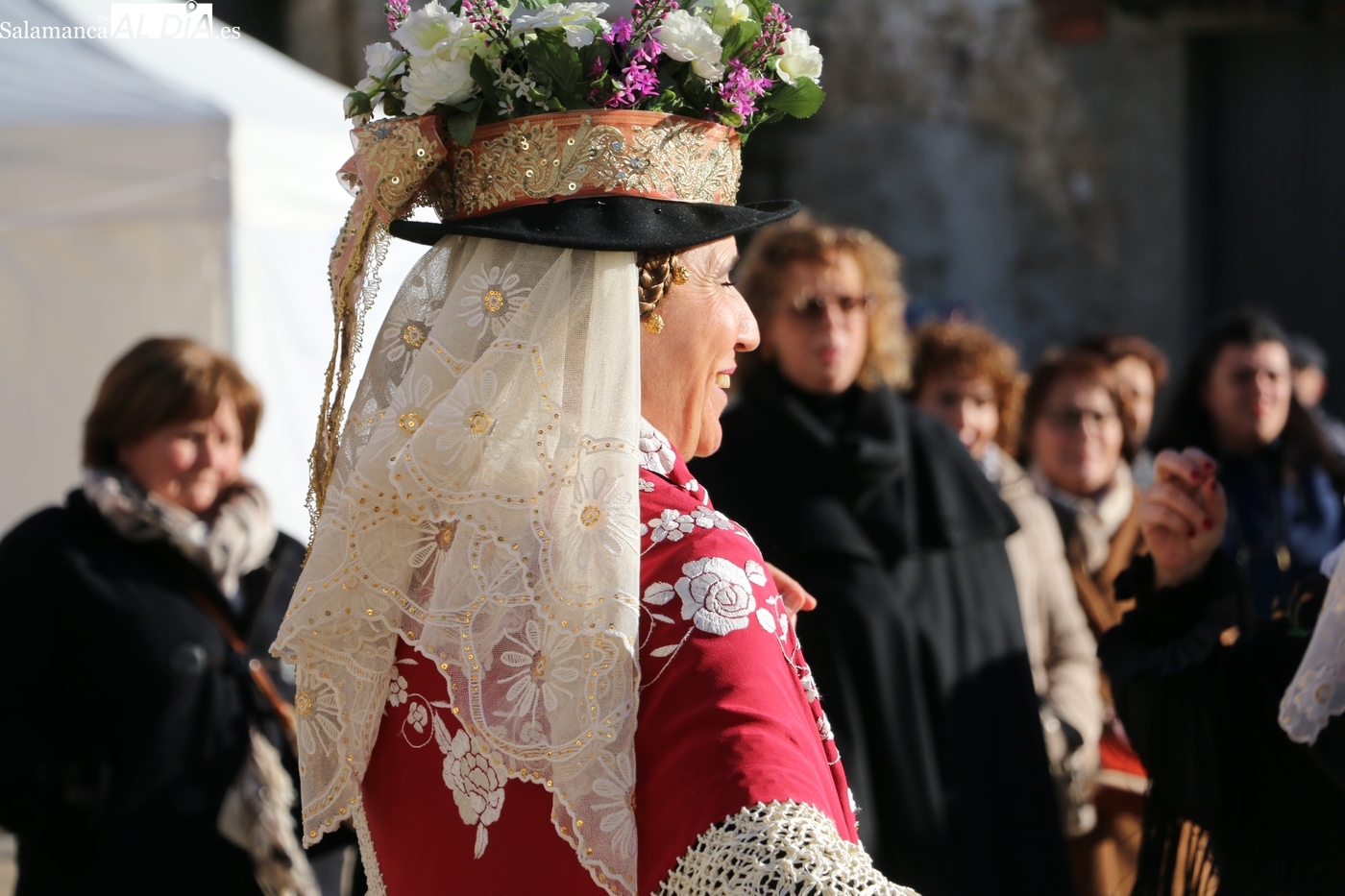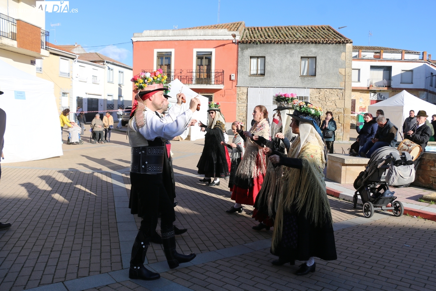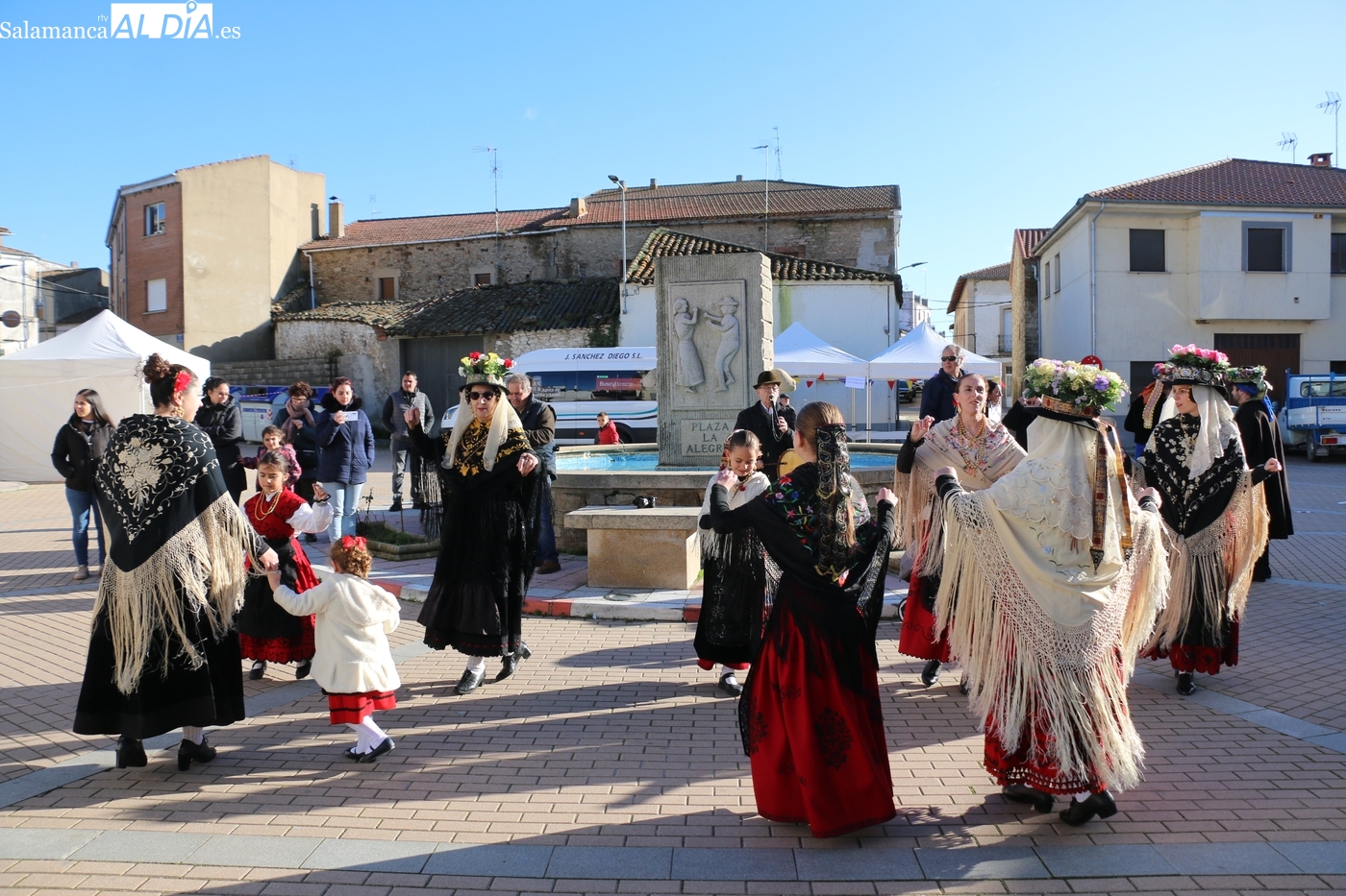 El protagonismo artístico de la jornada ha recaído en el grupo de folclore Santa María de Liminares. Sus integrantes han llenado de color la plaza luciendo sus trajes charros, joyas y complementos, entre los que han destacado los vistosos tocados de sombreros floreados, típicos de esta zona del Abadengo.