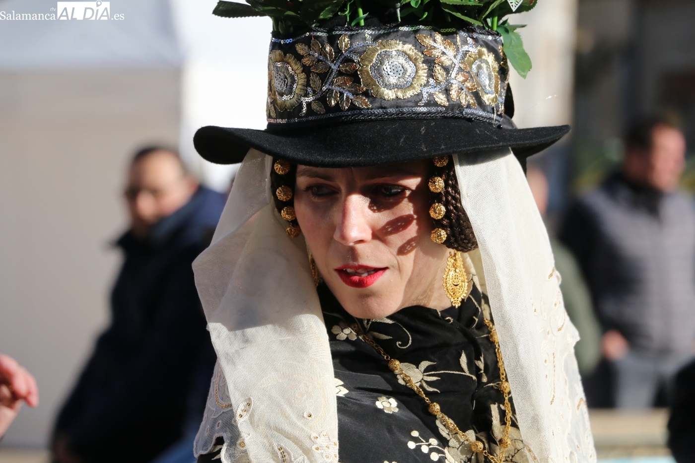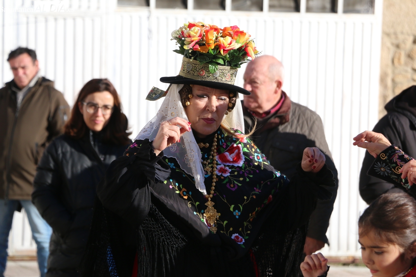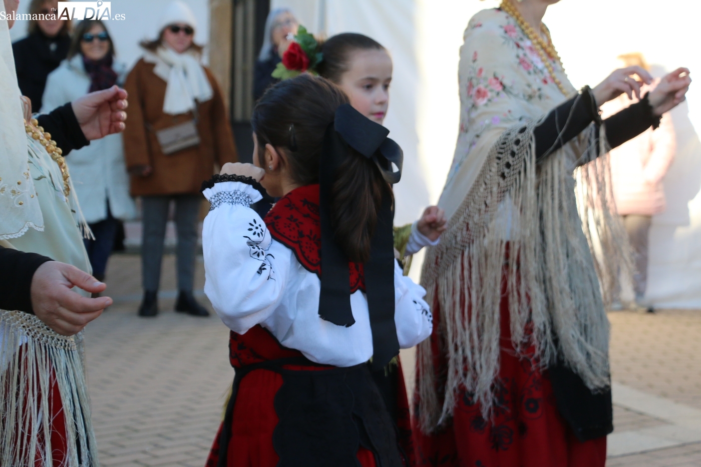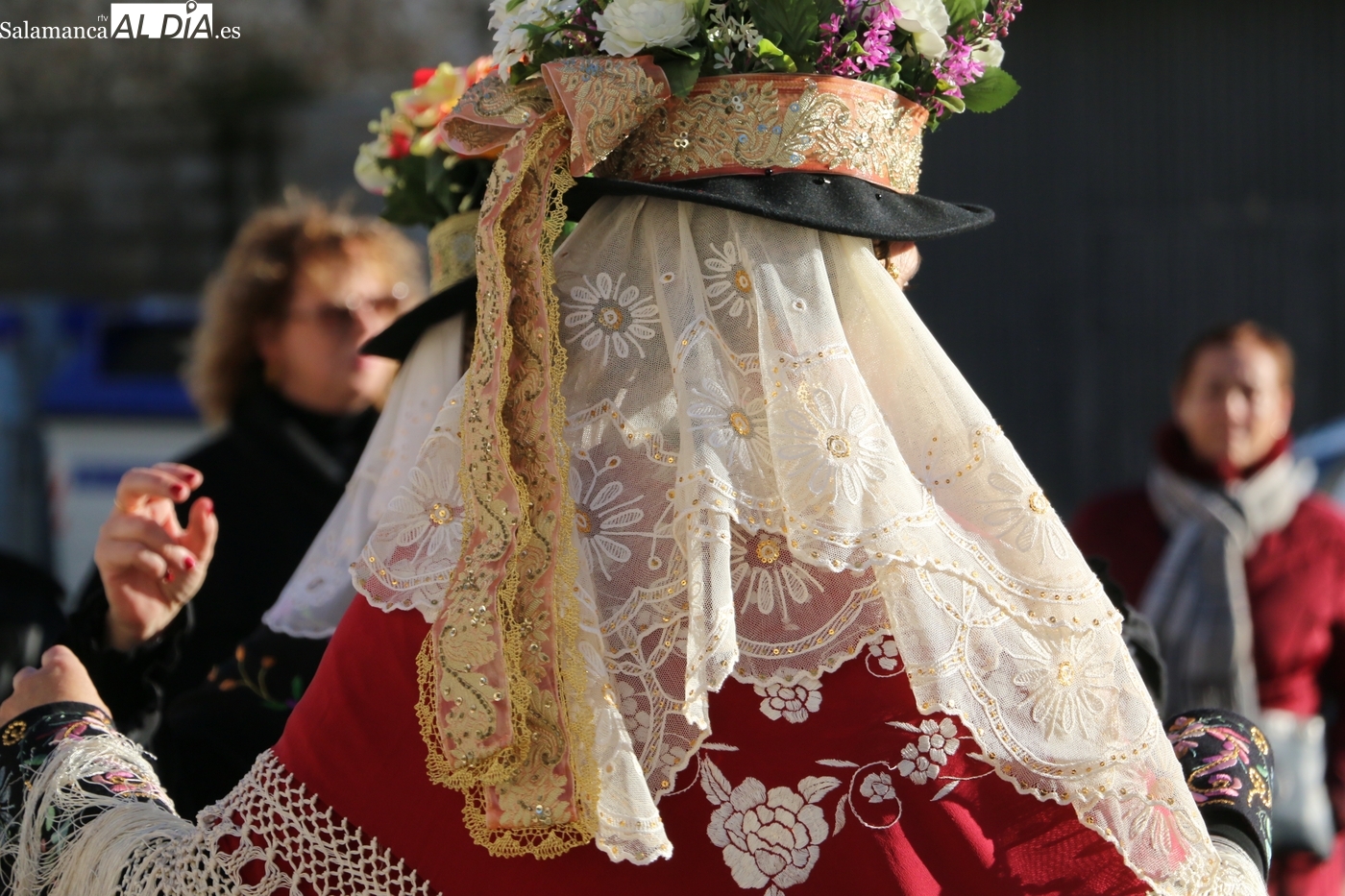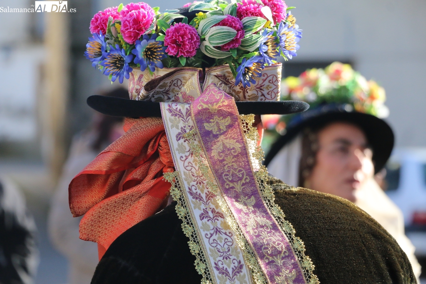 El protagonismo artístico de la jornada ha recaído en el grupo de folclore Santa María de Liminares. Sus integrantes han llenado de color la plaza luciendo sus trajes charros, joyas y complementos, entre los que han destacado los vistosos tocados de sombreros floreados, típicos de esta zona del Abadengo.
