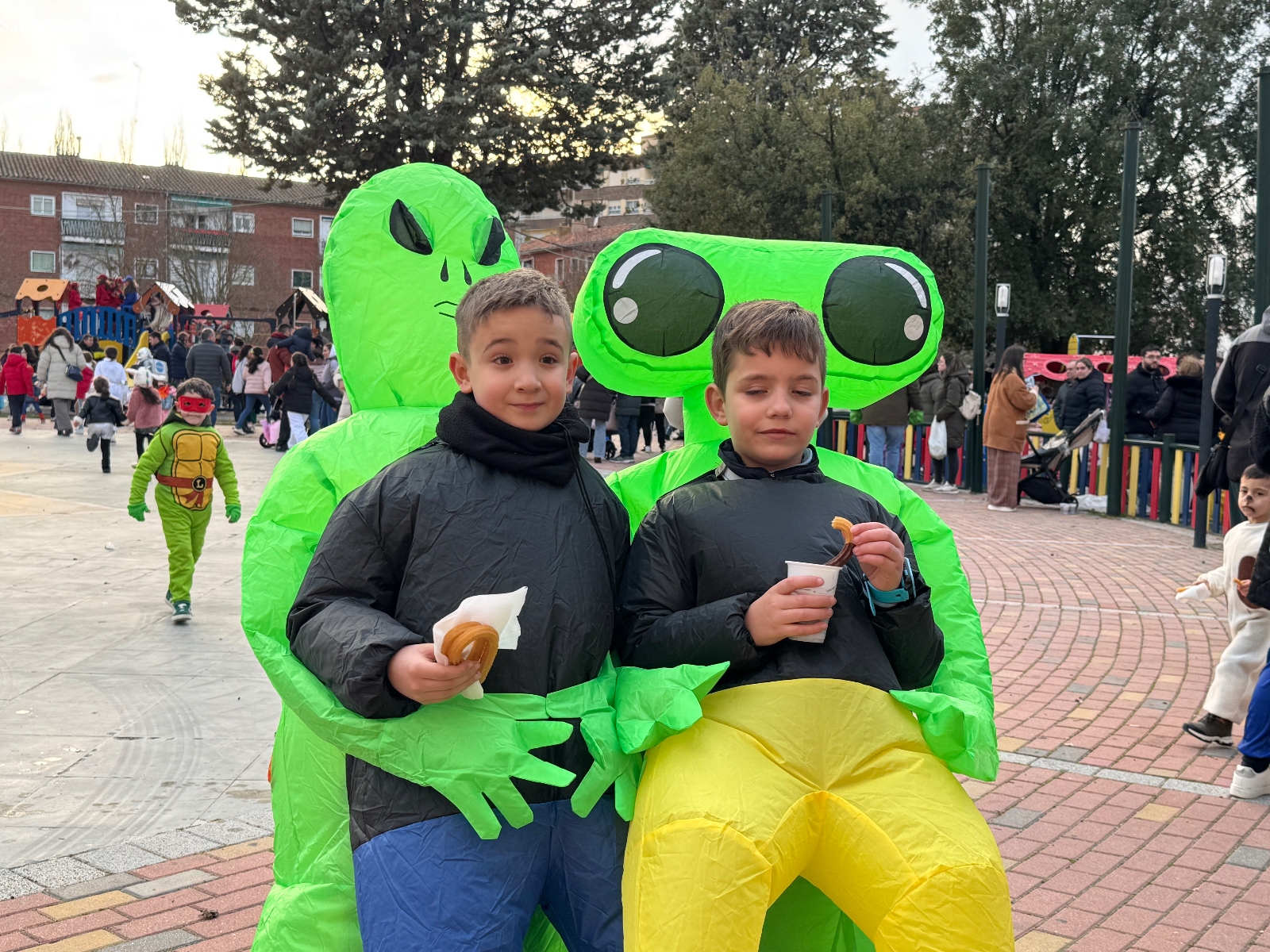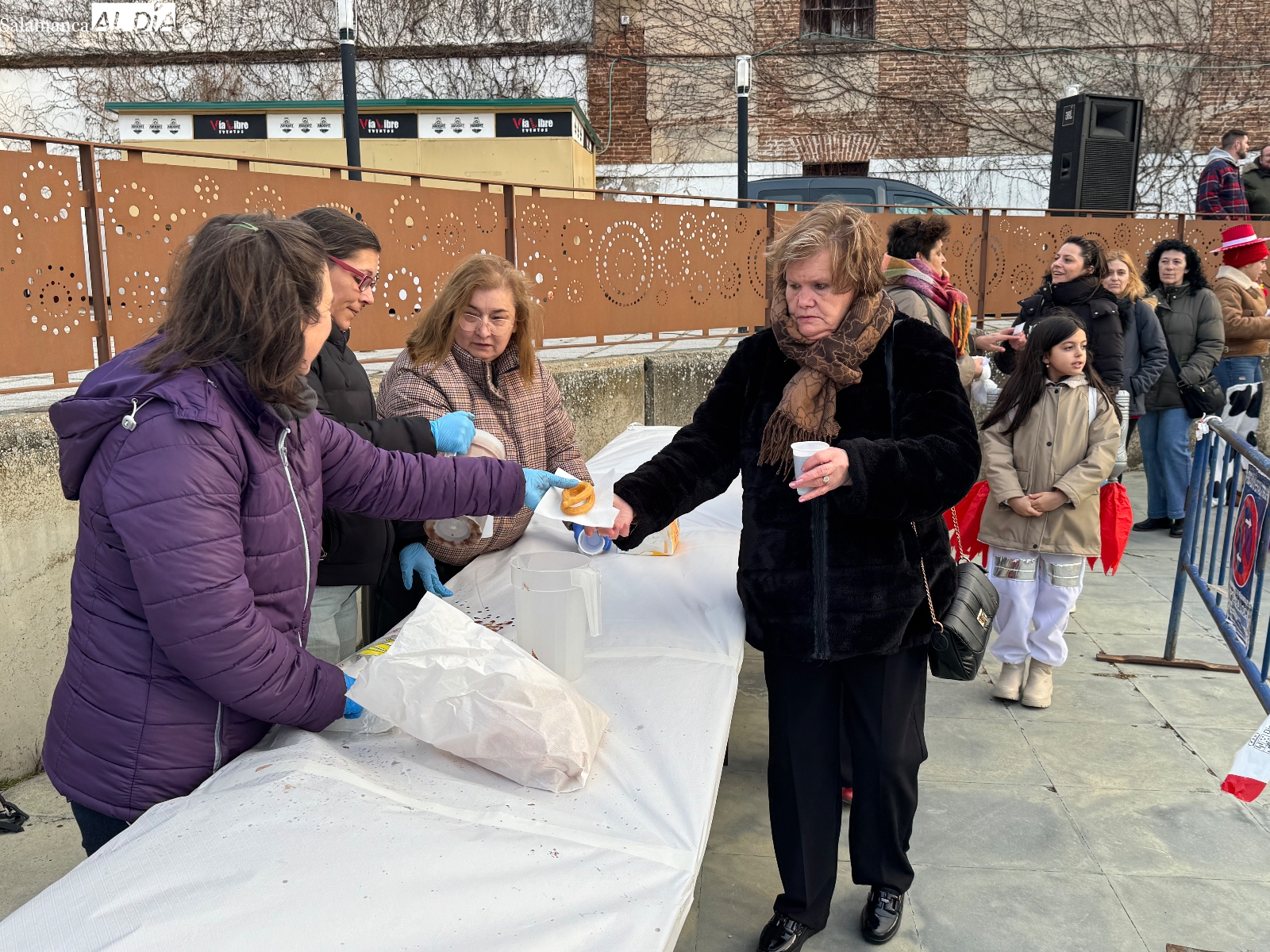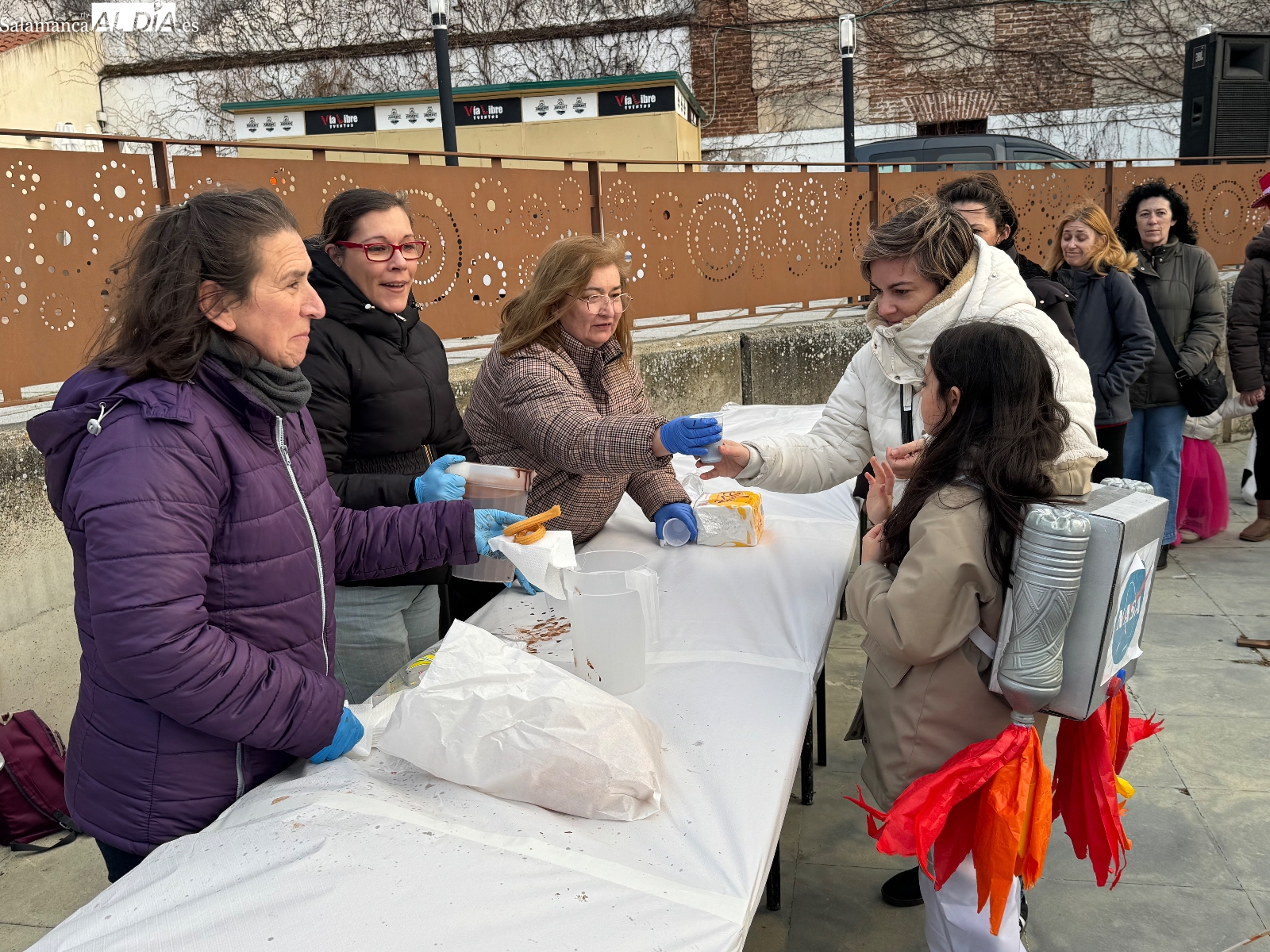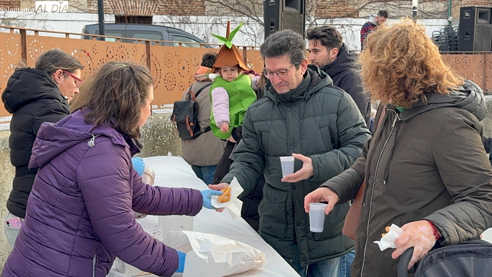 De manera paralela, se desarrolló el chocolate con churros solidario a beneficio de Pyfano, una iniciativa que volvió a demostrar el compromiso social de los peñarandinos. Las colas para recoger la merienda fueron constantes durante buena parte de la tarde, mientras la música animaba el ambiente y generaba bailes y corrillos entre grandes y pequeños.