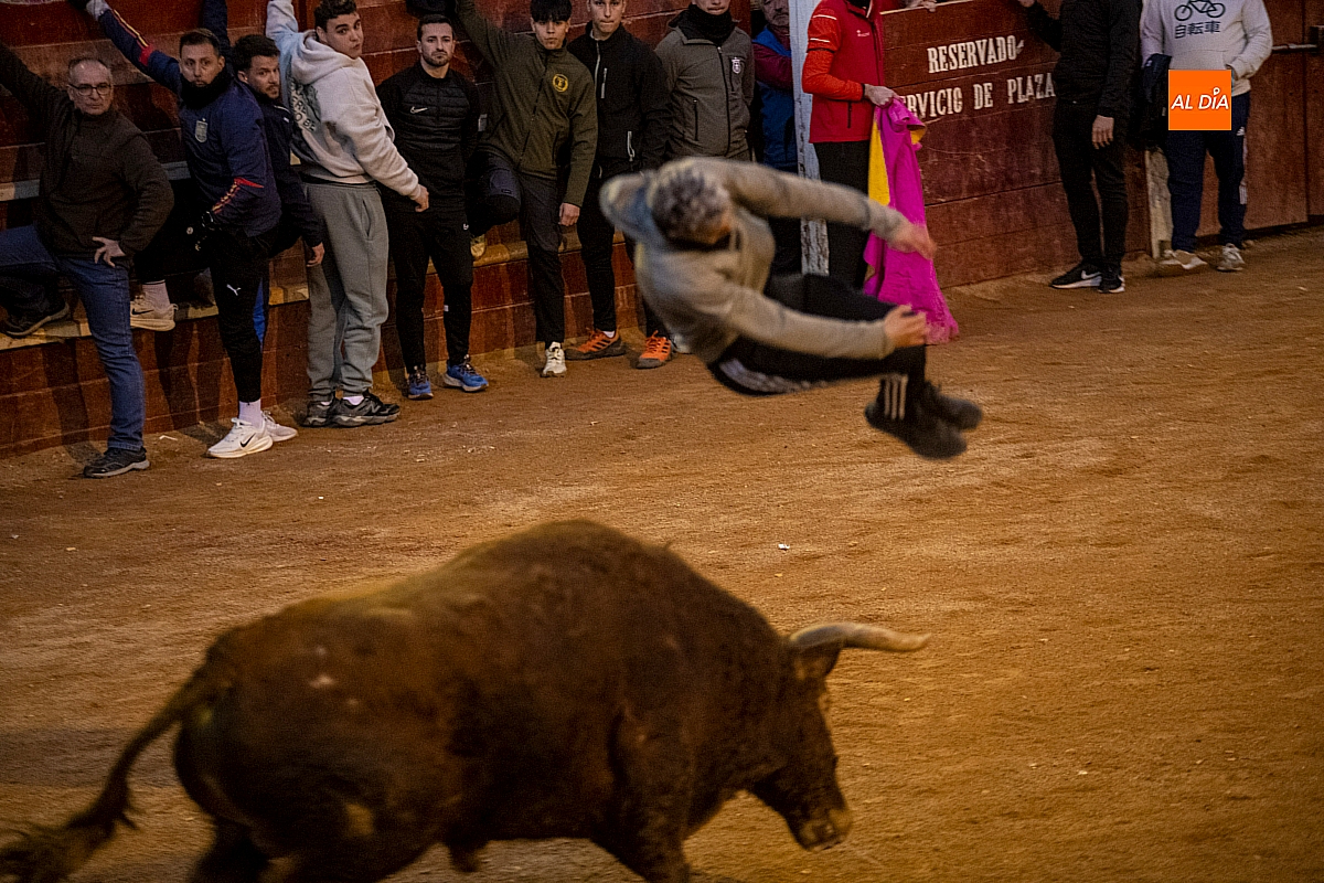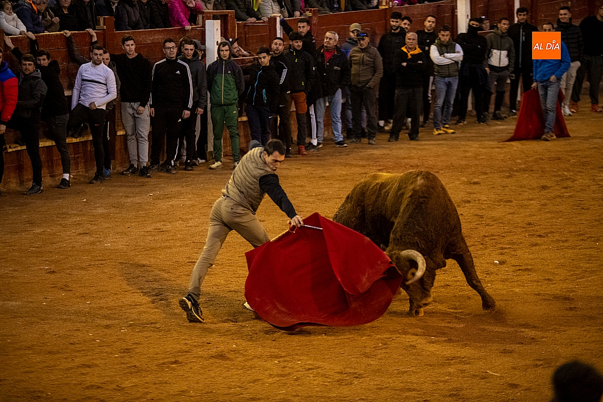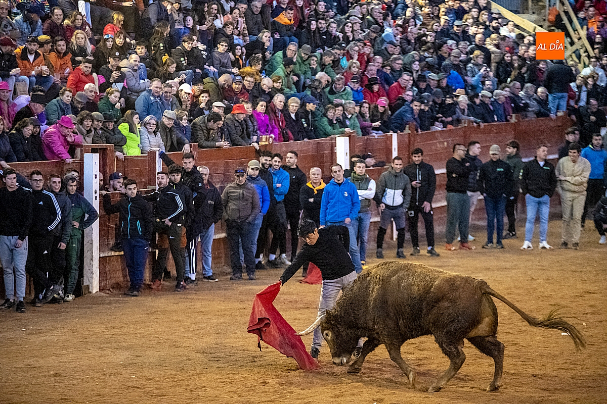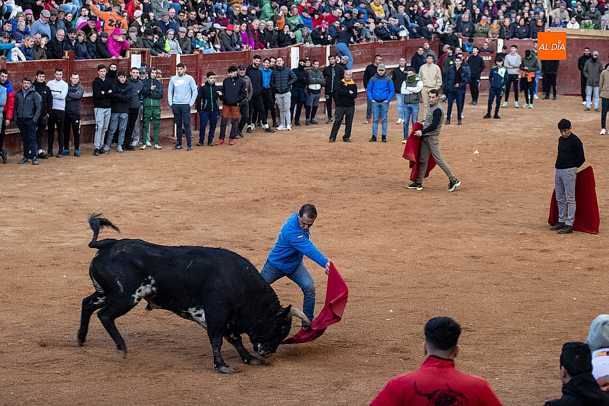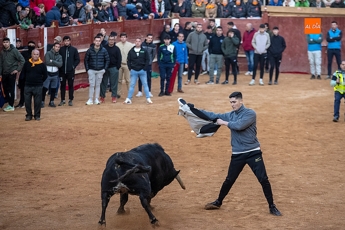 La capea de la tarde alcanzó su punto más alto con la salida de los tres toros presentados por el ganadero: animales de presencia imponente, bien armados y con una bravura franca que obligaba a quienes se situaban frente a ellos a un ejercicio constante de cálculo y decisión. Recortadores y maletillas, conscientes del prestigio implícito en cada lance logrado, disputaban el terreno con una mezcla de arrojo y técnica, buscando arrancar los mejores momentos a unos astados que respondían con rapidez, arrancándose con determinación en cuanto percibían un gesto, un cite o una mínima provocación.