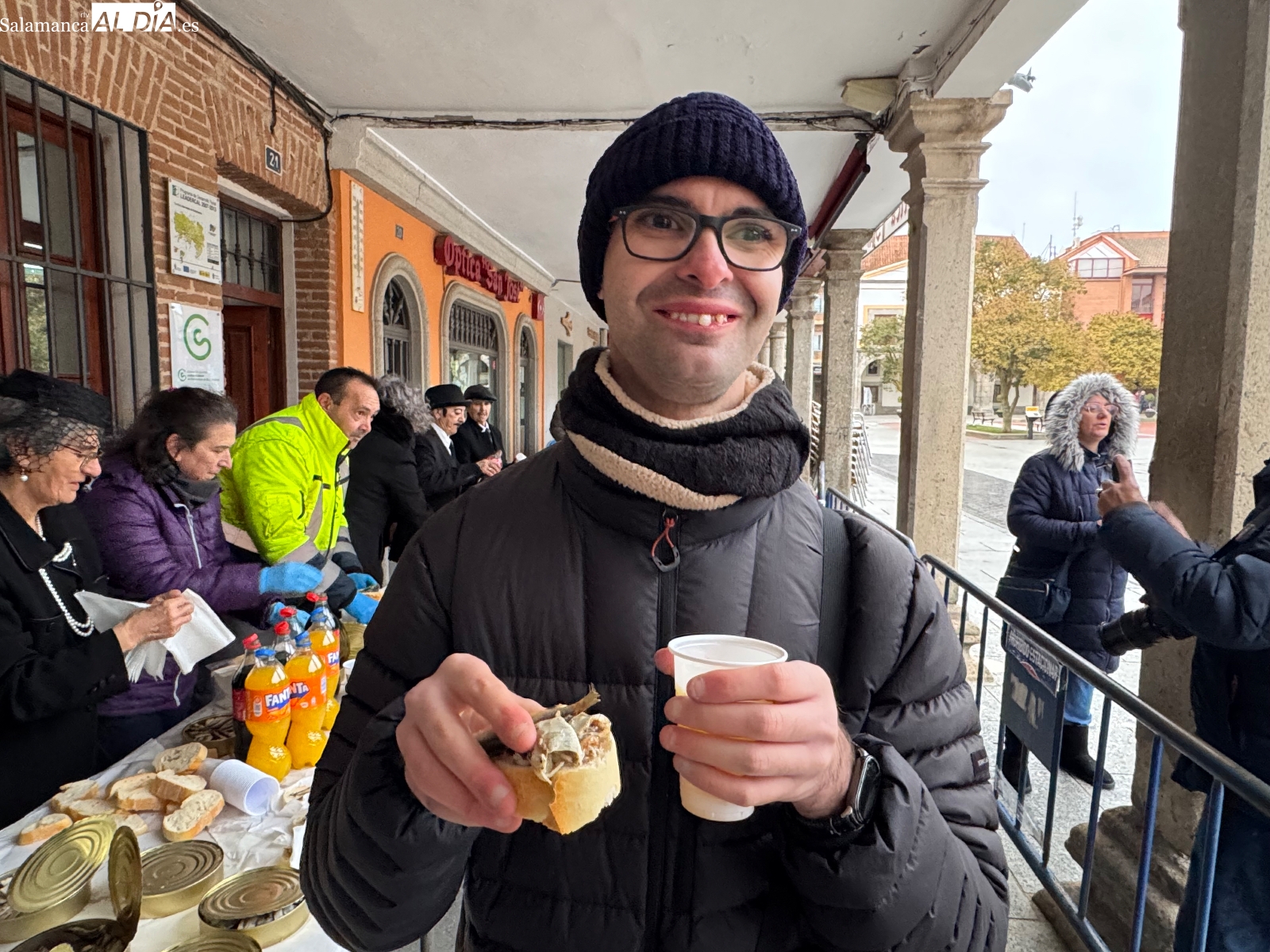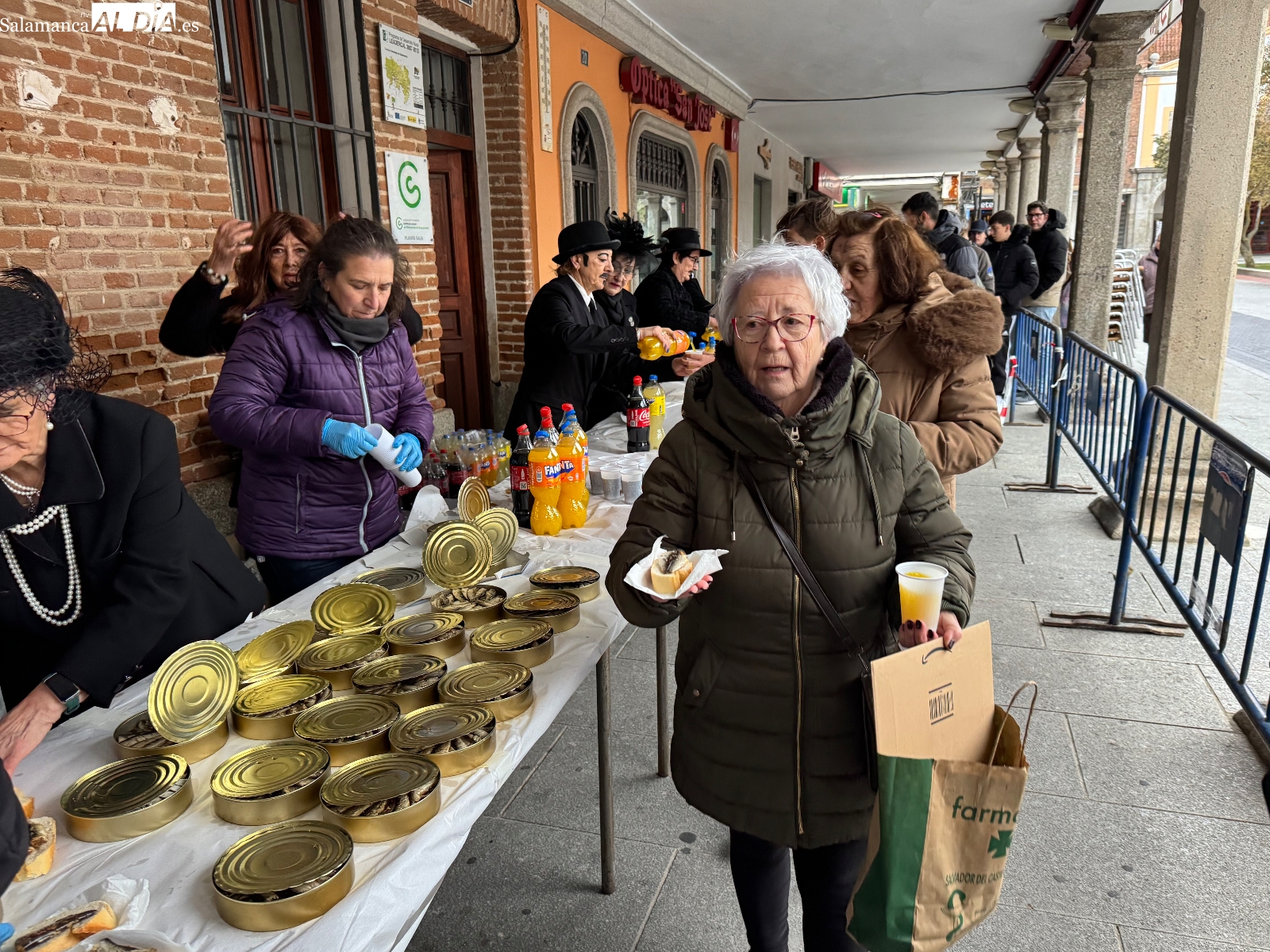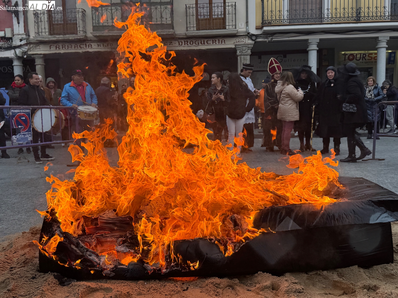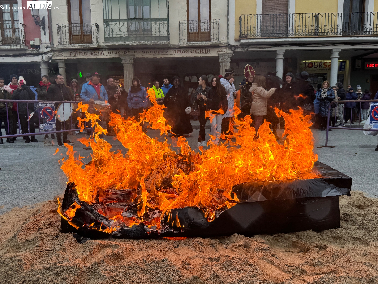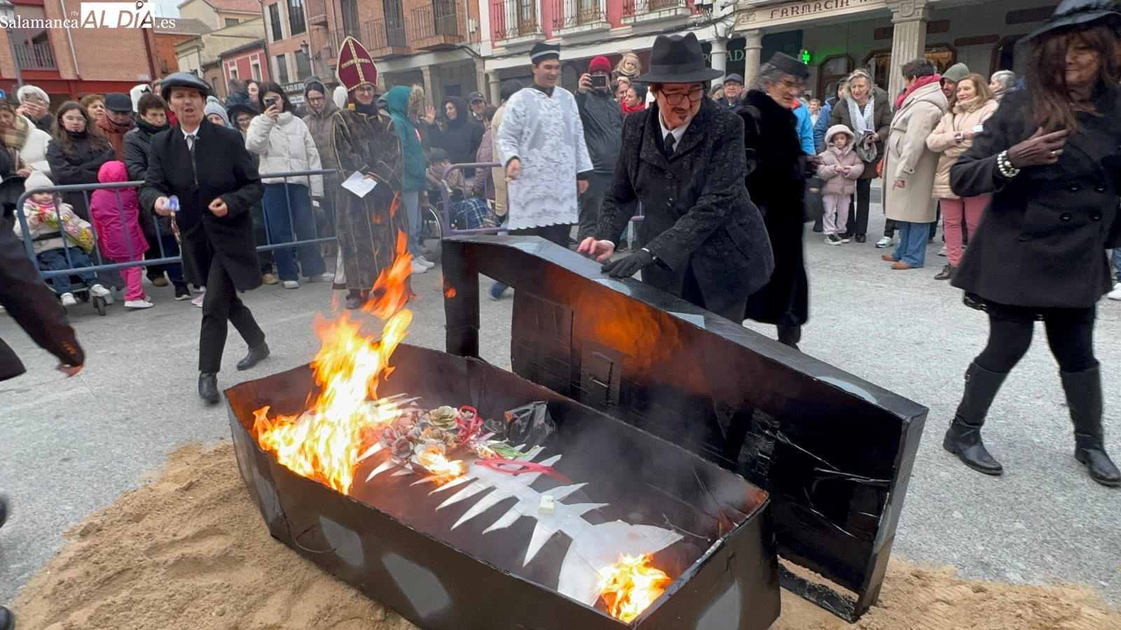 Poco antes de las seis, con la intensa lluvia comenzando a caer, comenzaba la quema del féretro, acompañada de divertidas letanías que arrancaron sonrisas entre el público congregado junto al Templete. Tras el fuego purificador, llegaba uno de los momentos más esperados: la entrega de sardinas y refrescos a todos los participantes. La Plaza de España prolongaba bajo los soportales el ambiente festivo hasta bien entrada la tarde, cerrando un carnaval que, un año más, deja en Peñaranda ganas de repetir.