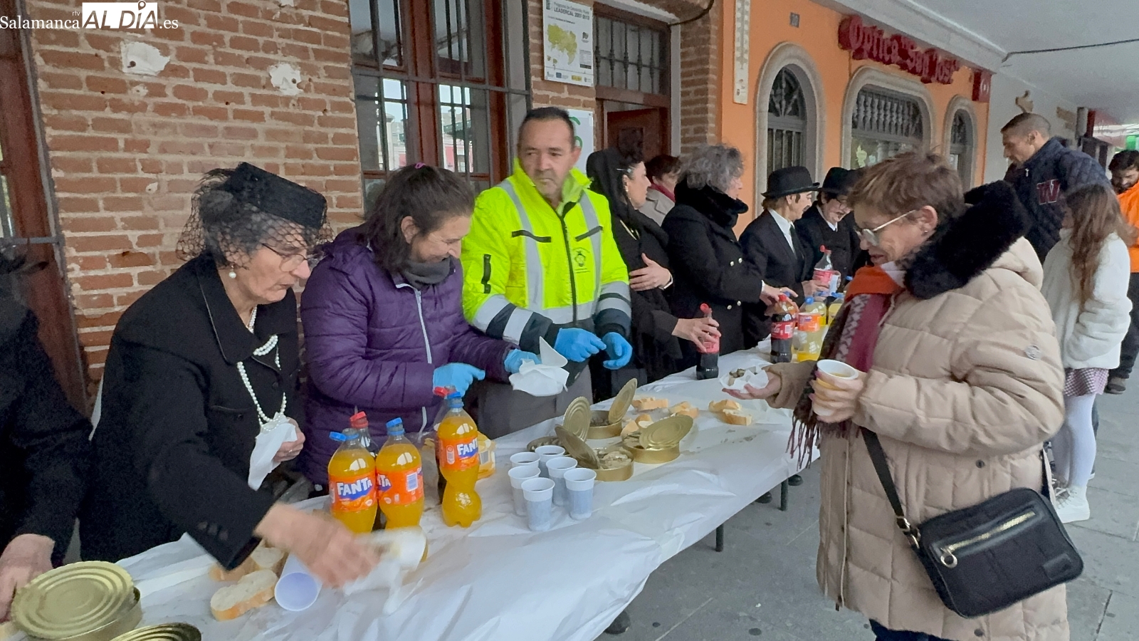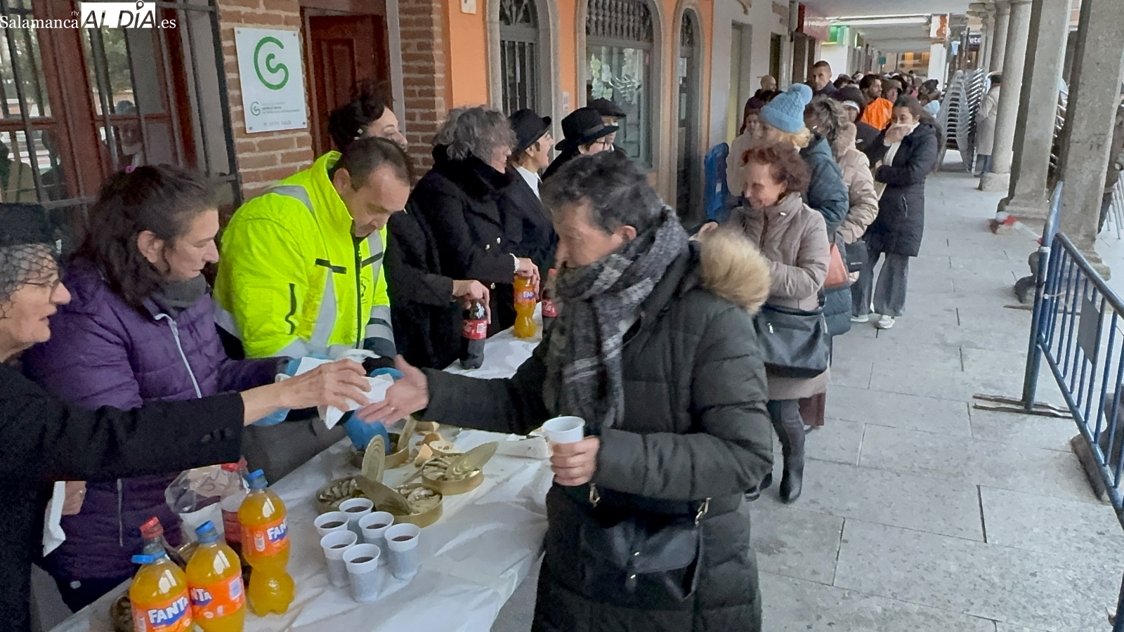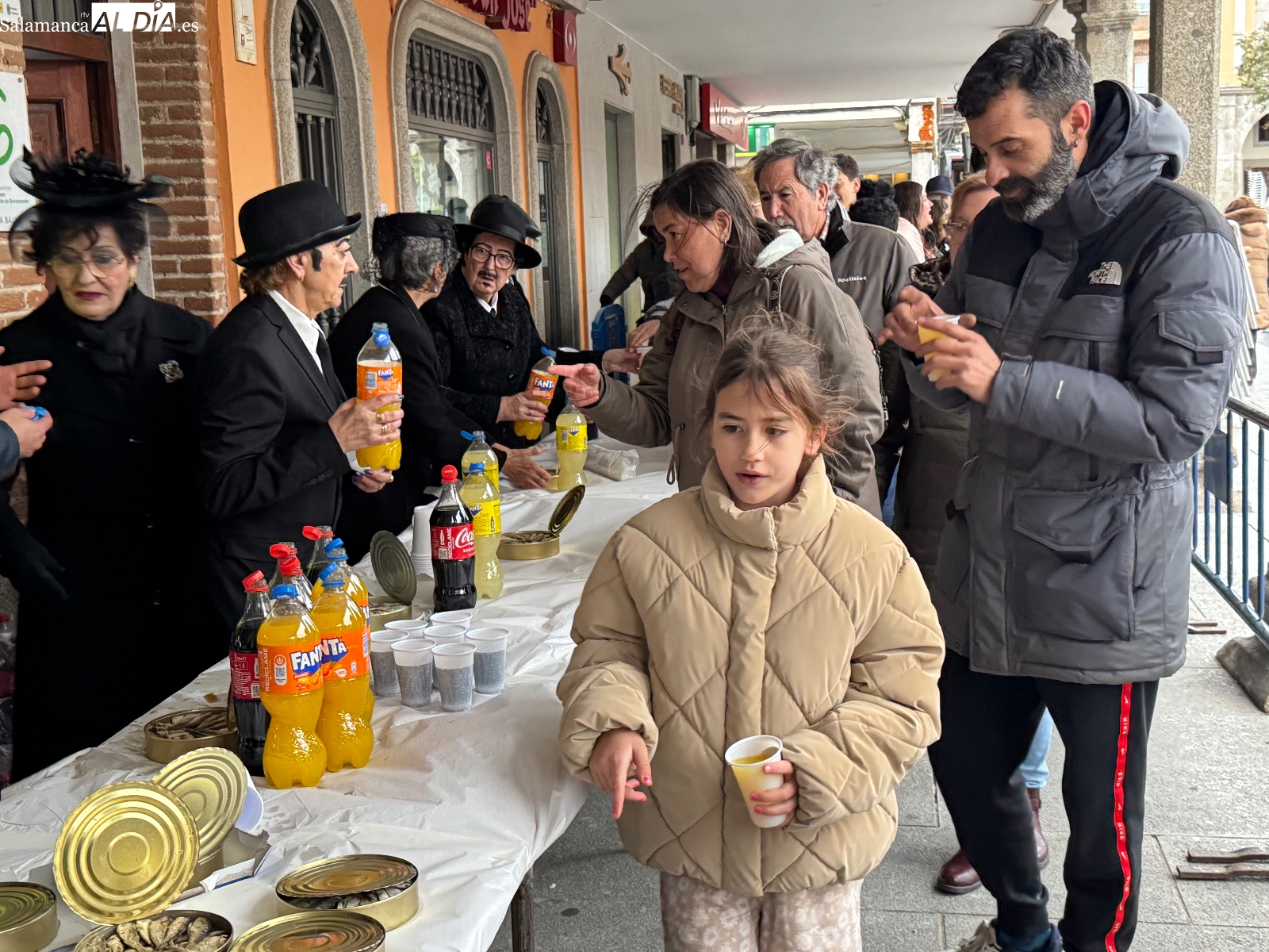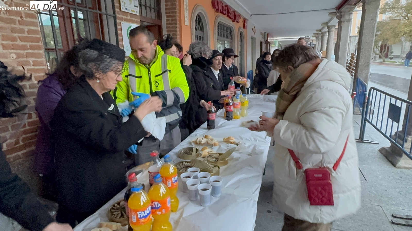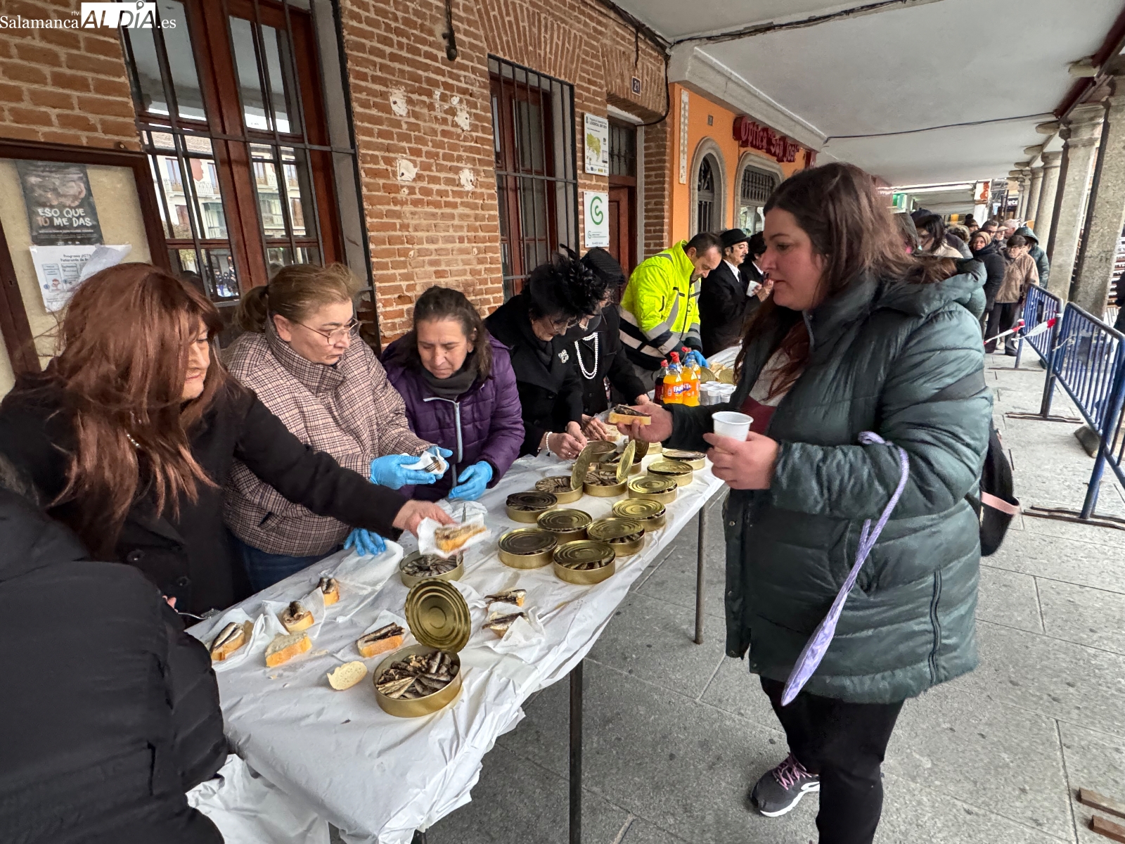 Poco antes de las seis, con la intensa lluvia comenzando a caer, comenzaba la quema del féretro, acompañada de divertidas letanías que arrancaron sonrisas entre el público congregado junto al Templete. Tras el fuego purificador, llegaba uno de los momentos más esperados: la entrega de sardinas y refrescos a todos los participantes. La Plaza de España prolongaba bajo los soportales el ambiente festivo hasta bien entrada la tarde, cerrando un carnaval que, un año más, deja en Peñaranda ganas de repetir.