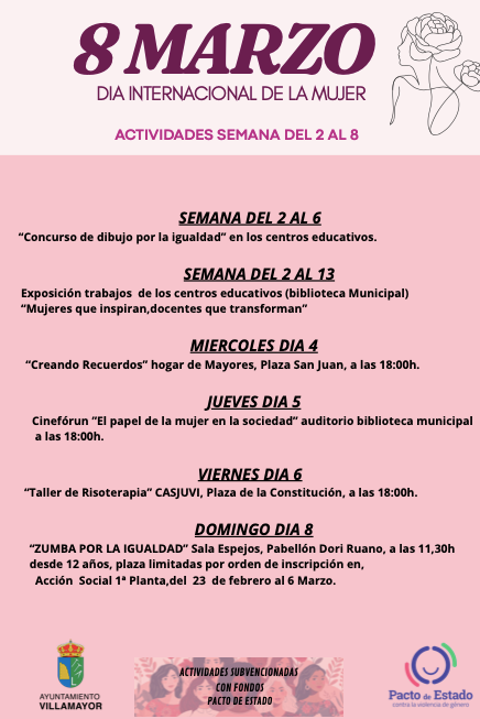 El Ayuntamiento de Villamayor organiza una completa programación del 2 al 13 de marzo para conmemorar el 8M, incluyendo cine, talleres, exposiciones y una jornada de zumba