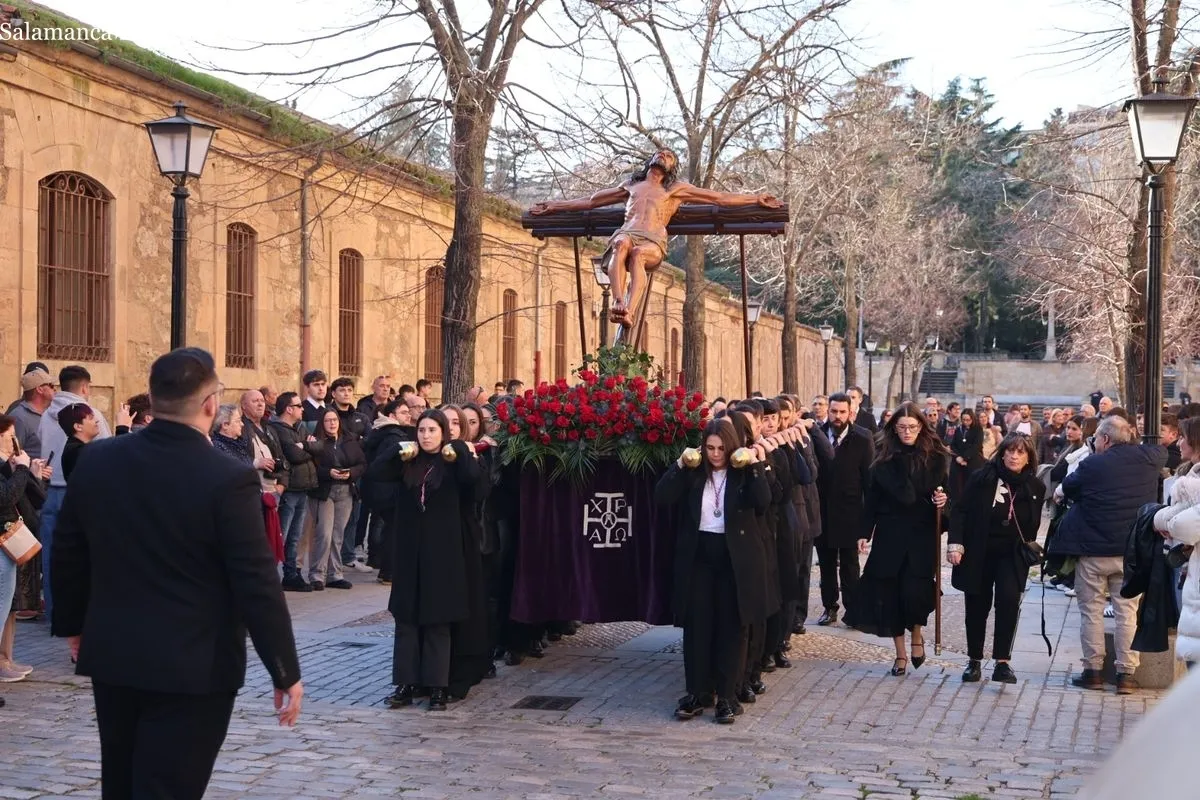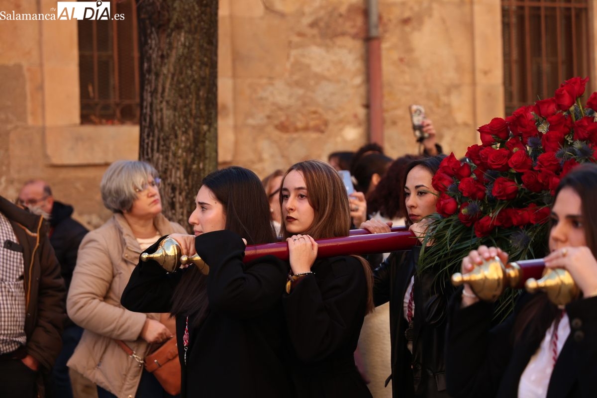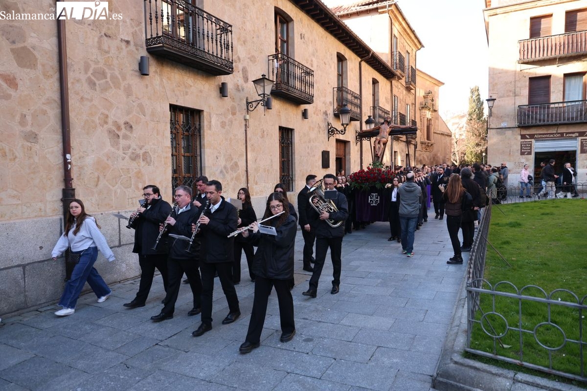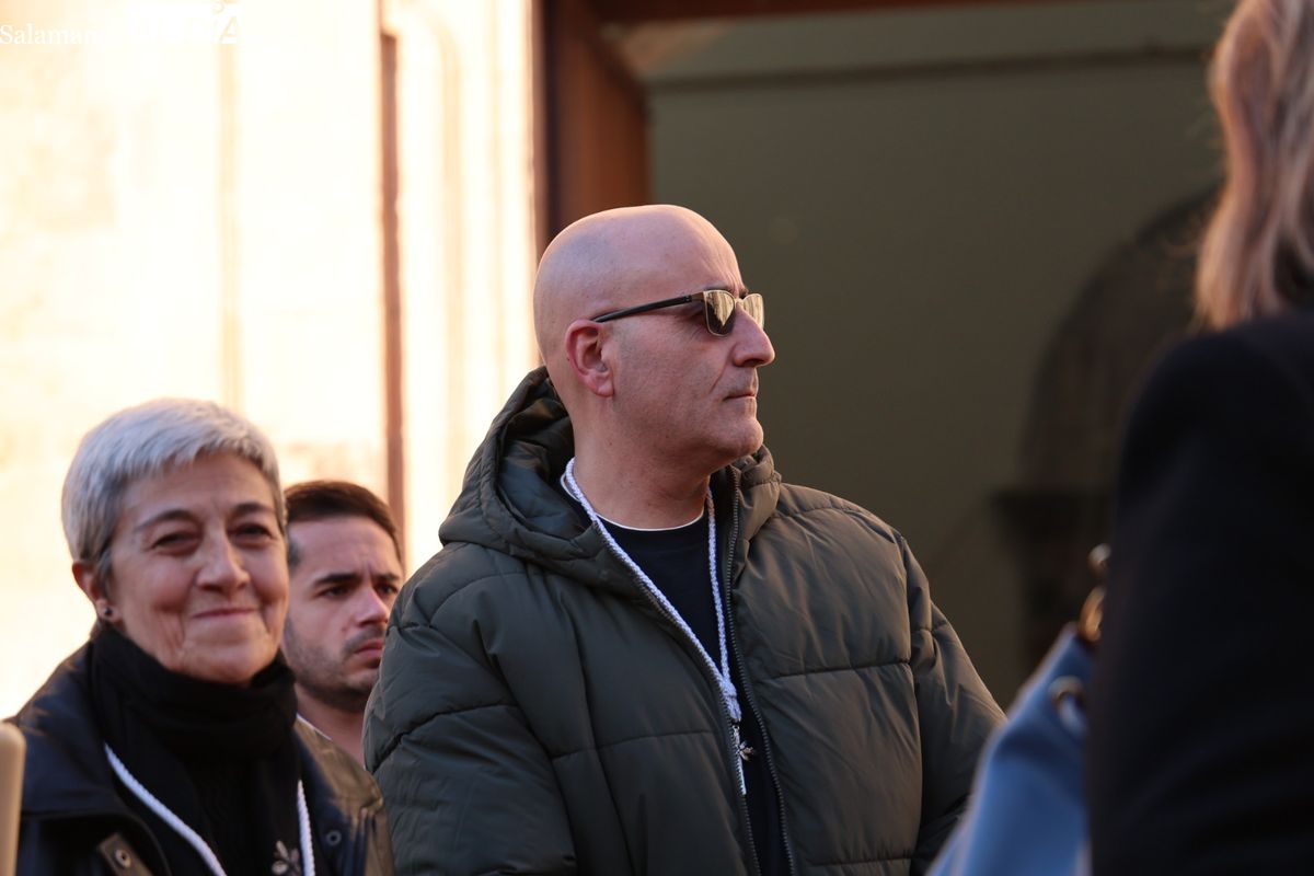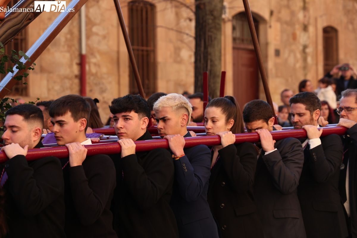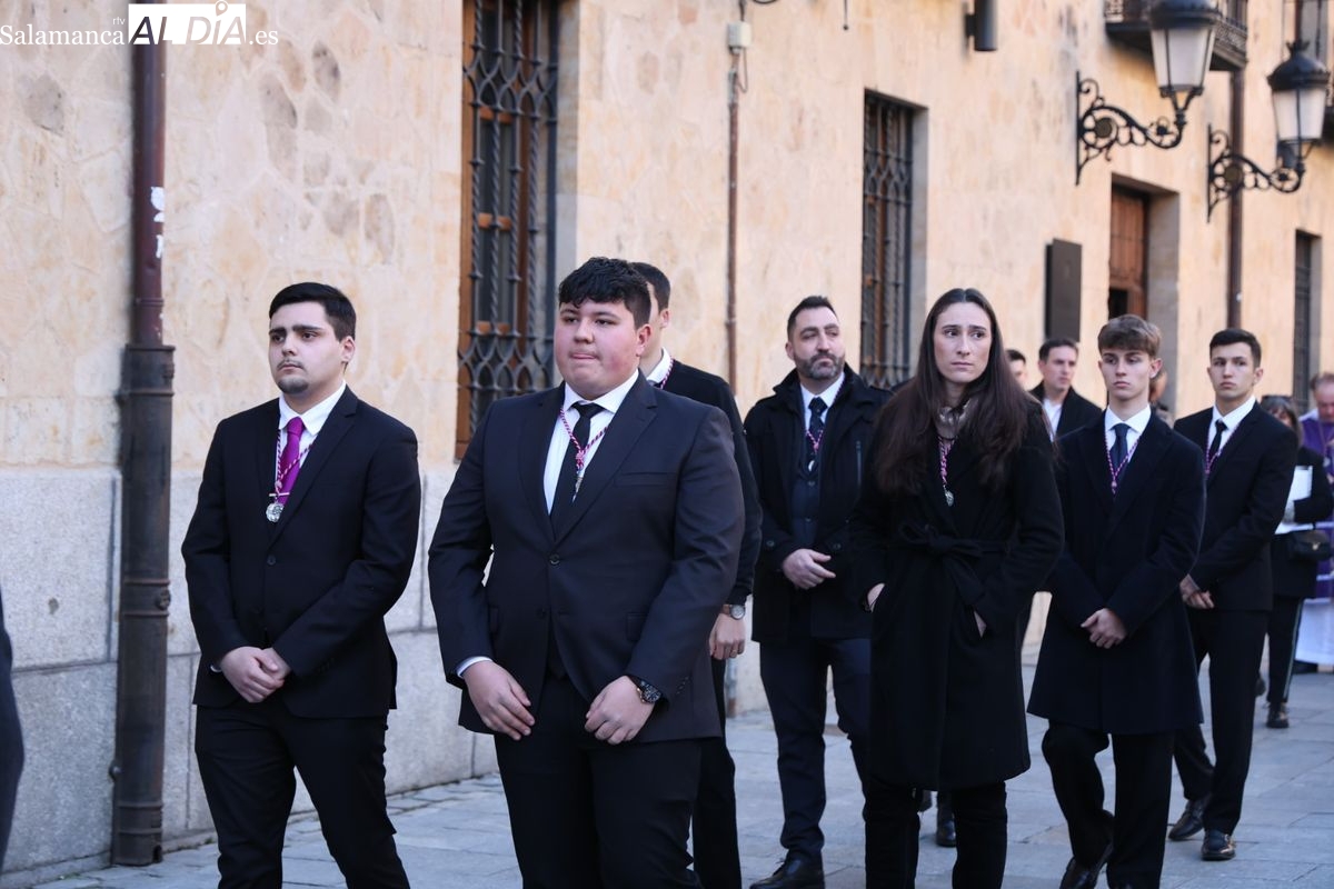 La procesión ha partido desde la iglesia del convento de las Úrsulas, sede canónica de la cofradía, para adentrarse en un itinerario de recogimiento por el centro de la ciudad. La talla, una obra destacada de la imaginería procesional salmantina realizada por Damián Villar en el año 1959, ha sido el foco de atención de los fieles y cofrades que se han congregado para acompañar el traslado.