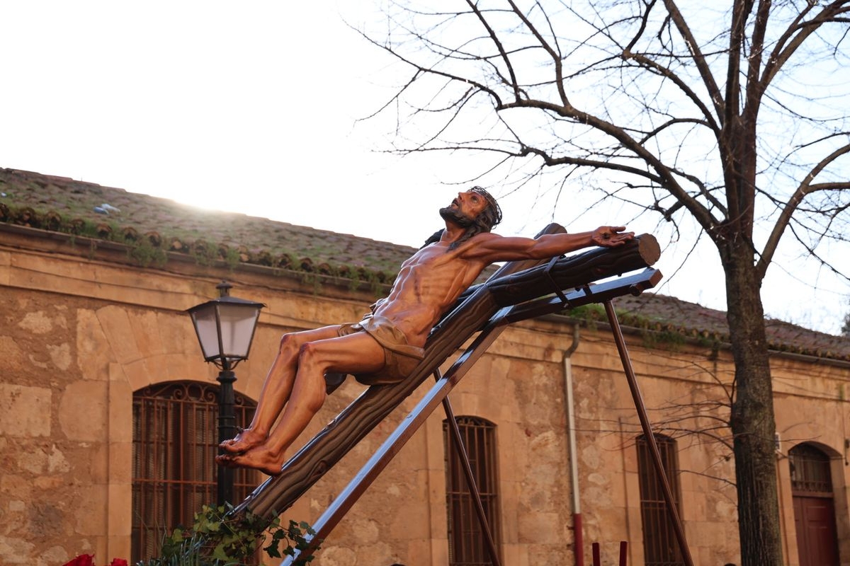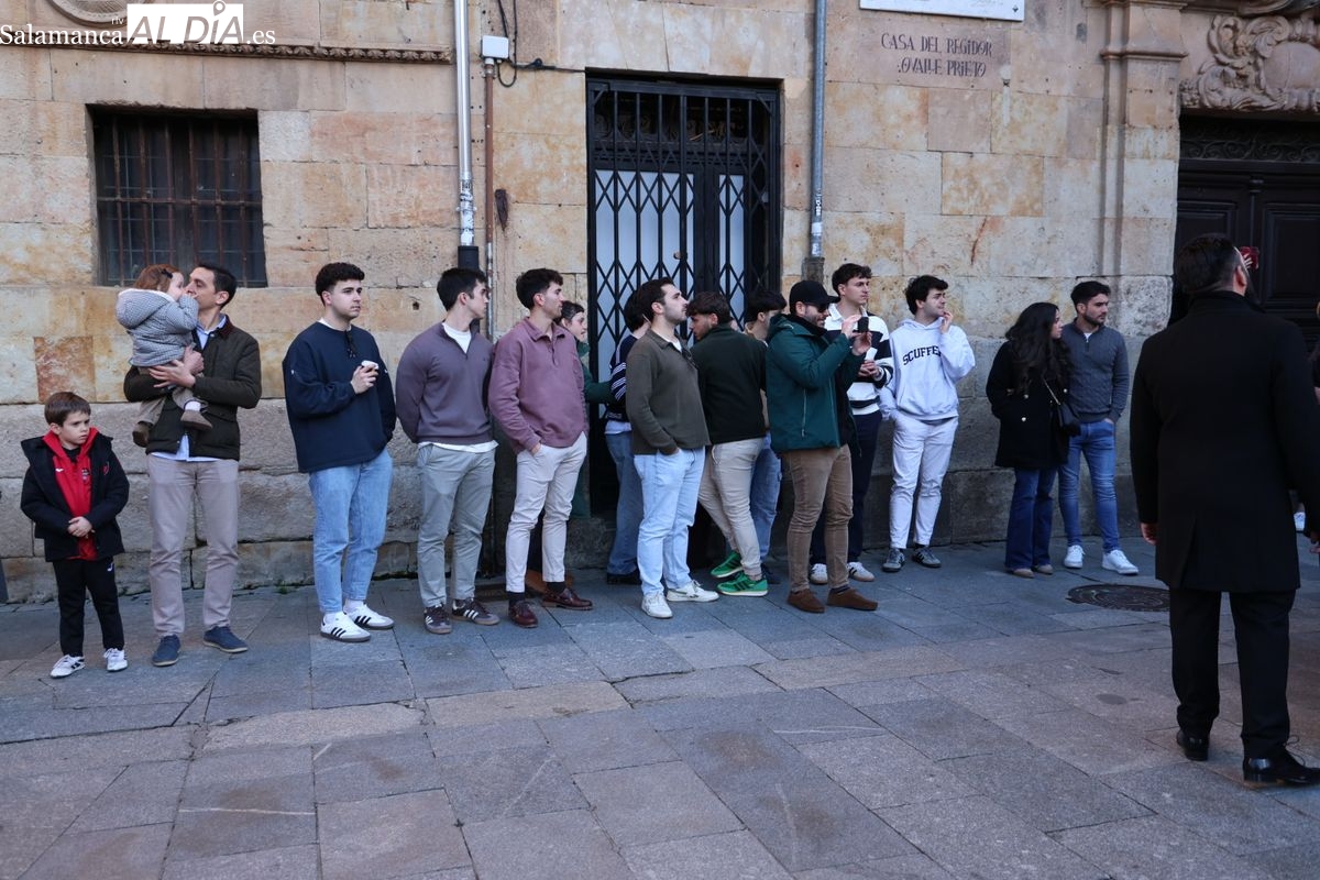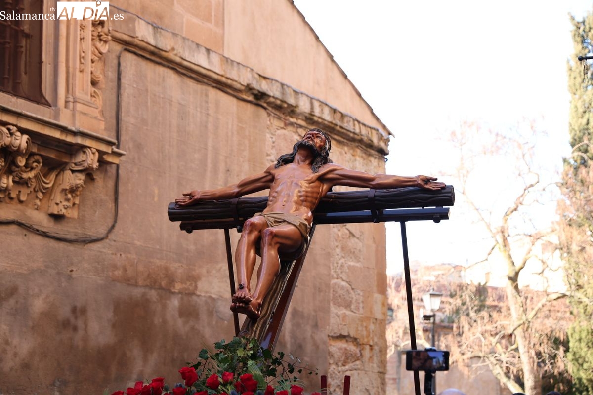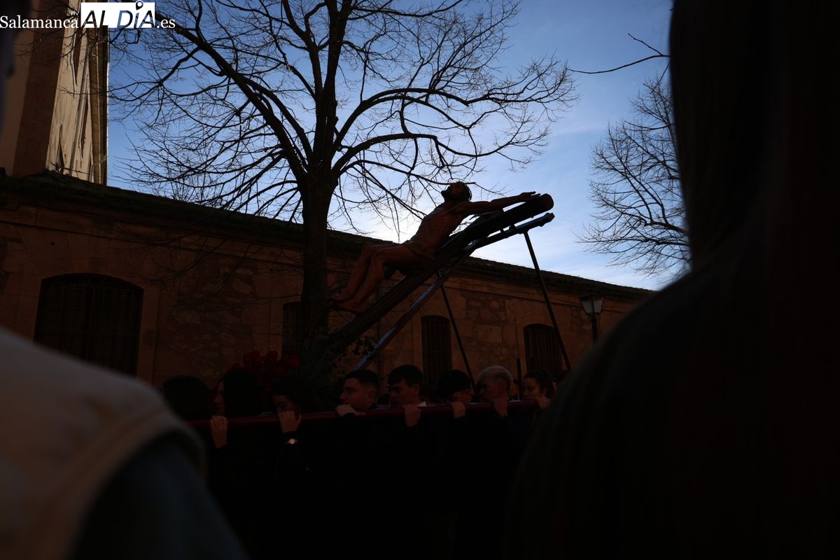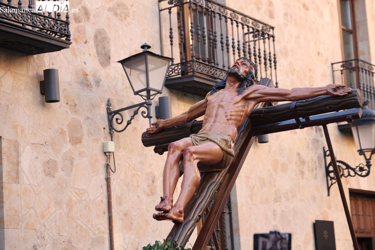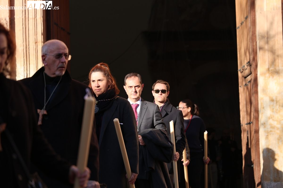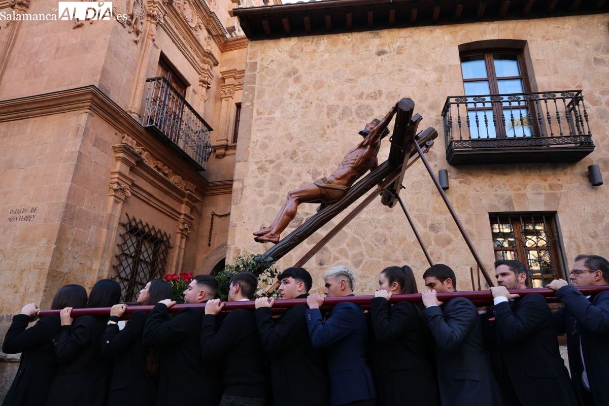 La procesión ha partido desde la iglesia del convento de las Úrsulas, sede canónica de la cofradía, para adentrarse en un itinerario de recogimiento por el centro de la ciudad. La talla, una obra destacada de la imaginería procesional salmantina realizada por Damián Villar en el año 1959, ha sido el foco de atención de los fieles y cofrades que se han congregado para acompañar el traslado.