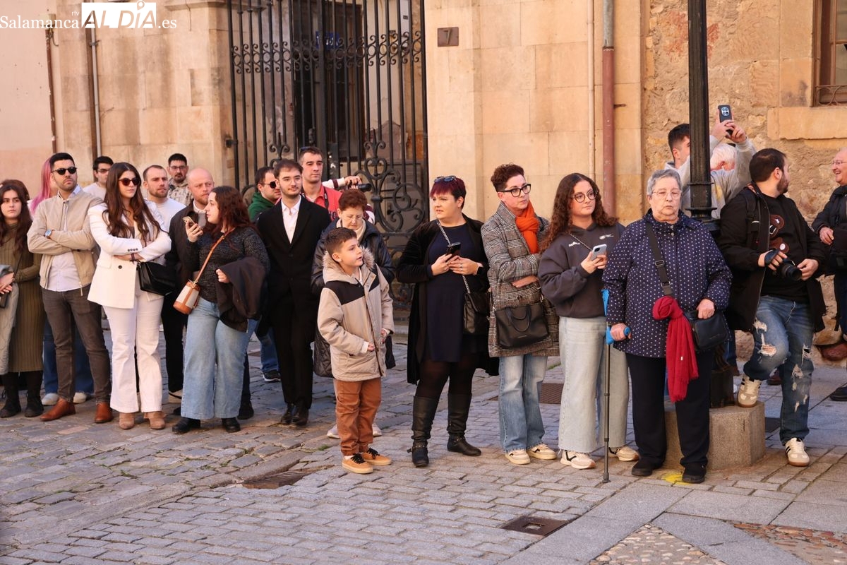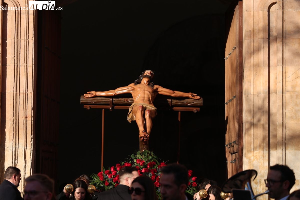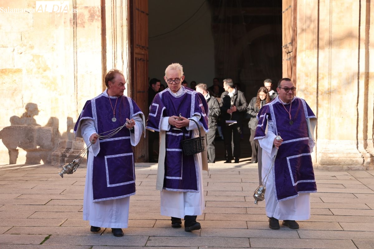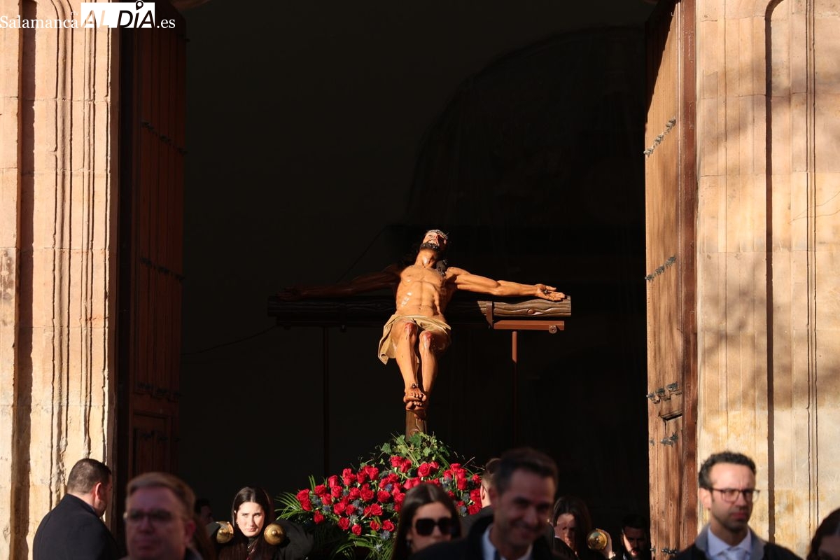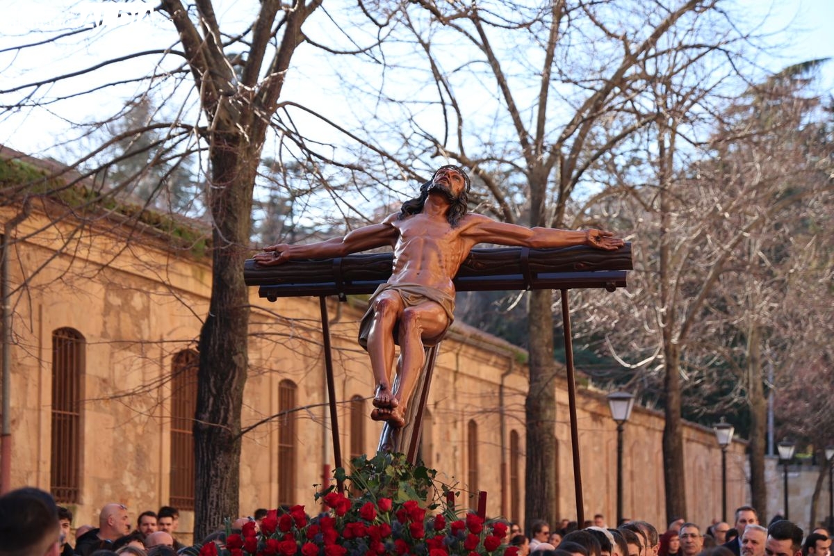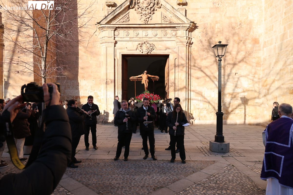 La procesión ha partido desde la iglesia del convento de las Úrsulas, sede canónica de la cofradía, para adentrarse en un itinerario de recogimiento por el centro de la ciudad. La talla, una obra destacada de la imaginería procesional salmantina realizada por Damián Villar en el año 1959, ha sido el foco de atención de los fieles y cofrades que se han congregado para acompañar el traslado.