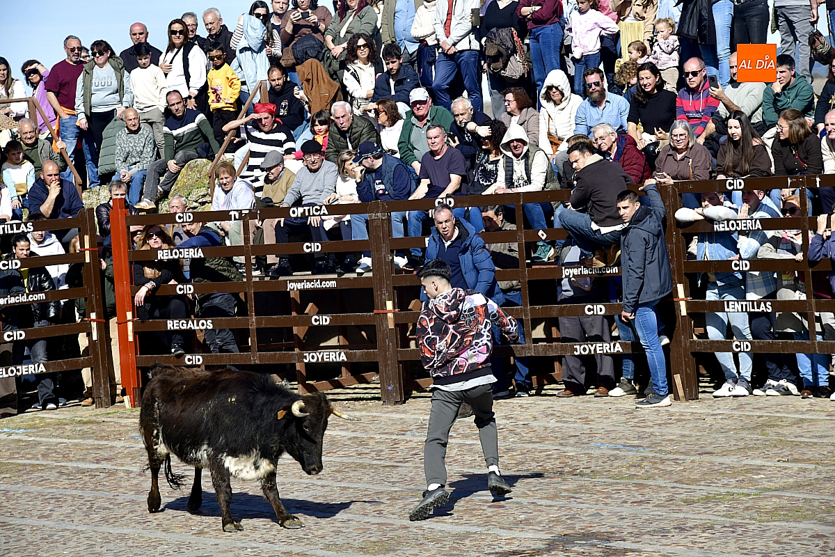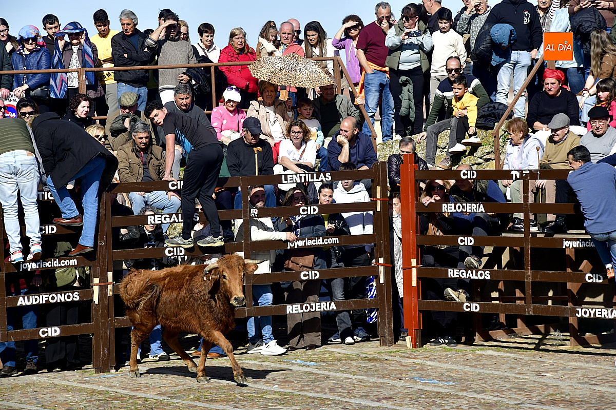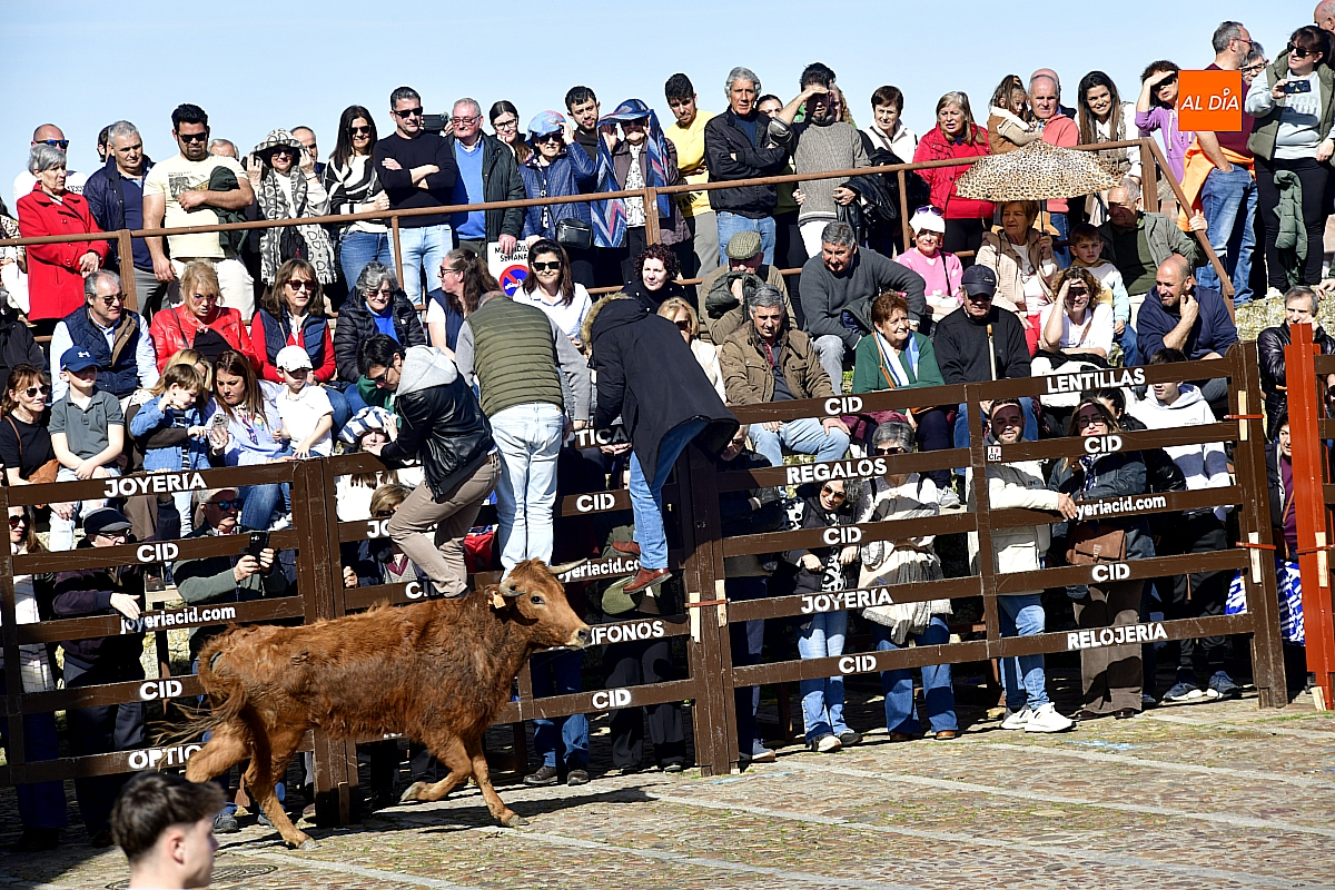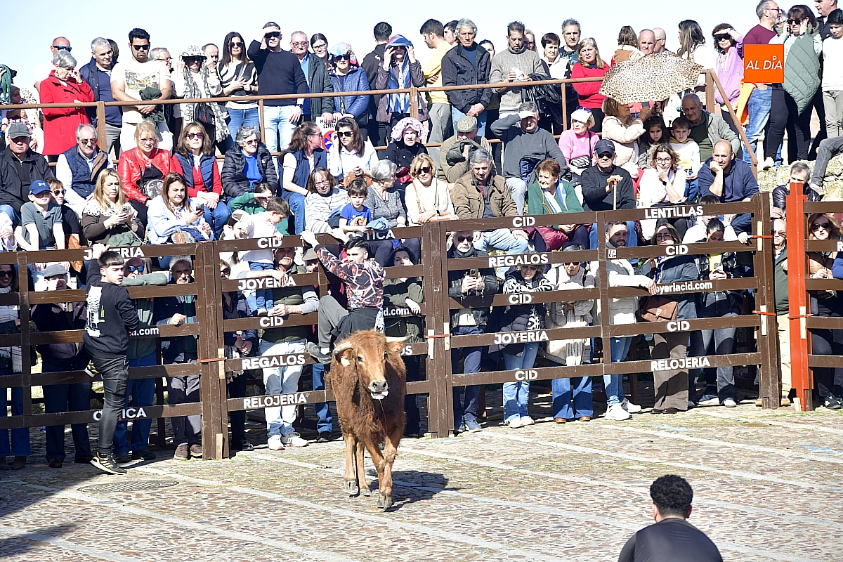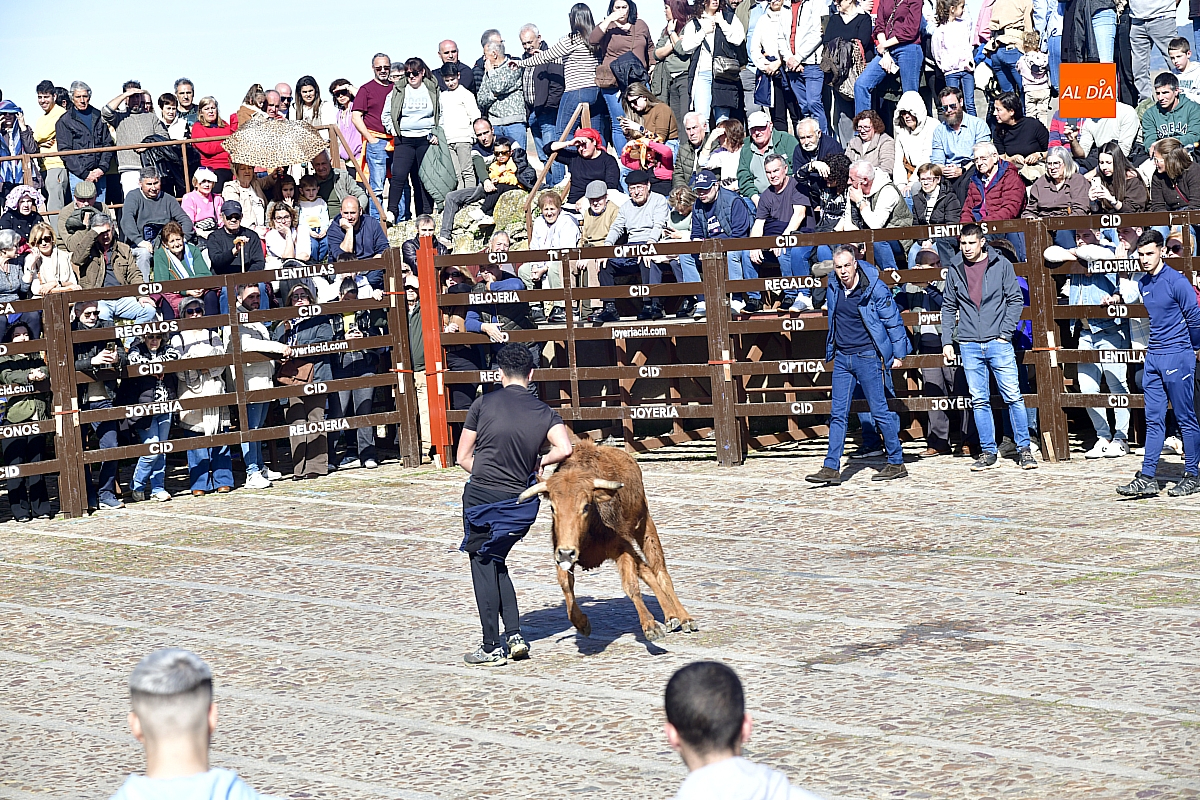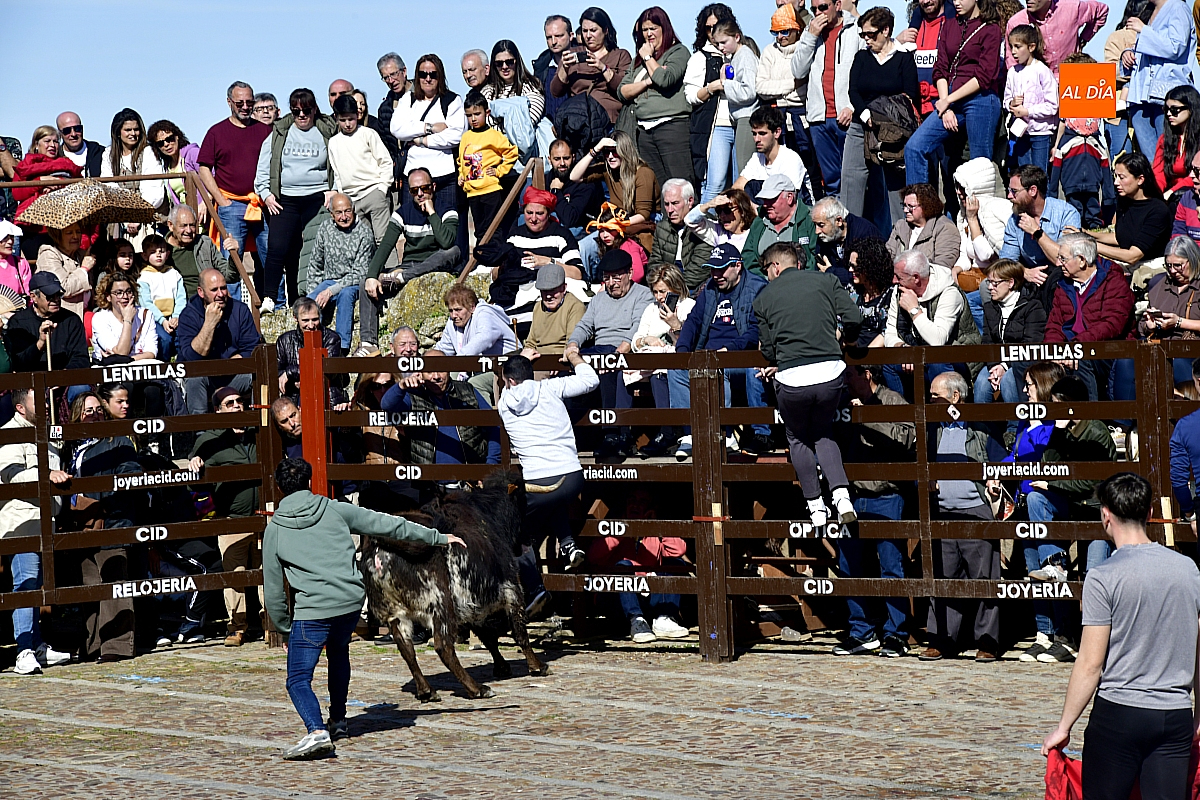 Los mirobrigenses disfrutaron de un espléndido día soleado en este enclave, convertido en escenario de una animada suelta de dos vaquillas procedentes de El Bodón, ganadería de Sänchez Herrero. Las reses ofrecieron un juego vivo y constante, recorriendo sin descanso el recinto empedrado y respondiendo con prontitud a las llamadas de los jóvenes participantes, muchos de ellos en sus primeros escarceos con el recorte. Para estos mozos, la capea constituye una suerte de rito iniciático: un espacio de aprendizaje donde se ensayan valor y técnica antes de aspirar, en años venideros, a enfrentarse a los toros de mayor porte que protagonizan las jornadas centrales del Carnaval.