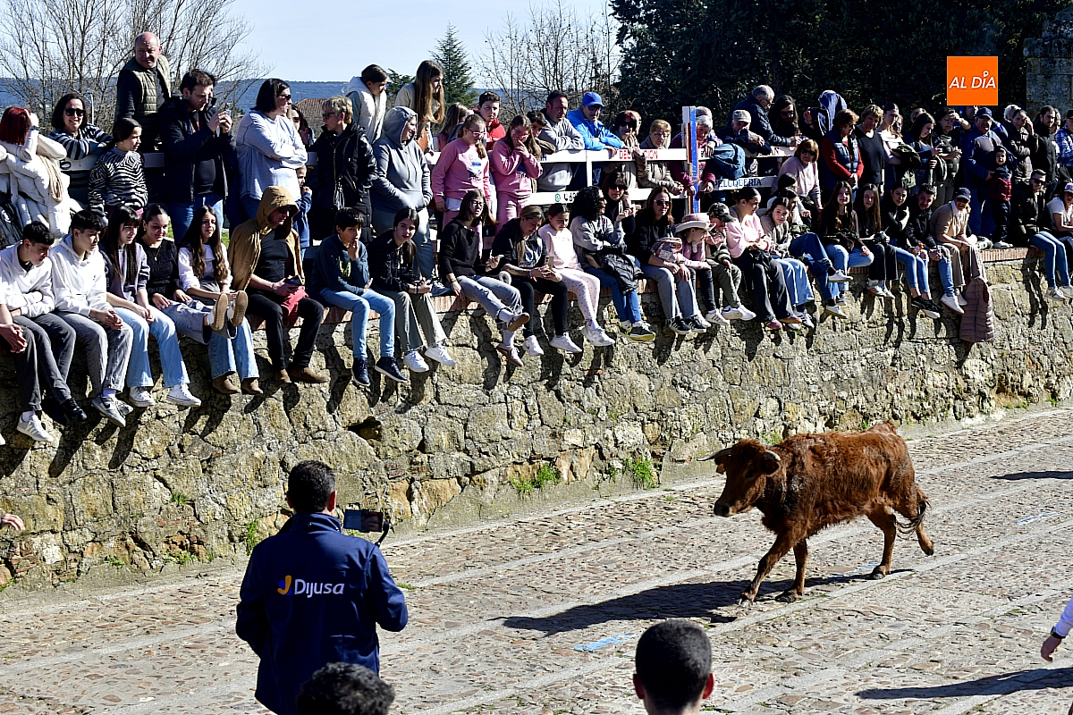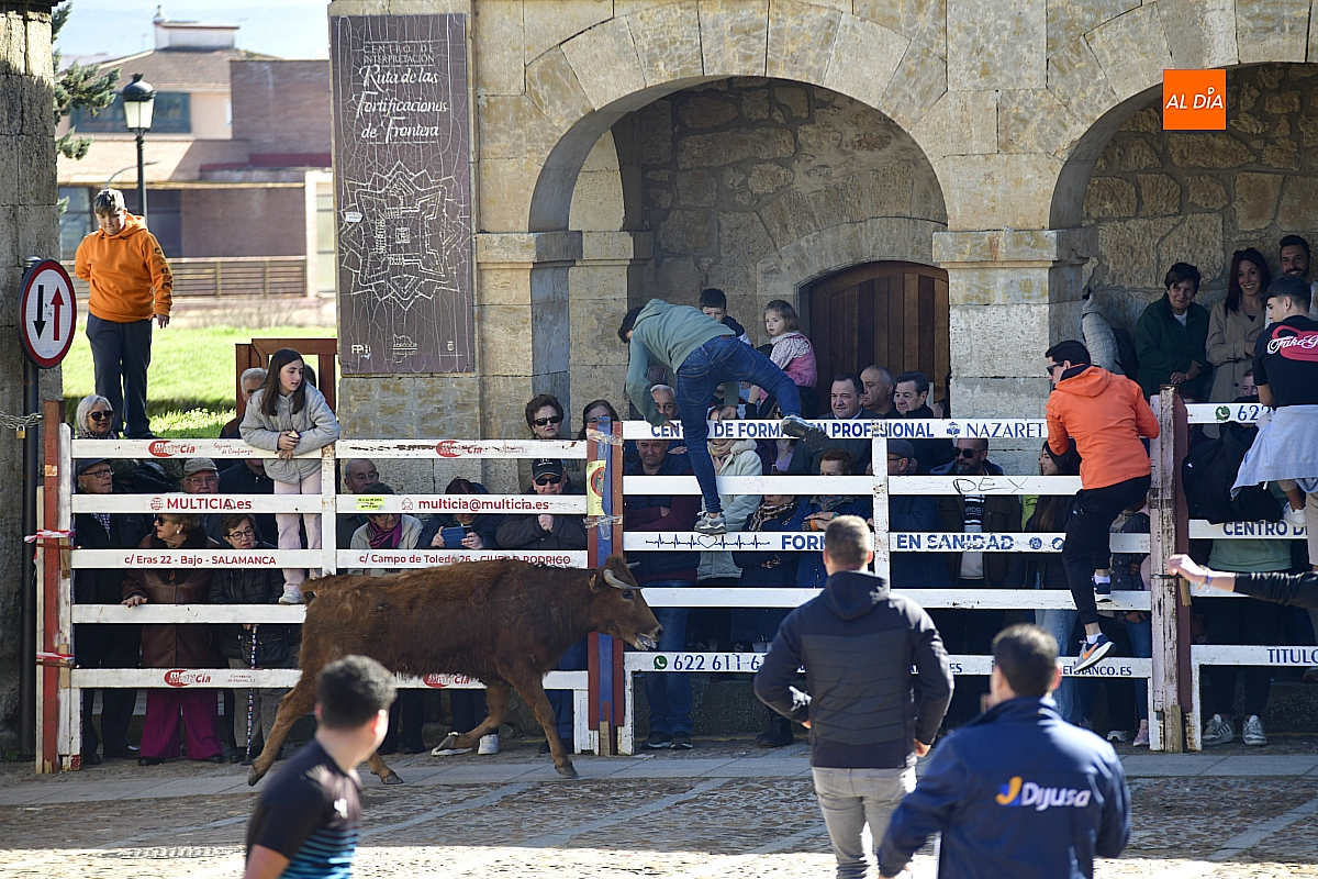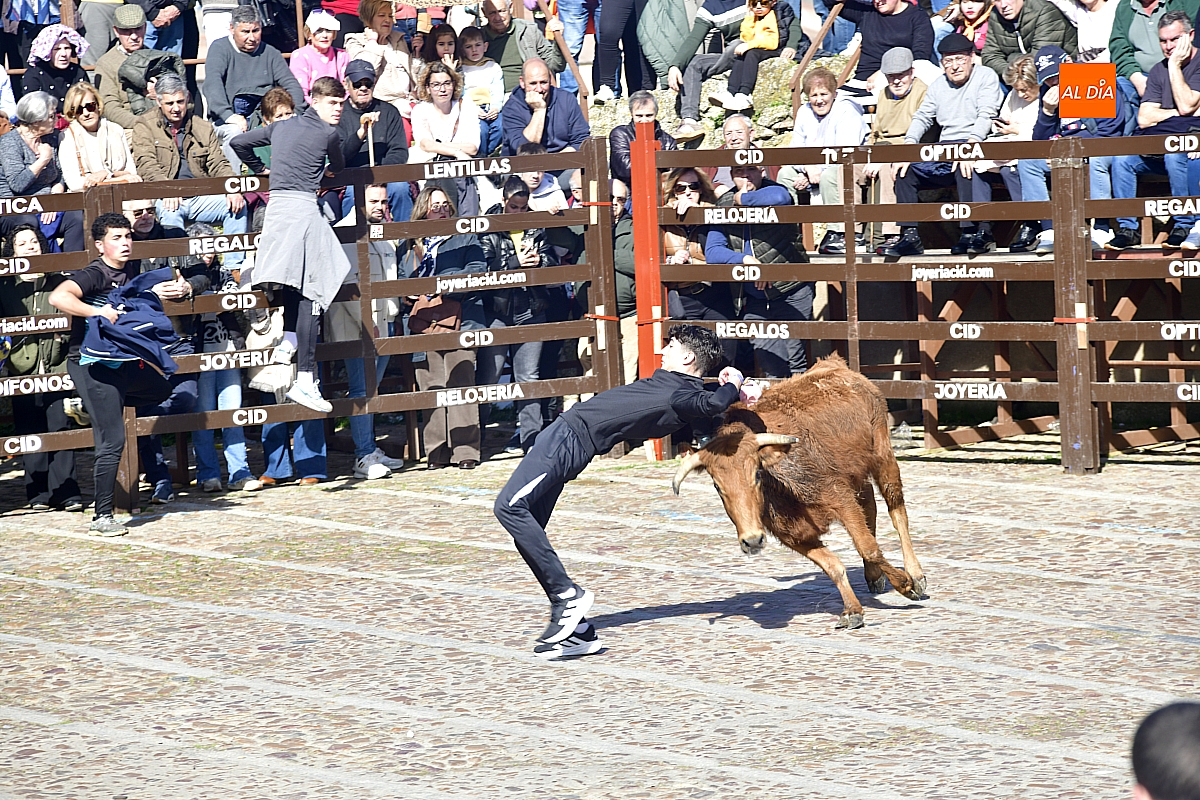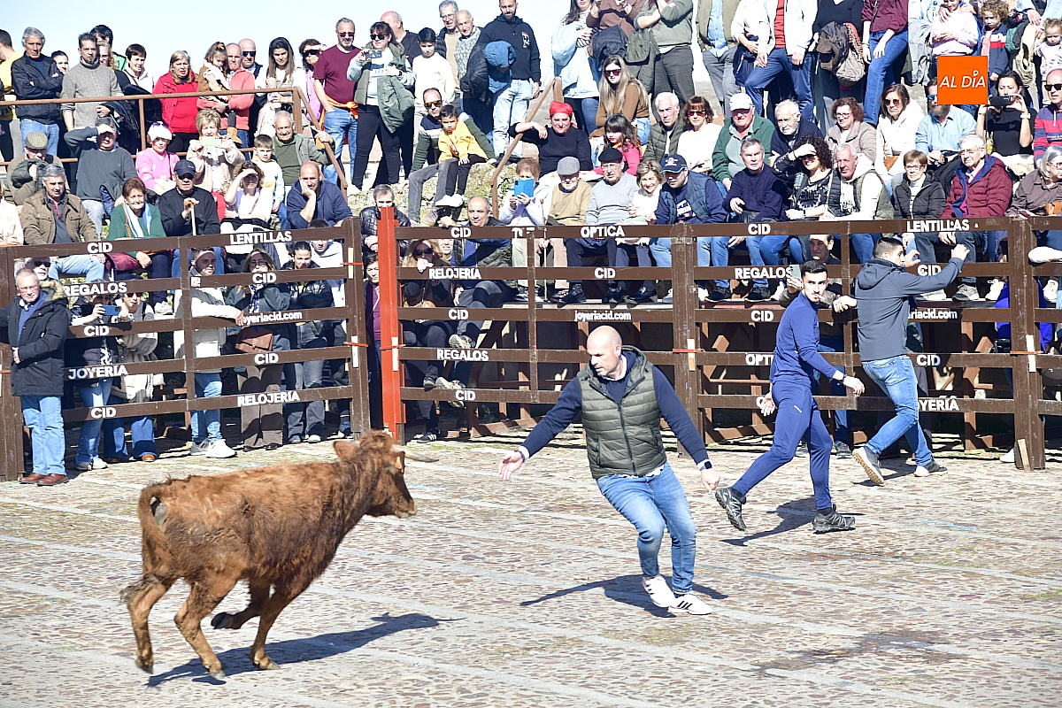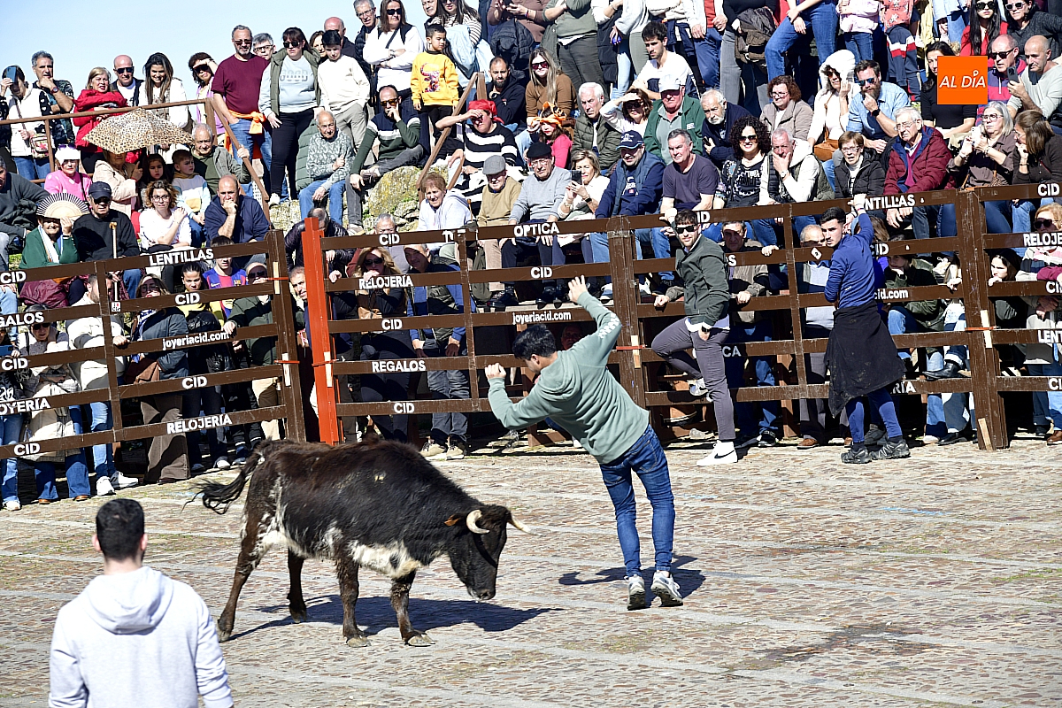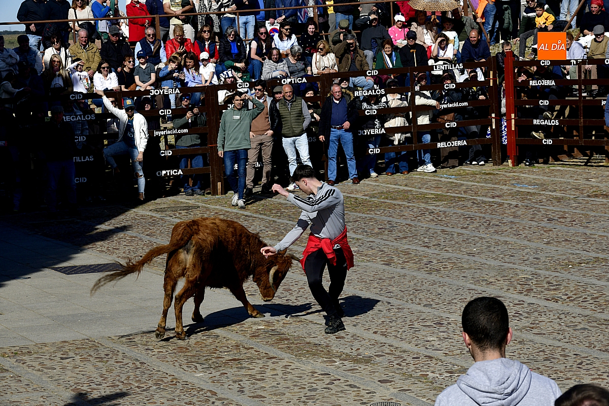 Los mirobrigenses disfrutaron de un espléndido día soleado en este enclave, convertido en escenario de una animada suelta de dos vaquillas procedentes de El Bodón, ganadería de Sänchez Herrero. Las reses ofrecieron un juego vivo y constante, recorriendo sin descanso el recinto empedrado y respondiendo con prontitud a las llamadas de los jóvenes participantes, muchos de ellos en sus primeros escarceos con el recorte. Para estos mozos, la capea constituye una suerte de rito iniciático: un espacio de aprendizaje donde se ensayan valor y técnica antes de aspirar, en años venideros, a enfrentarse a los toros de mayor porte que protagonizan las jornadas centrales del Carnaval.