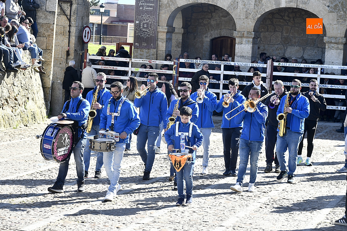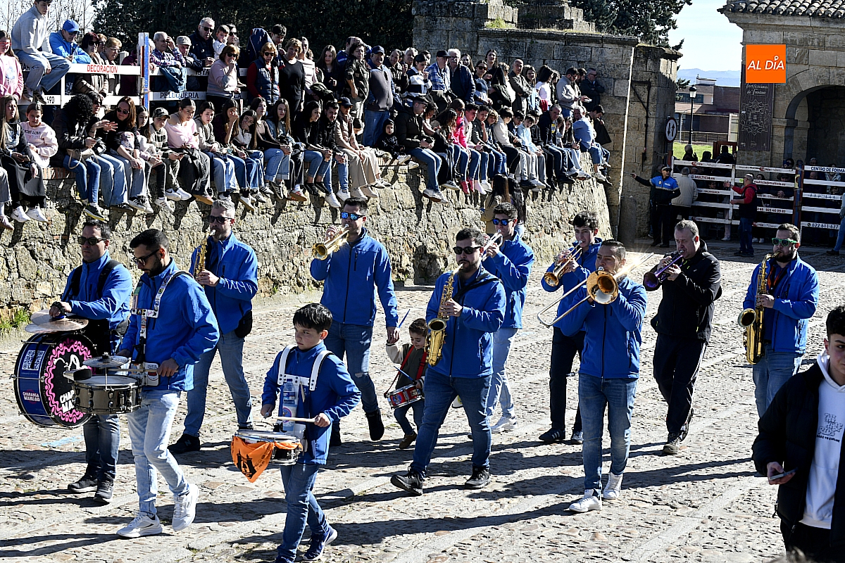 La cita, prevista para el mediodía, había congregado público desde una hora antes. Familias y peñas enteras ocuparon los mejores lugares del recinto, aprovechando el sol tras meses de lluvias persistentes que, con relativa indulgencia, permitieron el desarrollo de las celebraciones carnavalescas en Ciudad Rodrigo. La charanga 'Manliao' aportó la banda sonora festiva, mezclando pasodobles y ritmos populares que reforzaron el ambiente de comunidad y despedida.